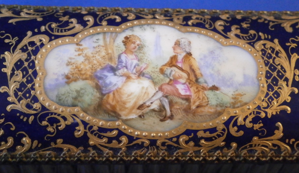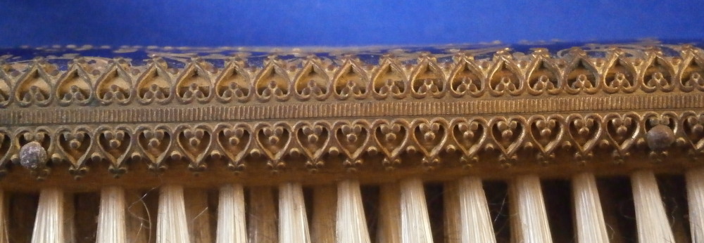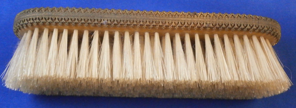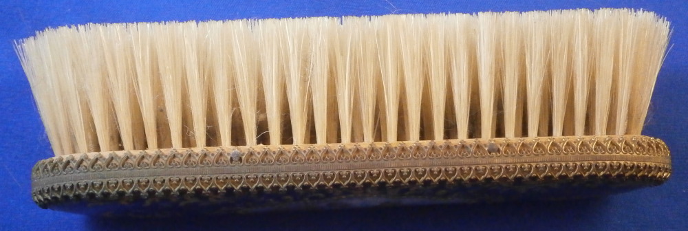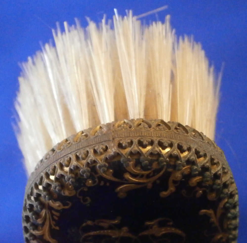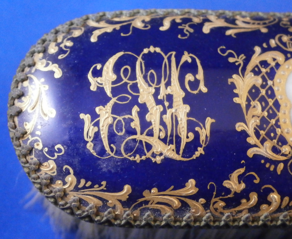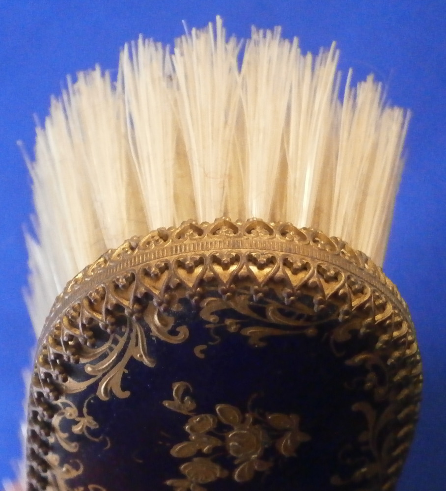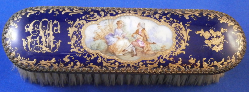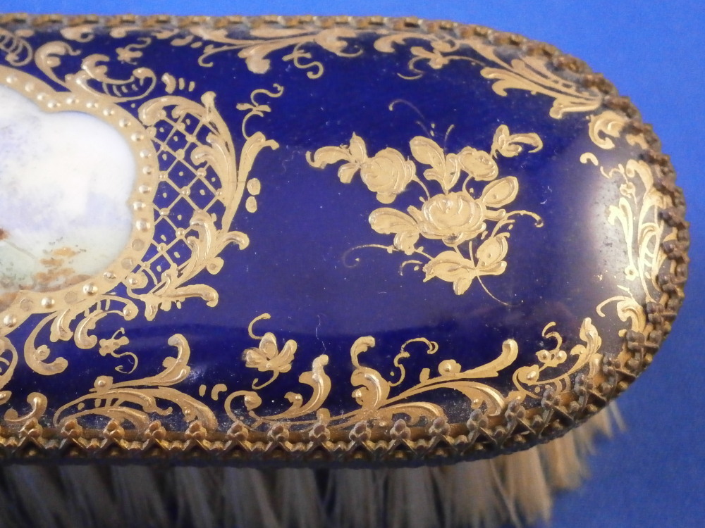 This is a really superb clothes brush with the main body made of porcelain hand painted most likely in the Dresden area of Germany and from around the late 19th century. Lamm or Wehsney come to mind but it could be another one of the makers from this region. Part of a vanity set I assume. This is a long, narrow brush that was once used to brush dirt and lint off of clothing after a day out on the town. The porcelain is hand painted with a superb cobalt blue ground with lots of gilding to it with raised highlights but the best part is the Watteau style scene of a couple in a landscape surrounding. Hand painted very nicely. The cobalt blue and gold combo does not get any better in the world of porcelain and the detail here is top notch! Never seen a better one. The porcelain part is attached to a wooden part with the seam hidden by a nice brass (I think) decorative trim attached with tiny nails. The brushes are attached to the wooden part. The piece is in perfect condition with the brass seam being a bit dicolored but that could be polished if need be quite easily. It displays perfectly! No visible maker's mark. Monogramm in gold which I think is ELA on the top left. The brush is 5.375 inches long and 1.62 inches wide. A really nice piece and not something one sees often at all especially this nicely done. I also own the matching larger one in this shape and a hair brush as well as a hand mirror which will also be listed. Please email me for more information or other pictures.