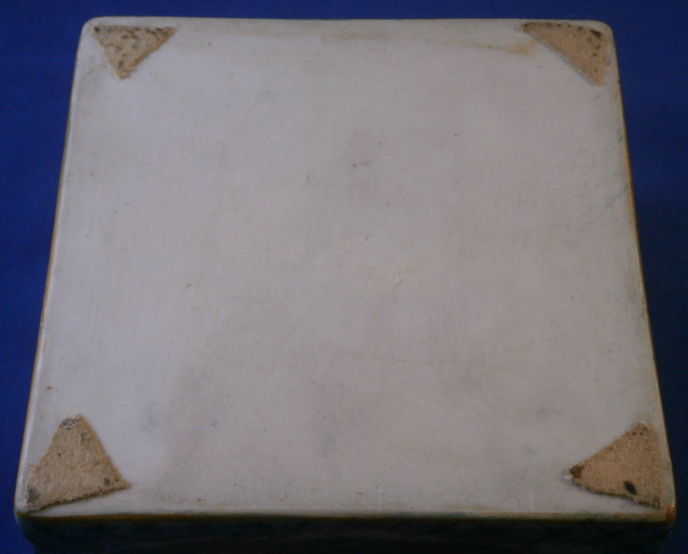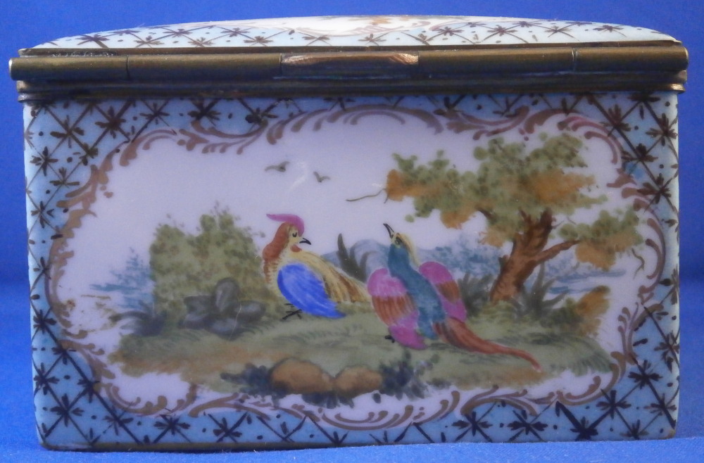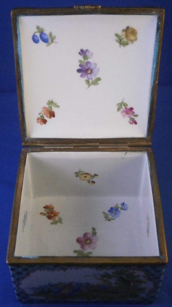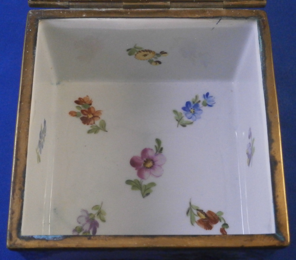 This is a superb good sized scenic box made more than likely by a Dresden area maker in the later 19th century or early 20th century. It is square in shape and has a large scene to the top of some chicken in front of a stone column in a landscape surrounding. A fun turquoise ground and trim all around the scene with a neat design over that and a gold trim towards the scene.The front side and back side of the main body also have a bird scene to it with the same trim around them and each side has a floral arrangement to it with more of the same trim. All hand painted very nicely!. The inside of the box has scattered single flowers all over it and the mounts are more than likely brass have have a decorative shell design to the front. The underside of the box is not decorated nor is it marked. The box closes nicely and stays shut. It is in great condition with just some oxidation to the mounts. Looks great and is big enough to be able to use it for all sorts of things. Someone added soft pads to the bottom to it as to not scratch the furniture! The box is 2.5 inches tall and 4 inches on all sides. Please email me for more information or other pictures.