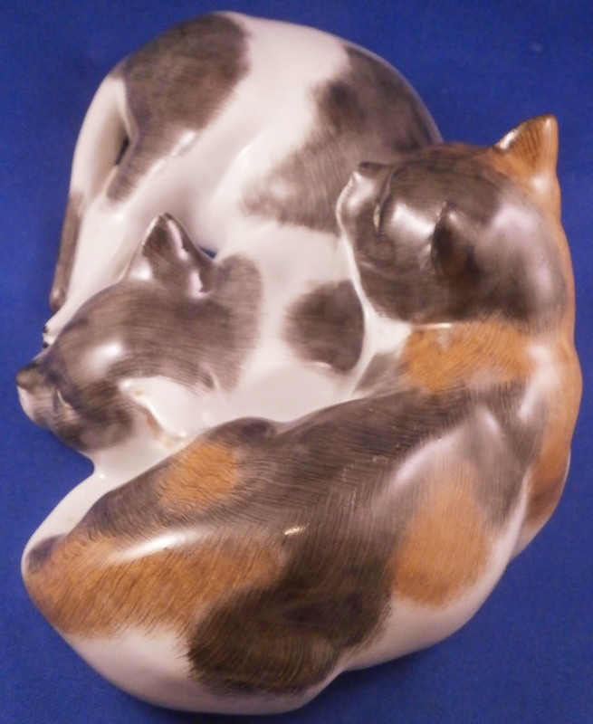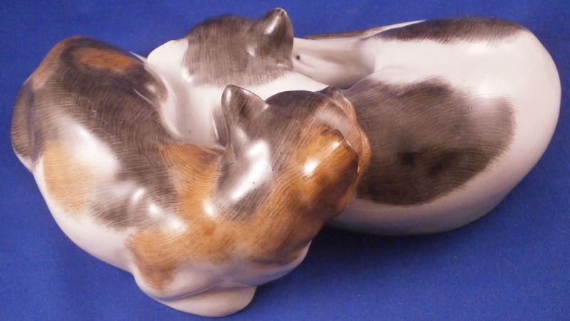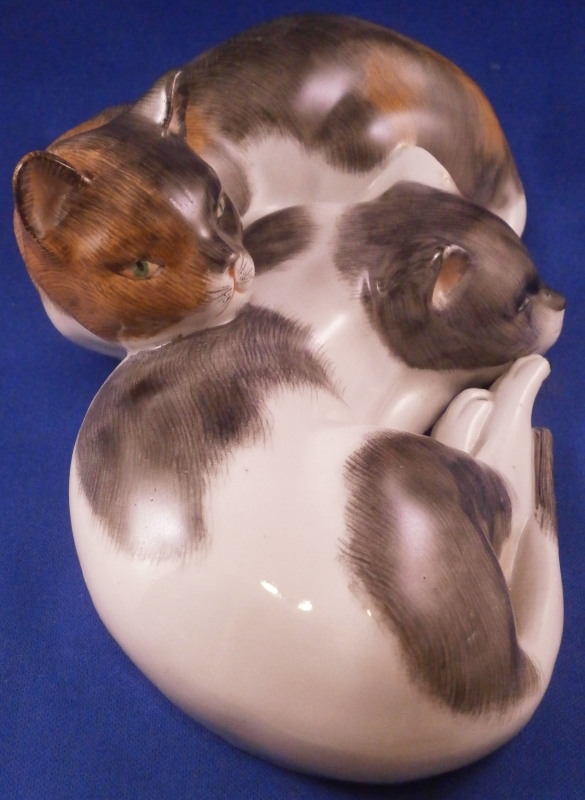 This is a cute porcelain cat figurine made by the Potschappel factory of Carl Thieme in Dresden in the early 20th century. It is of two cats - one black and white while the other is a calico which is gorgeous! This is one of the best animal pieces they made! The figure is well modeled and superbly hand painted. The figurine is in superb condition with just a touch of wear but displays perfectly. It is marked underneath with the PS script mark with Dresden underneath in blue. The piece is 2.625 inches tall, 4.625 inches deep and 7.125 inches wide. Please email me for more information or photos.