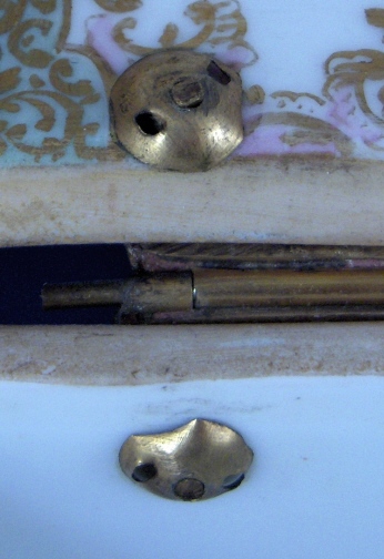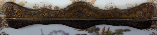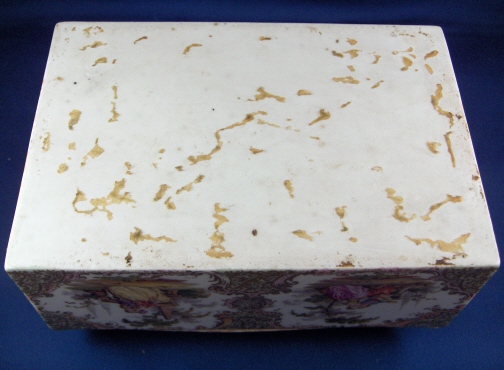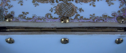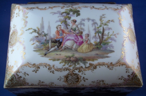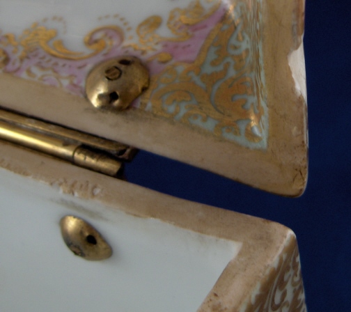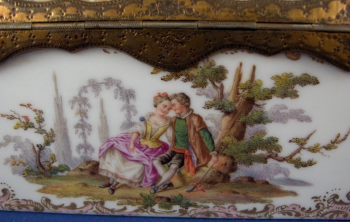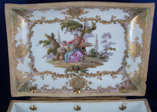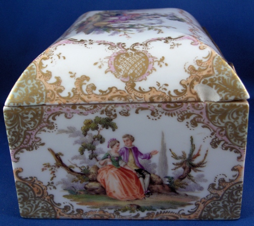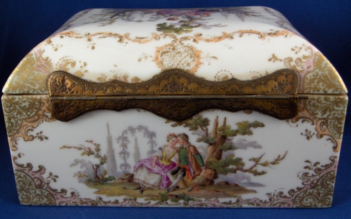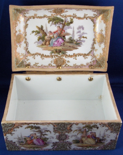 This is a superb large scenic box made by a Dresden area maker in the mid to late 19th century. It has several large and detailed scenes on it of mostly couples in a superb landscape surrounding with some nice scroll work in pink, orange and green with gold highlights all around. The hinges are bronze or brass and still attached the old way with metal rods piercing through the porcelain. These were done by heating the metal and 'melting' them through the porcelain kind of like staple repairs were done back then! The box is in great condition with a chip to the right side lid edge towards the back and some wear to the gilding on the lid from being handled over the years. It is not marked underneath and the yellow residue you see in the underside picture is from old glue and does come off - likely someone added a soft cloth bottom to it as to not scratch the furniture! The scenes are of very good quality and it was certainly made by one of the better Dresden area makers. The box is 3.75 inches tall, 7.125 inches wide and 4.875 inches deep. Please email me for more information or other pictures.