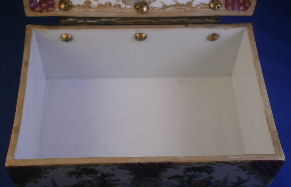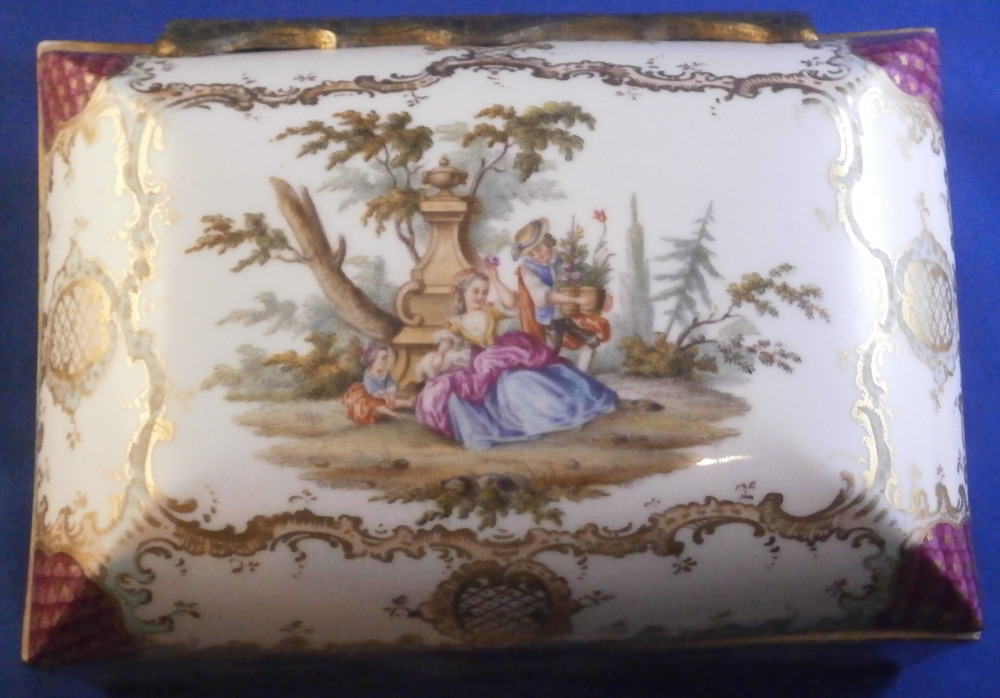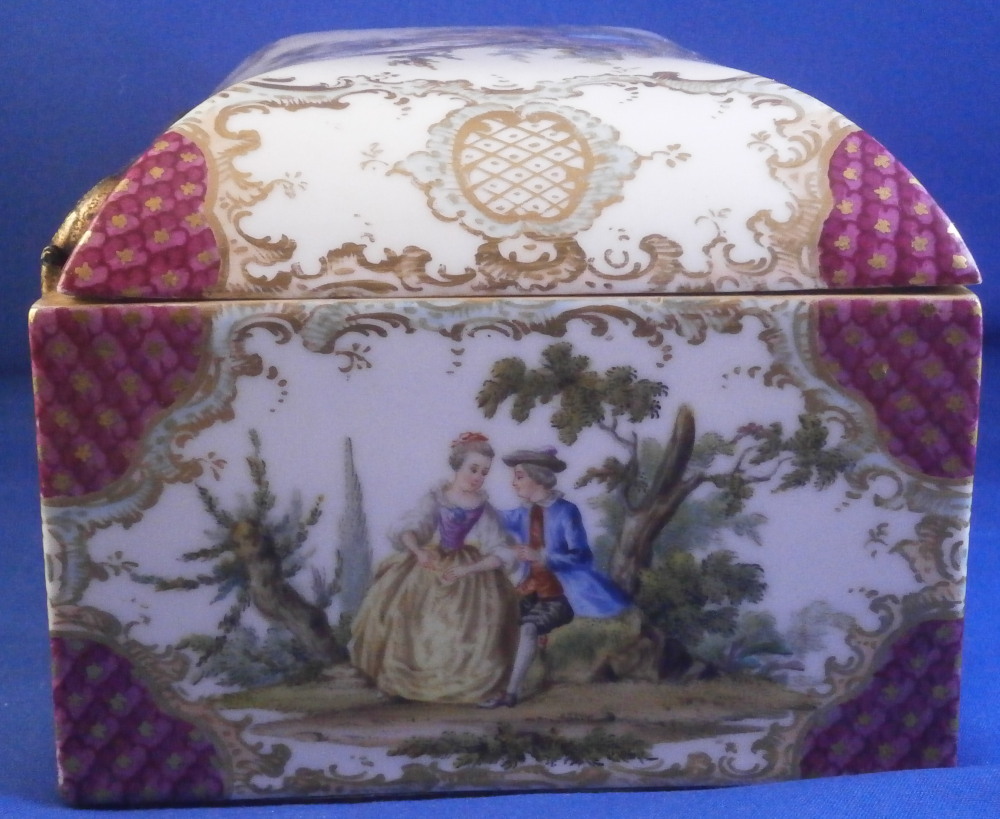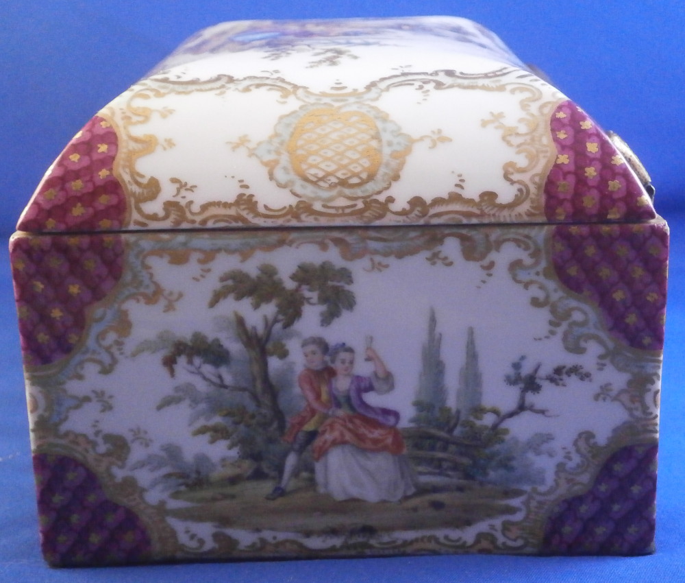 This is a superb and large scenic box made by a Dresden area maker in the mid to late 19th century. It has several large and detailed scenes on it of mostly couples in a superb landscape surroundings with some nice scroll work in light pink and light green with gold scrolls and a nice puce and gold design to the corners and center of the front as well. The hinges are probably brass and still attached the old way with metal rods piercing through the porcelain. The front has two scenes to it and the rest of the sides as well as top and inside top have a larger single scene to it. The scenes are all hand painted and of very nice quality! The box is in great condition with a minor touch of wear to the gilding and a single hairline to the front left corner as show from the outside and inside. Not obvious when on display and the peice looks amazing! It is not marked underneath but I am sure it is German most likely from the Dresden area during the mid to late 19th century. Someone added a soft material to the edges of the underside as to not scratch the surface of a piece of furniture. The box is 3.75 inches tall, 7 inches wide and 4.875 inches deep. Please email me for more information or other pictures.