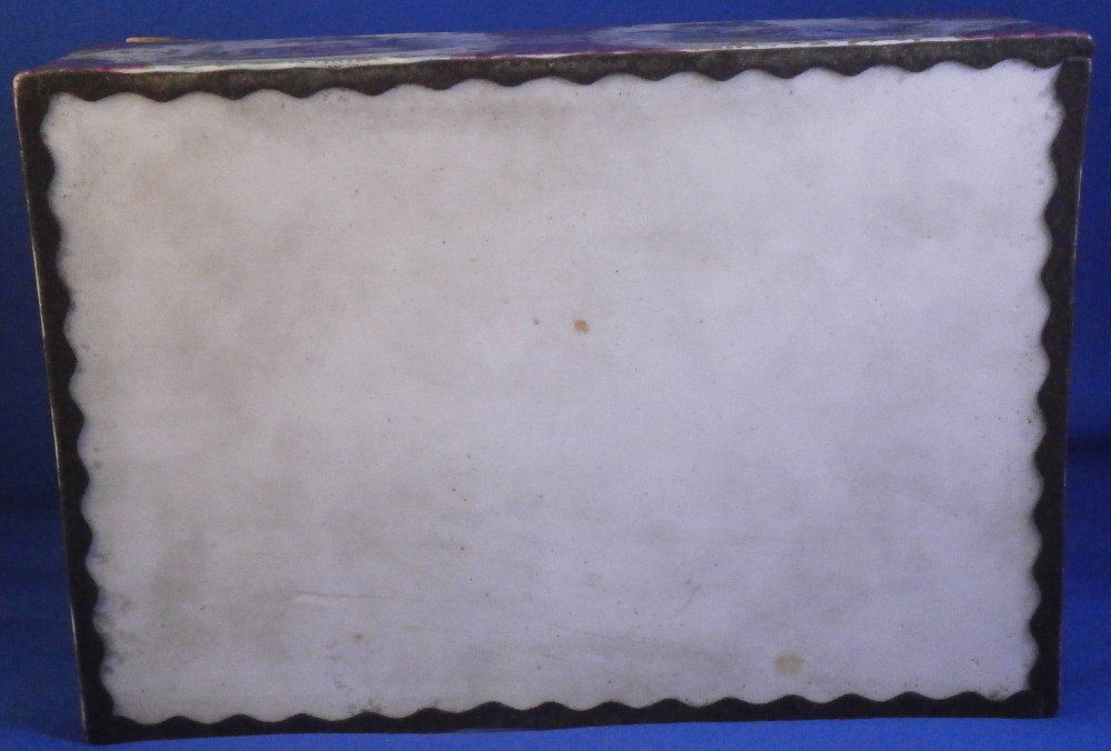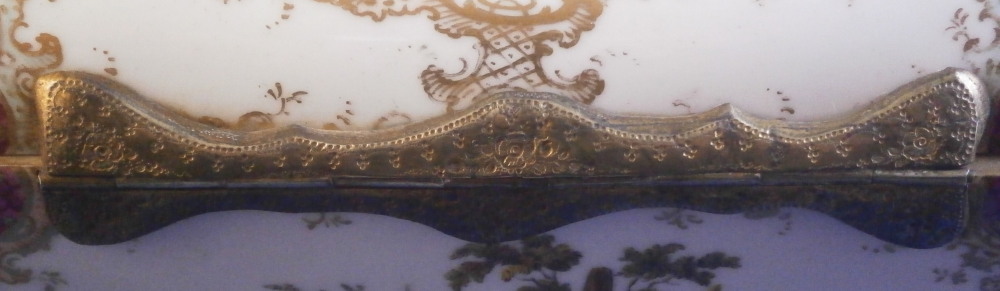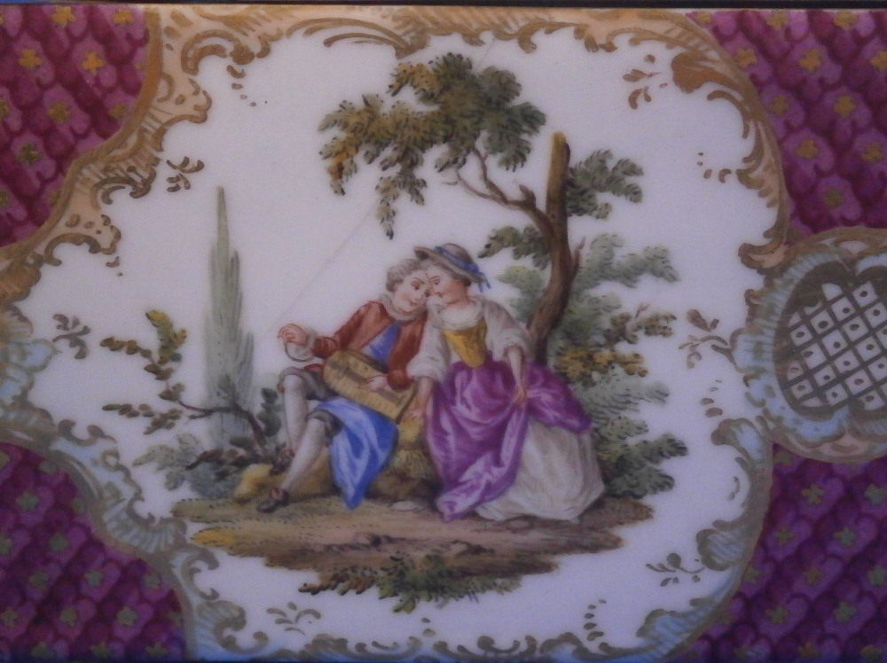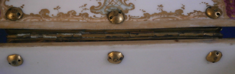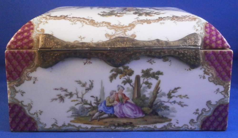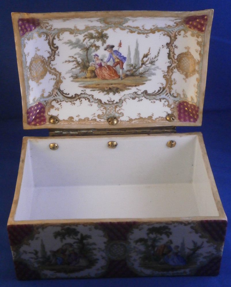 This is a superb and large scenic box made by a Dresden area maker in the mid to late 19th century. It has several large and detailed scenes on it of mostly couples in a superb landscape surroundings with some nice scroll work in light pink and light green with gold scrolls and a nice puce and gold design to the corners and center of the front as well. The hinges are probably brass and still attached the old way with metal rods piercing through the porcelain. The front has two scenes to it and the rest of the sides as well as top and inside top have a larger single scene to it. The scenes are all hand painted and of very nice quality! The box is in great condition with a minor touch of wear to the gilding and a single hairline to the front left corner as show from the outside and inside. Not obvious when on display and the peice looks amazing! It is not marked underneath but I am sure it is German most likely from the Dresden area during the mid to late 19th century. Someone added a soft material to the edges of the underside as to not scratch the surface of a piece of furniture. The box is 3.75 inches tall, 7 inches wide and 4.875 inches deep. Please email me for more information or other pictures.