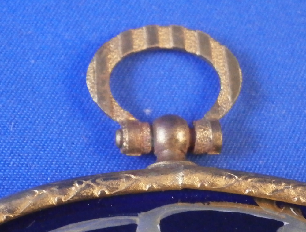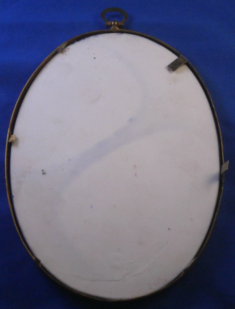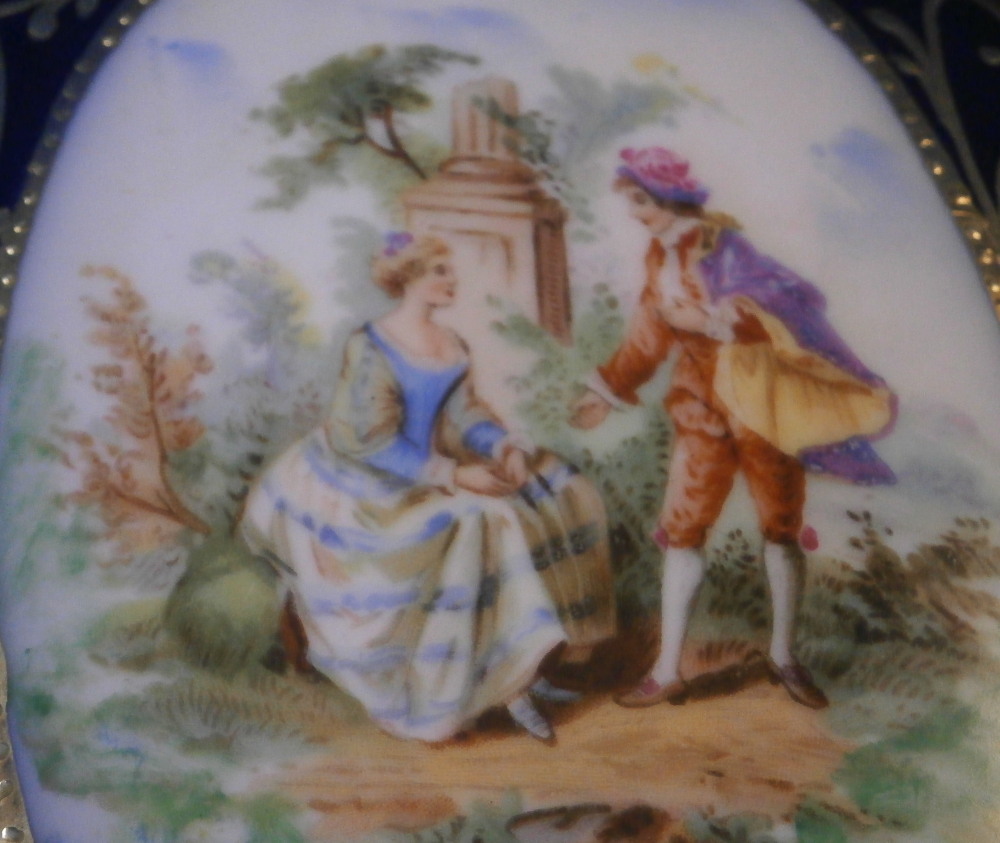 This is a nice, good sized porcelain plaque likely made in the Dresden area of Germany and from around the late 19th century. It is oval in shape and the center has a nice scene hand painted on it of a couple in front of a column in a landscape surrounding with a nice wide cobalt blue ring around the outside with gilding to it, some of which is raised. It comes in a brass frame with a hanger attached for easy display on a wall. A nice looking piece typical of this area and as an added bonush I have a matching second one I will also list on the site if anyone is interested in a pair! The porcelain piece is in perfect condition but the frame is showing a bit of its age and some of the pieces holding the plaque in place are broken or missing. The plaque is not marked as to a maker but this style and the colors are quite typical of this area. The entire piece is 7 inches tall, 5.125 inches wide and 0.375 inches thick, The circular piece up top sticks out about 0.75 inches at the top. Please email me for more information or other pictures.