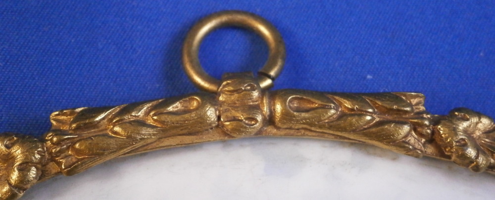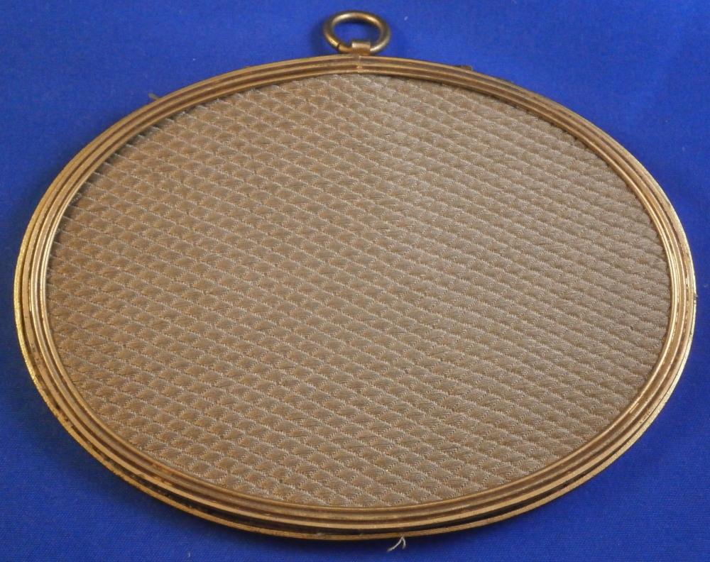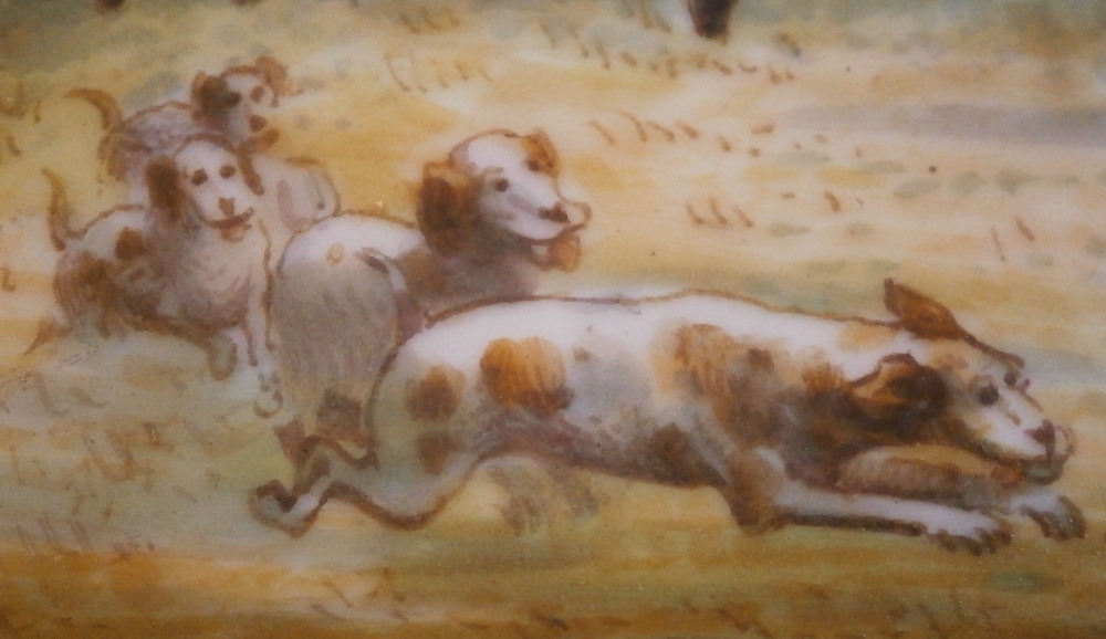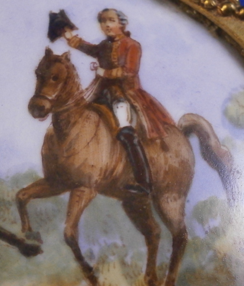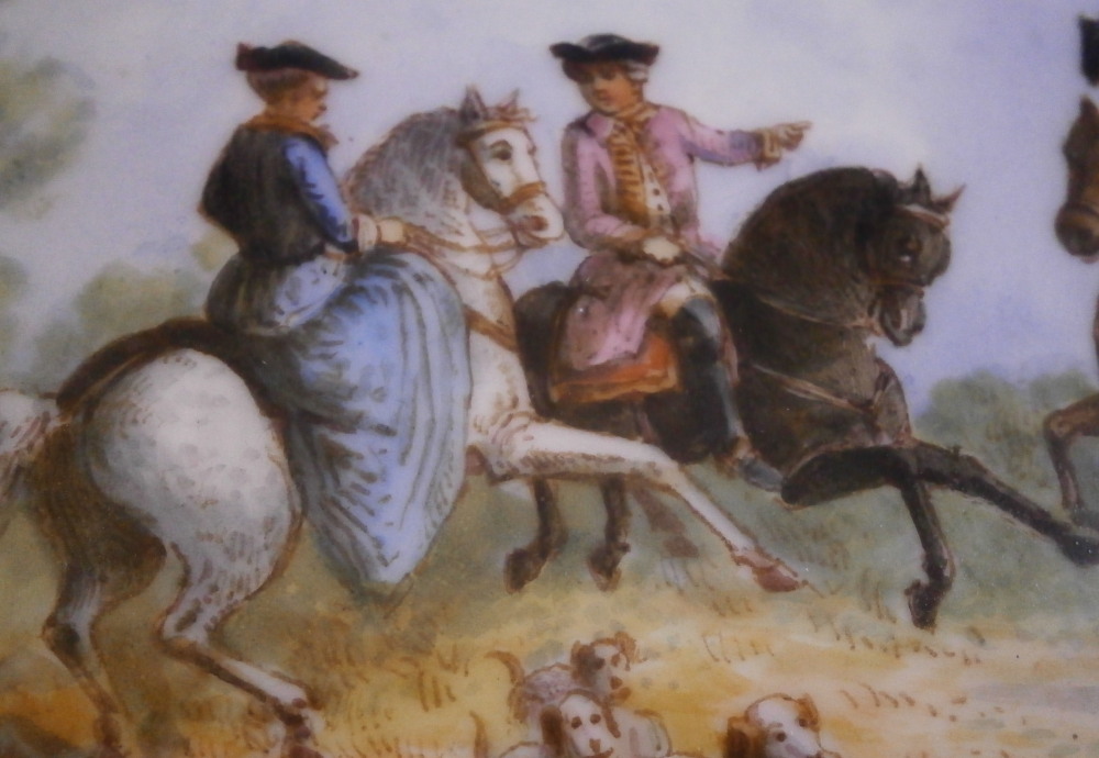 This is a really nice plaque made most likely by one of the Dresden area makers in Germany in the 19th century. The scene is of a set of three people riding their horses with three dogs in front in a nice landscape surrounding. There is a lady to the left and two gentleman. All hand painted and of very nice quality with lots of detail. Brass metal frame with a nice design to the top and a ring for hanging it. Signed in black on the bottom right edge as shown. Cannot make it out. The plaque is in perfect condition and the frame is in great condition as well. The entire piece is 5.125 inches wide and 4 inches high plus the ring which adds another 0.5 inches. Not sure if the plaque is marked I did not try to take that metal frame apart. This piece matches the other plaque I have on the site if anyone is interested in a rare pair. Please email me for more information or other pictures.