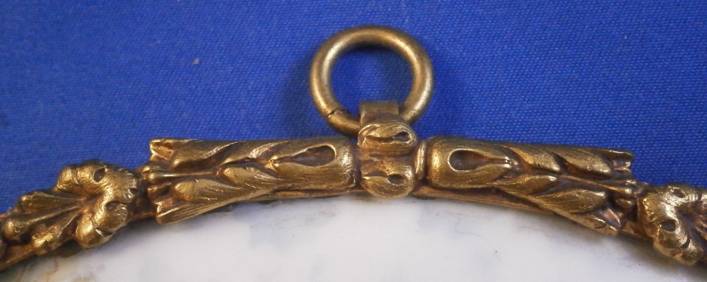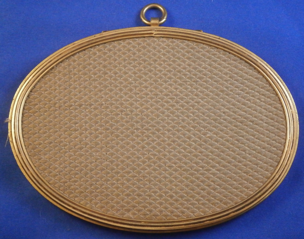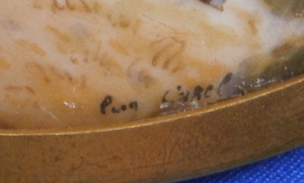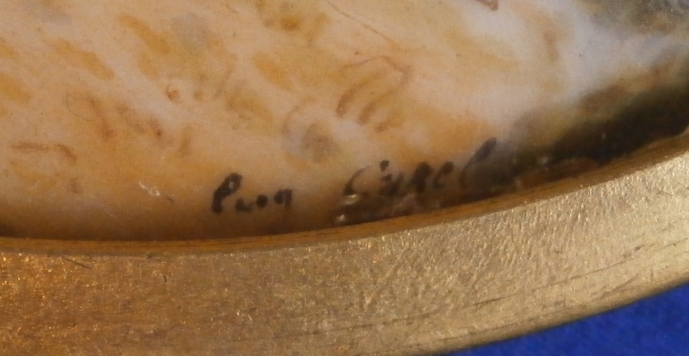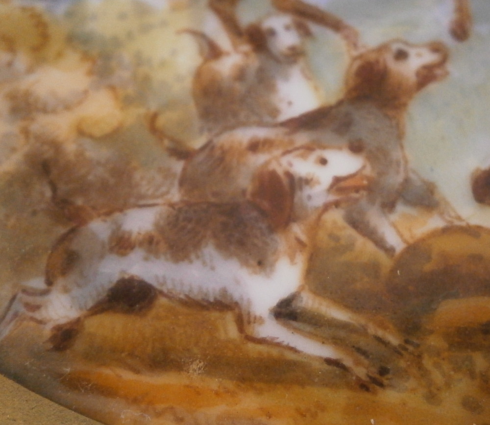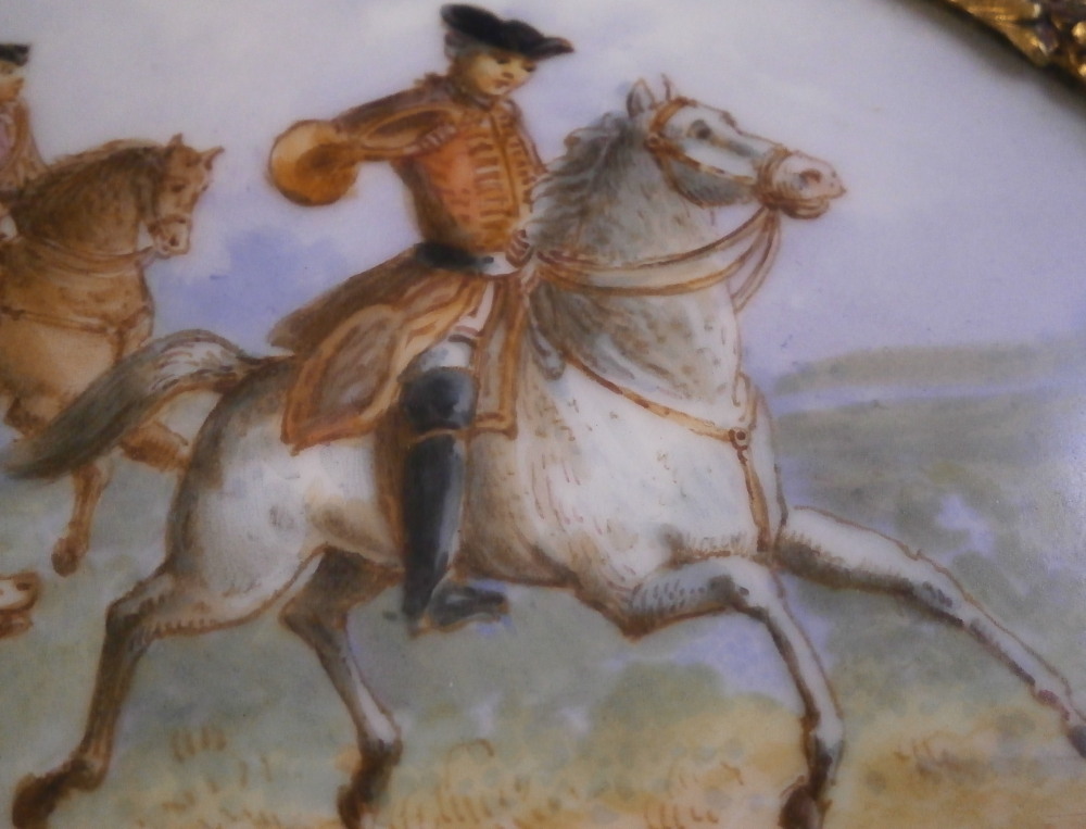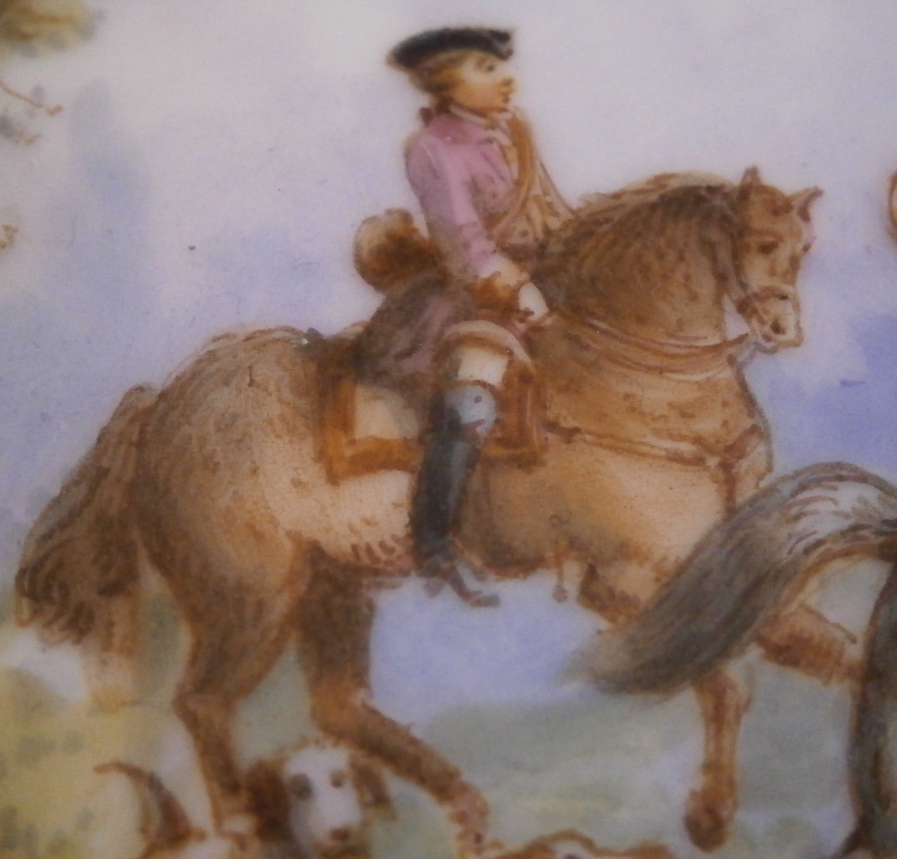 This is a really nice plaque made most likely by one of the Dresden area makers in Germany in the 19th century. The scene is of a pair of hunters riding their horses with three dogs by their side in a nice landscape surrounding. The hunter in the front is holding a hunting horn. All hand painted and of very nice quality with lots of detail. Brass metal frame with a nice design to the top and a ring for hanging it. Signed in black on the bottom right edge as shown. Cannot make it out. The plaque is in perfect condition and the frame is in great condition as well. The entire piece is 5.125 inches wide and 3.875 inches high plus the ring which adds another 0.5 inches. Not sure if the plaque is marked I did not try to take that metal frame apart. Please email me for more information or other pictures.