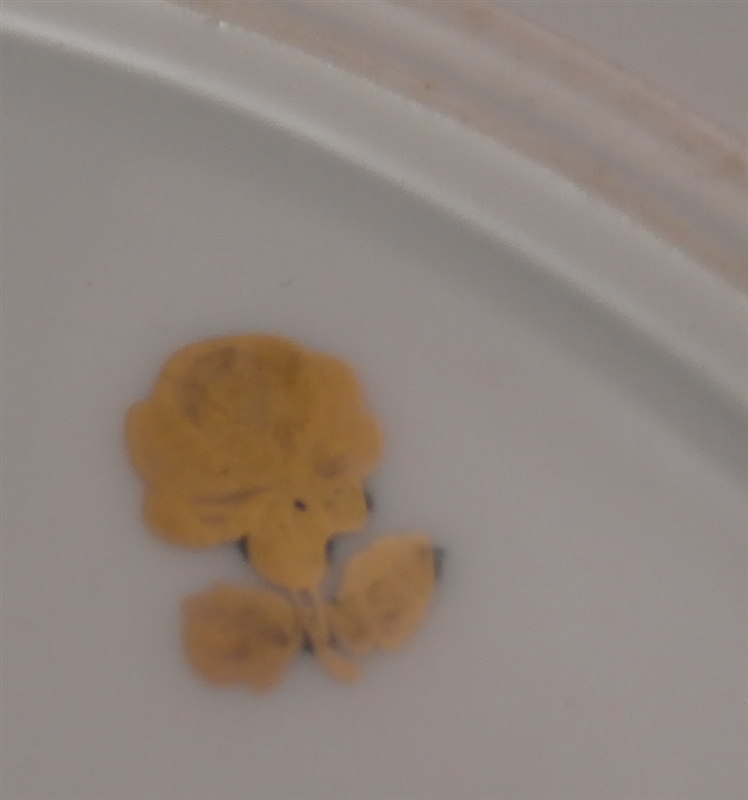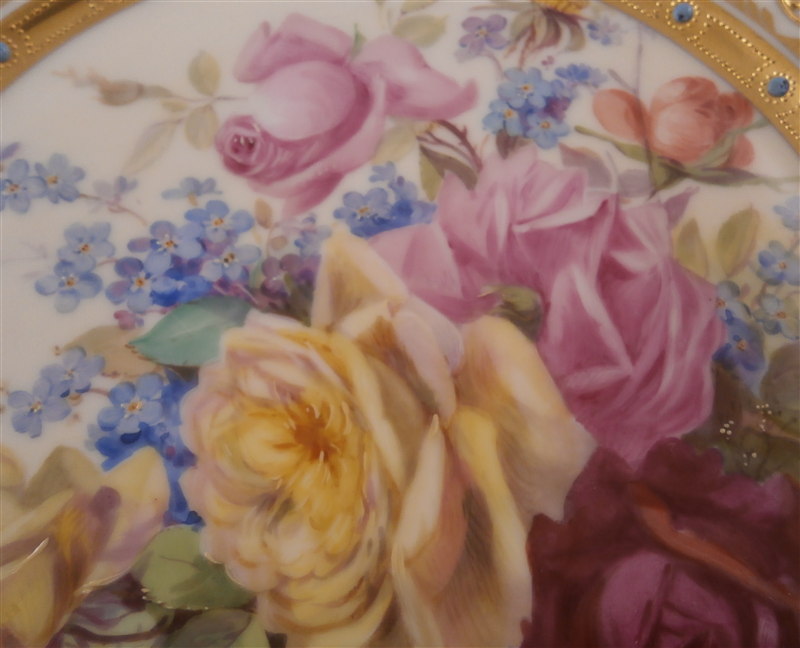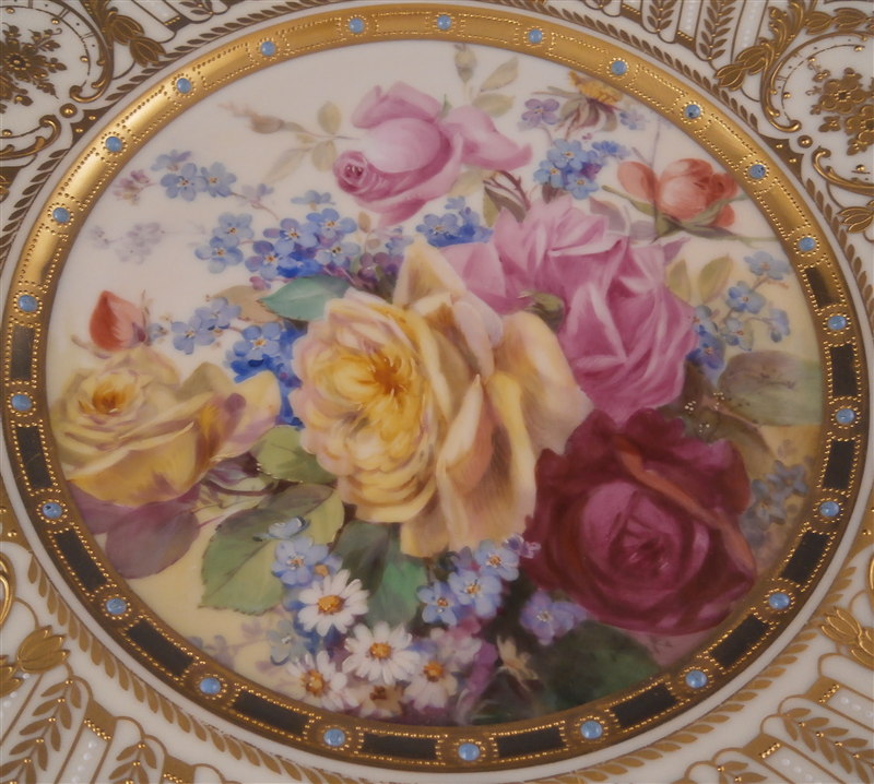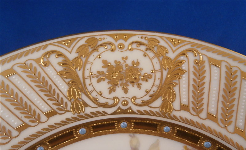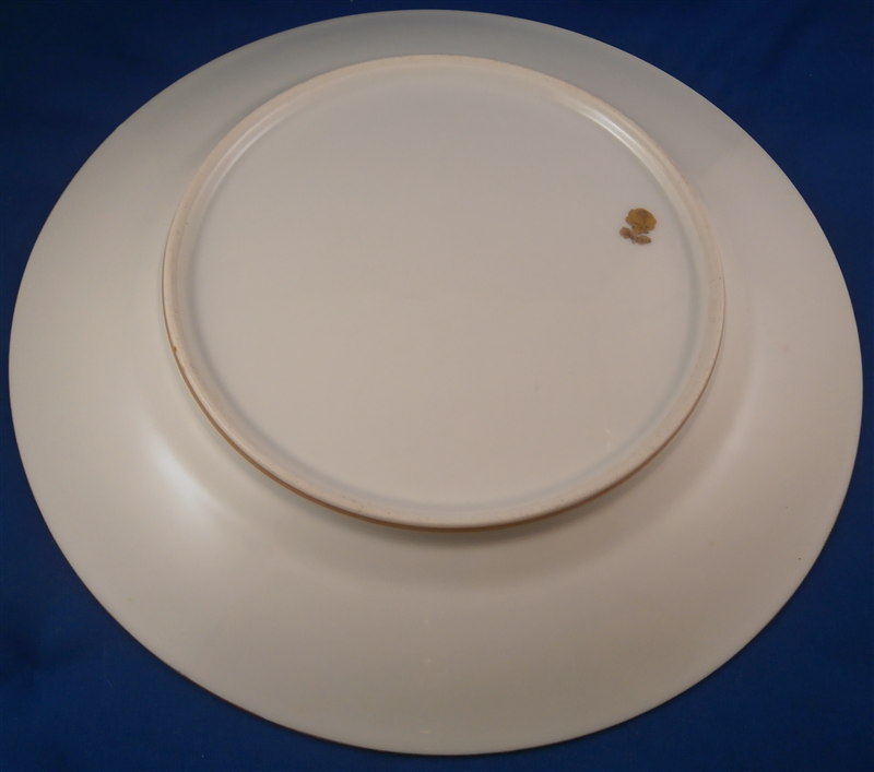This is a superb plate made by one of the Dresden decorating studios in the early 20th century. It is handpainted with a fantastic floral scene in the center of a truly good quality as well as a fancy gold trim with some raised "jewels" in the mix. Turquoise ones around the well and little white raised dots along the rim within the gold trim. Lots of the gold trim is raised as well to make this one elegant plate! A stunning and decorative plate by an unknown studio which is a bit strange since I would think they would want to advertise this piece as theirs. Who knows the reasons!? It is marked with the blanc producers name Silesia which was covered up by a gold rose - a common practice for the decorating studios! The piece is in great condition with a little wear to the gilding along the rim as well as a few missing tiny white jewels in a spot or two. It displays superbly. The plate is 1.125 inches tall and 9.75 inches in diameter. Please email me for more information or other pictures.