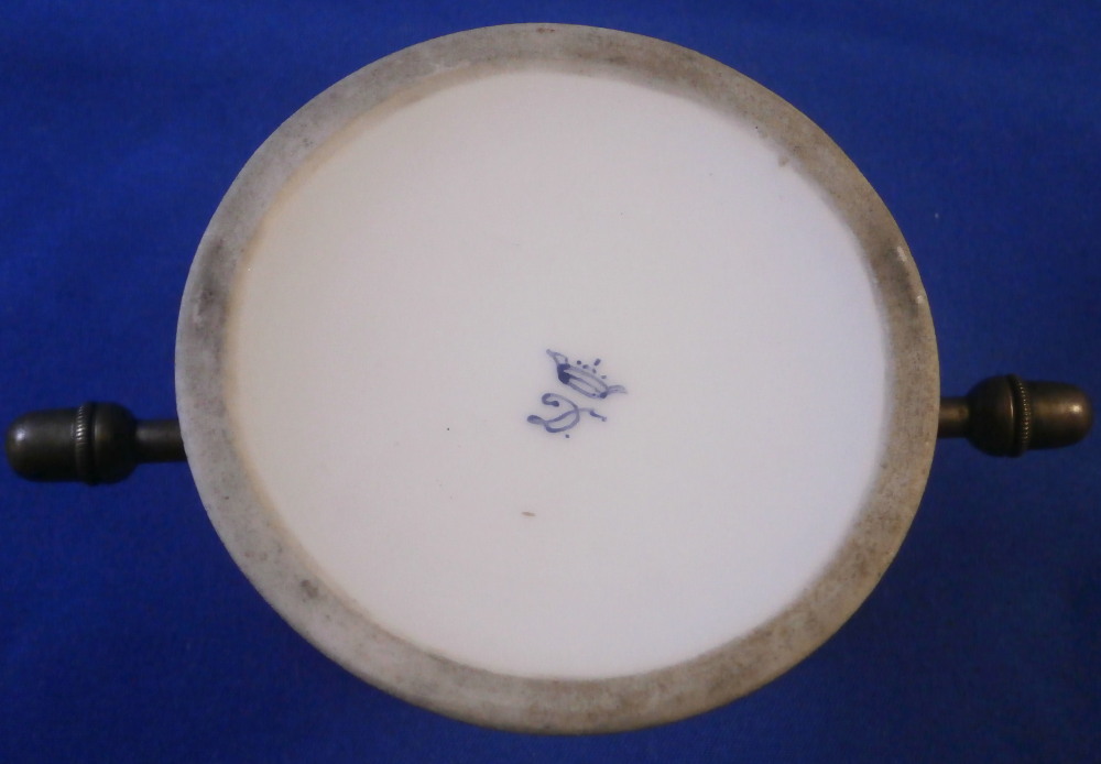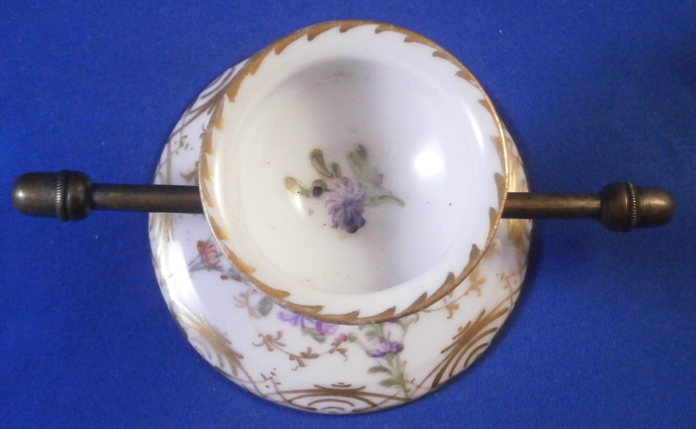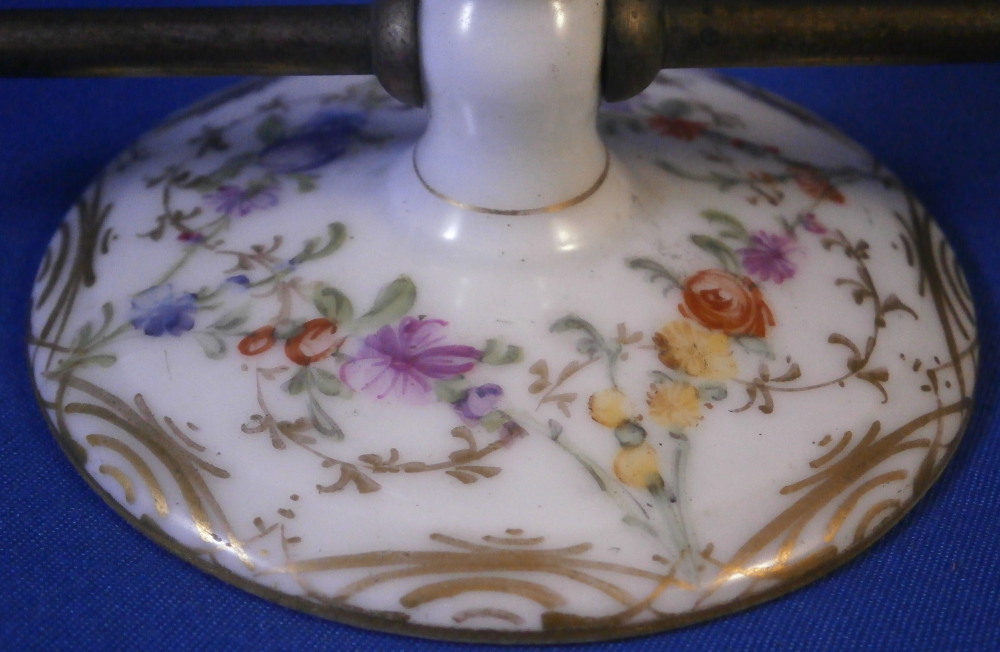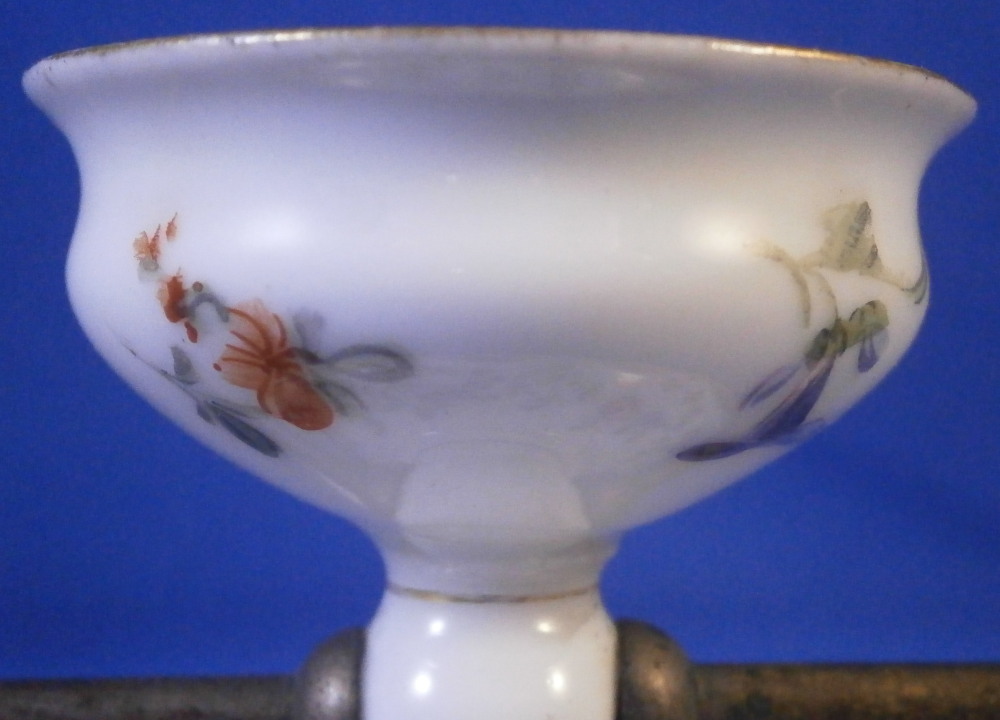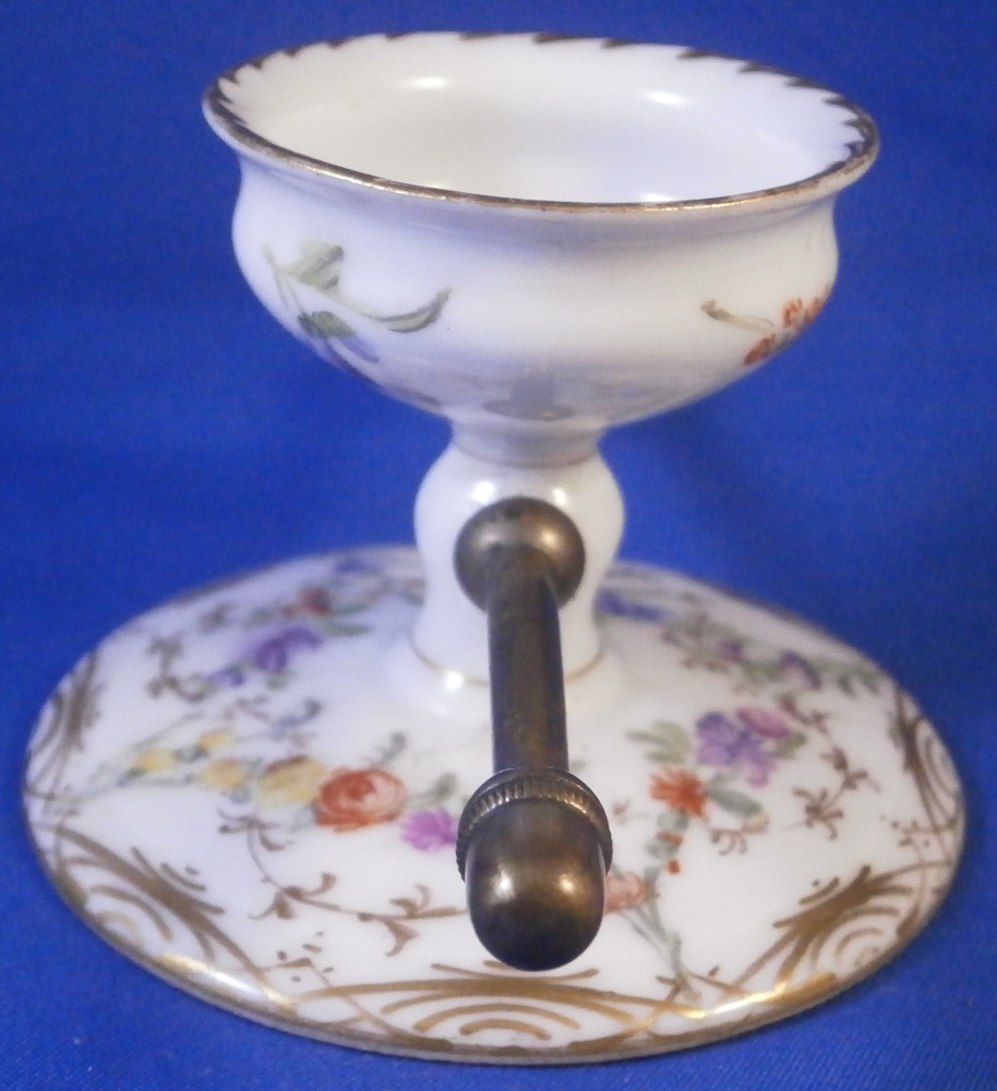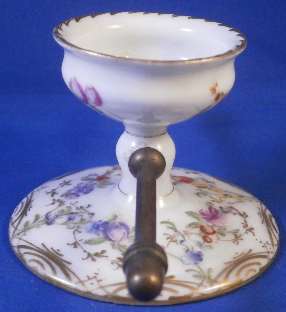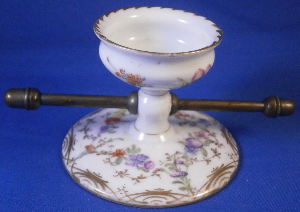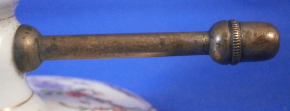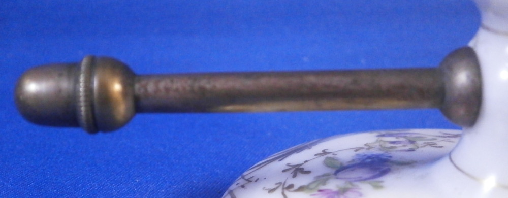 This is a mystery item made by Helena Wolfsohn in the Dresden area of Germany in the later 19th century. I have searched and asked around but could not figure out what this item was designed / used for nor could I find another. I am thinking some sort of medical devise but that is just a guess. Maybe someone out there has more of a clue and could send me a note - that would certainly be appreciated!! Either way the dish is nice modeled like a small eggcup sort of shape with a hole through the stem to apply the metal rod that unscrews into two pieces. An acorn design to the ends of the metal part. The base of the porcelain piece is very flat and wide, the stem thin and the cup round and not very deep. The entire piece is hand painted with a floral design all around as well as some gold trim. Definitely a conversation starter but without knowing what it is that conversation won't last long :) The dish is in great condition with a tiny fleabite to the underside edge of the top. Not visible when on display. It is just over 2 inches tall , has a diameter of 1.75 inches at the top and 2.75 inches at the base. The metal rod part is 4.375 inches long. It is marked underneath with the crown over the letter D as shown. Please email me for more information or other pictures.