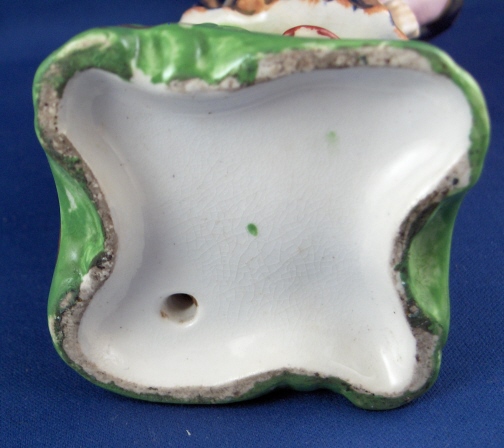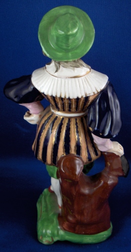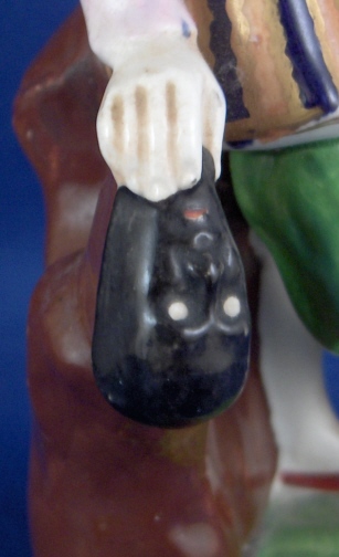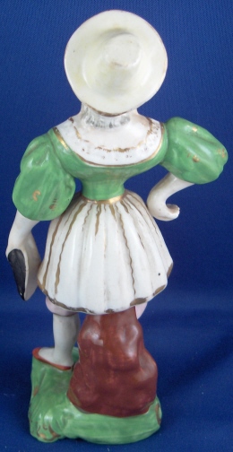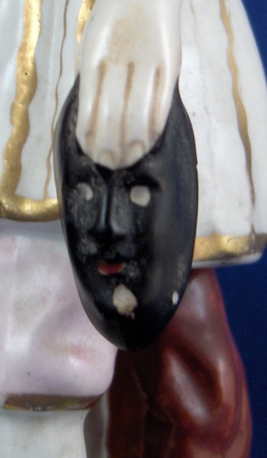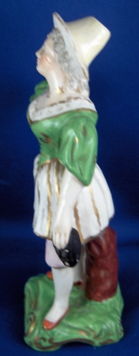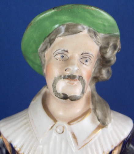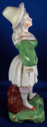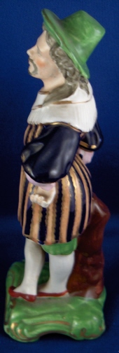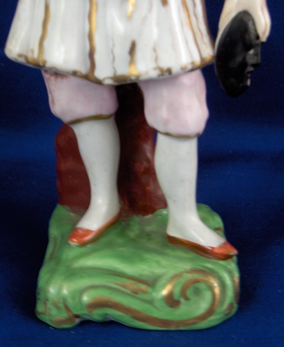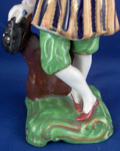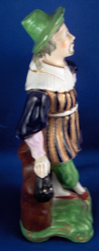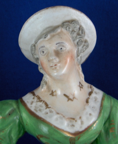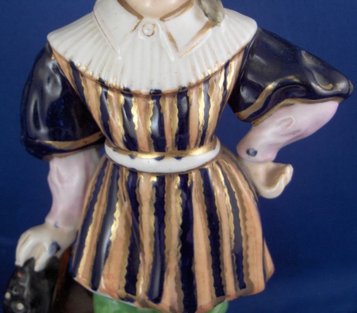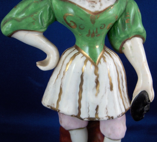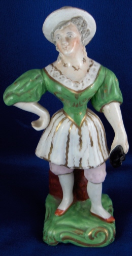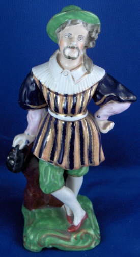 This is a superb pair of figurines made in the Staffordshire region in the mid 19th century. I found them during my search being declared as Rockingham commedia dell'arte but asked a friend that knows this stuff much better than me and she said they are Dudson theatrical figures. Either way they are superb. Nciely modeled and painted - one a lady holding a mask in her left hand and one a gent holding a mask in his right hand. They are amazingly in superb condition with jsut some wear to the gold highlights - no chips, repairs, etc. The figures are 7.25 and 7.5 inches tall, about 3.5 inches wide and 2.25 inches deep. They are not marked but that would just make it easy for us - it is quite common on these types of pieces! Please email me for more information or other pictures.
