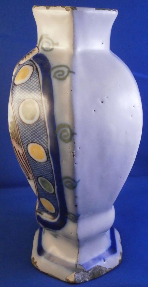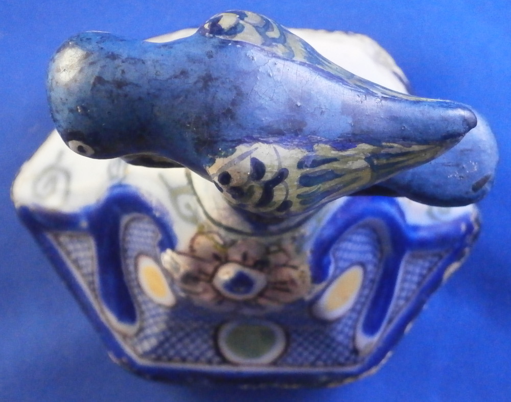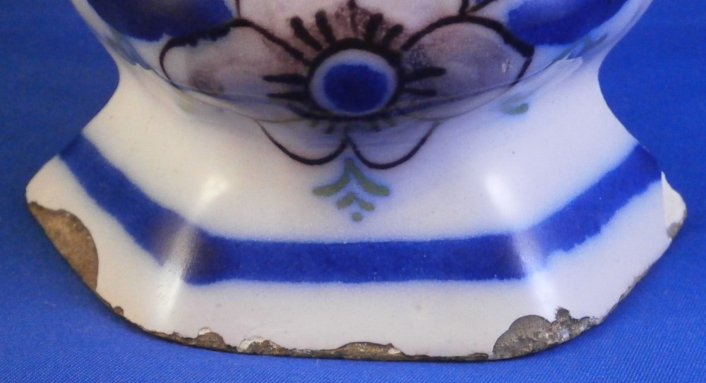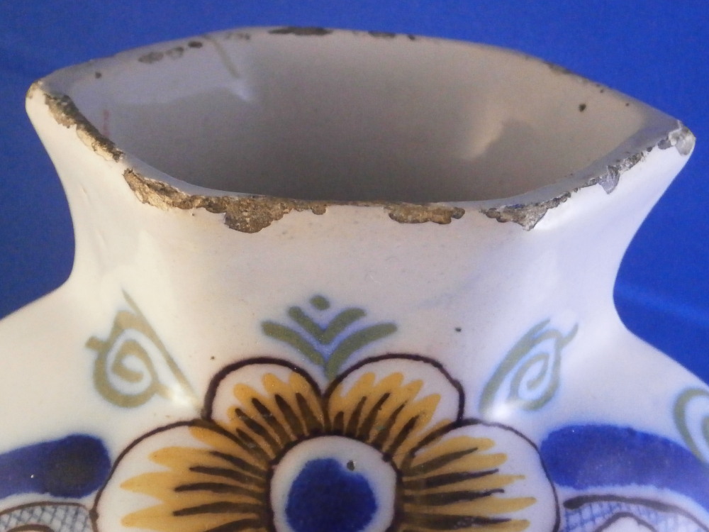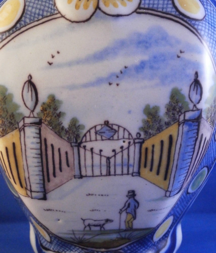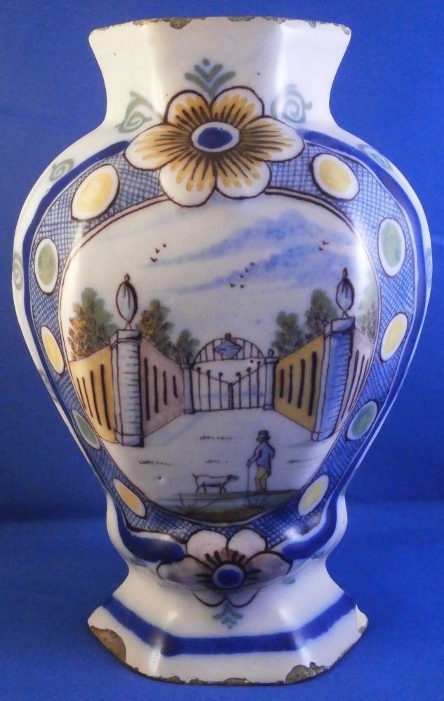This is a polychrome Dutch Delft lidded vase made in the Netherlands in the 18th century. It was made by a factory called " De Vergulde Blompot " and is collectively known as Delftware and is made of a tin glazed earthenware I believe. The vase is hand painted with a nice scene to the front of a gentleman walking his dog in front of a palatial gate. Nice design around the scene with a flower to the top and bottom. A green design to the back side. The vase comes with its lid which is decorated with a matching design and has a ncie bird finial to the top. Hard to find these early pieces nowadays. The set is in decent condition with chips to the bottom and top edge of the main body as shown. The lid has been restored all along the edge which has chipped again and the bird finial is restored. Not sure there is much original left on that bird since it is fully repainted for sure. Still nice to have the original lid as they are often long gone! The lidded jar displays nciely! The piece is marked with the B:P: in under glaze blue as shown. The vase and lid are about 13 inches tall, 5.5 inches wide and 4 inches deep. Please email me for more information or other pictures.