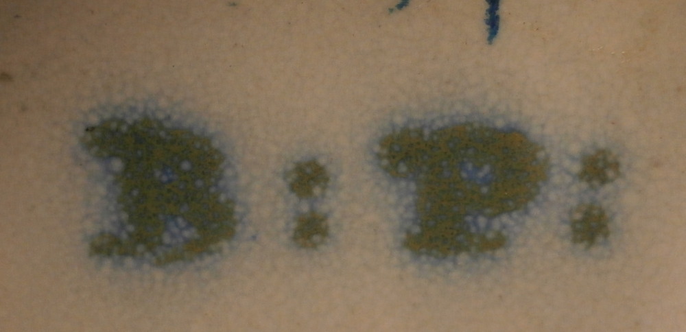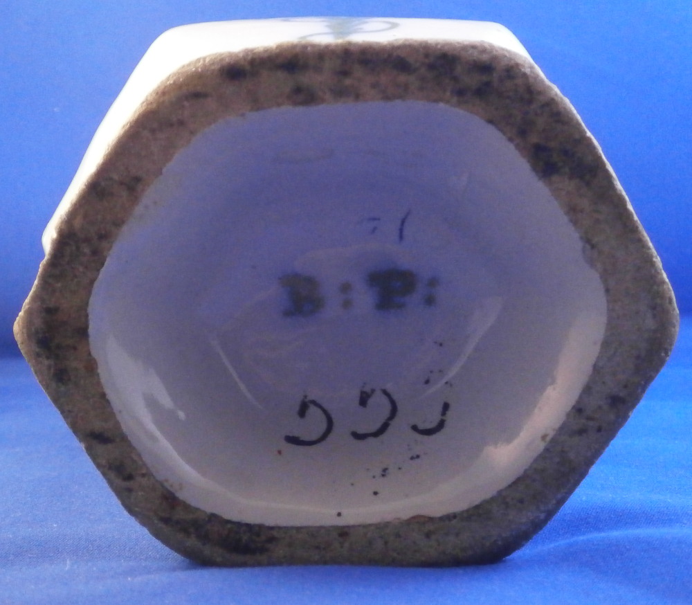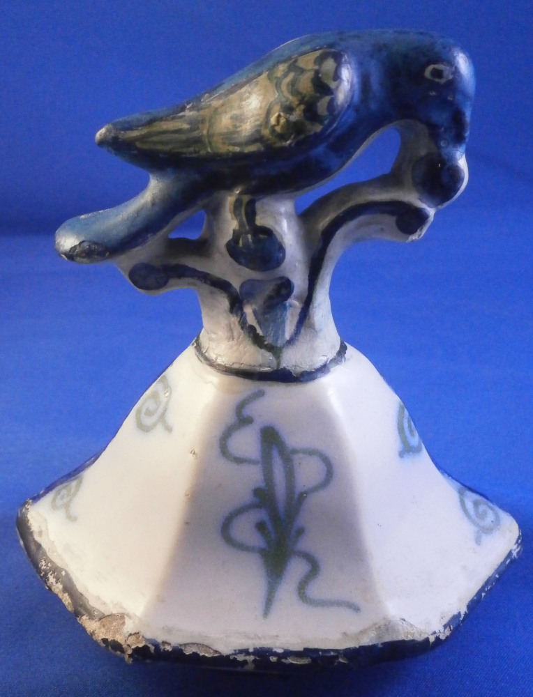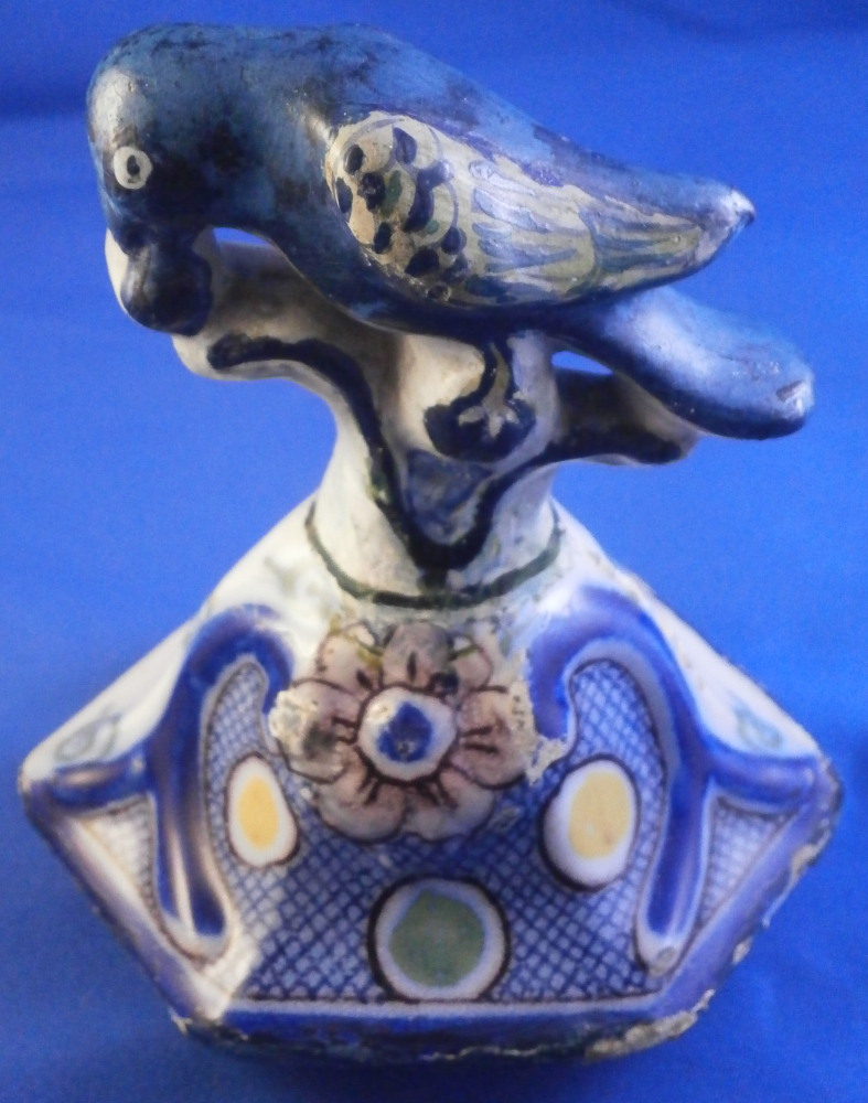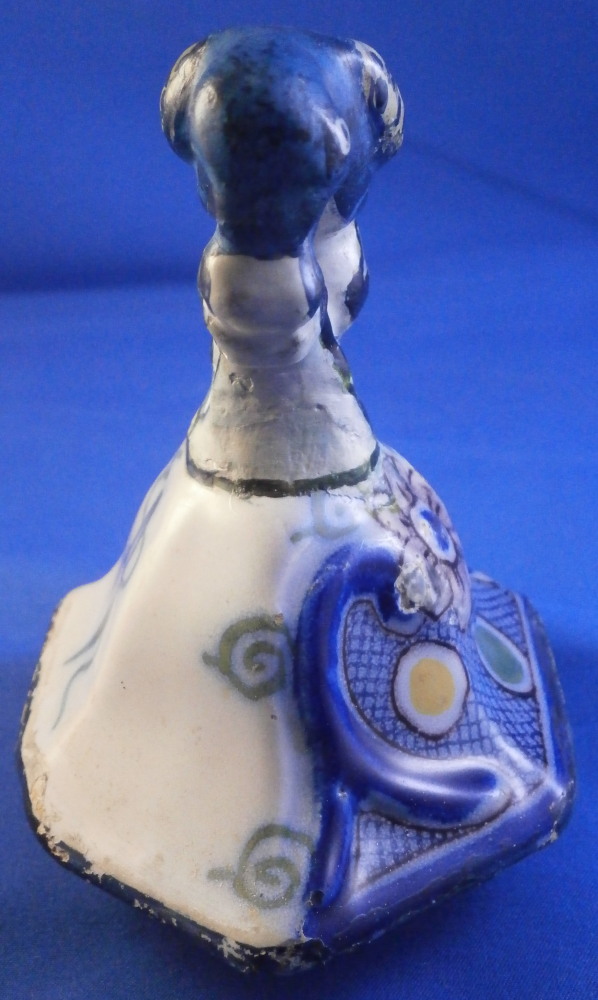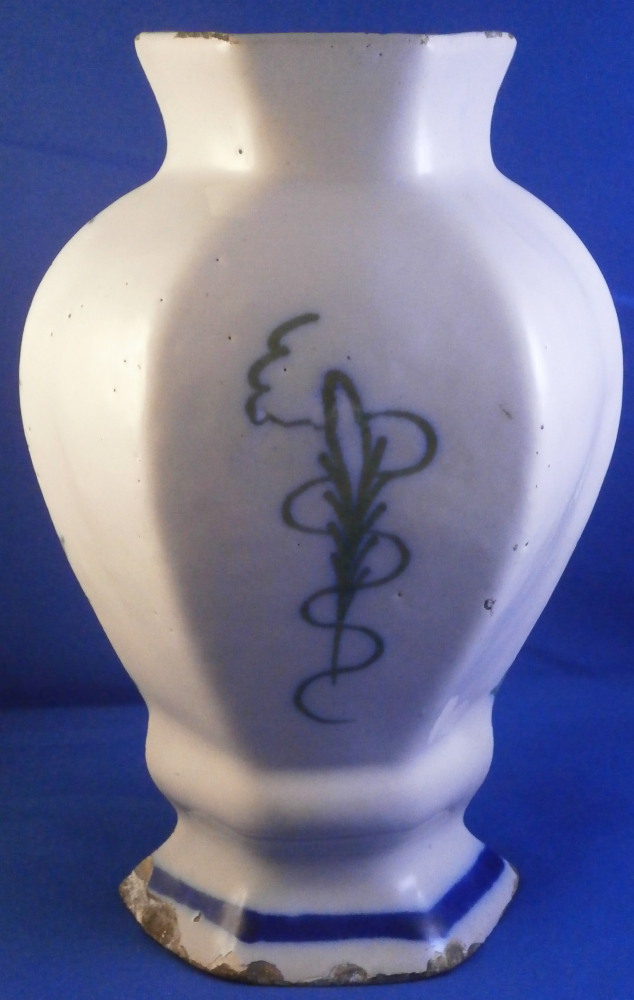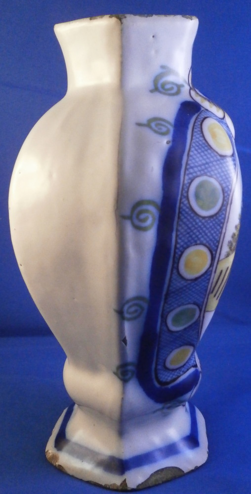 This is a polychrome Dutch Delft lidded vase made in the Netherlands in the 18th century. It was made by a factory called " De Vergulde Blompot " and is collectively known as Delftware and is made of a tin glazed earthenware I believe. The vase is hand painted with a nice scene to the front of a gentleman walking his dog in front of a palatial gate. Nice design around the scene with a flower to the top and bottom. A green design to the back side. The vase comes with its lid which is decorated with a matching design and has a ncie bird finial to the top. Hard to find these early pieces nowadays. The set is in decent condition with chips to the bottom and top edge of the main body as shown. The lid has been restored all along the edge which has chipped again and the bird finial is restored. Not sure there is much original left on that bird since it is fully repainted for sure. Still nice to have the original lid as they are often long gone! The lidded jar displays nciely! The piece is marked with the B:P: in under glaze blue as shown. The vase and lid are about 13 inches tall, 5.5 inches wide and 4 inches deep. Please email me for more information or other pictures.