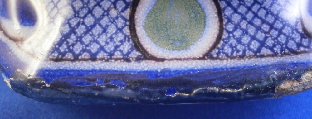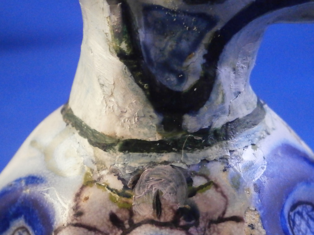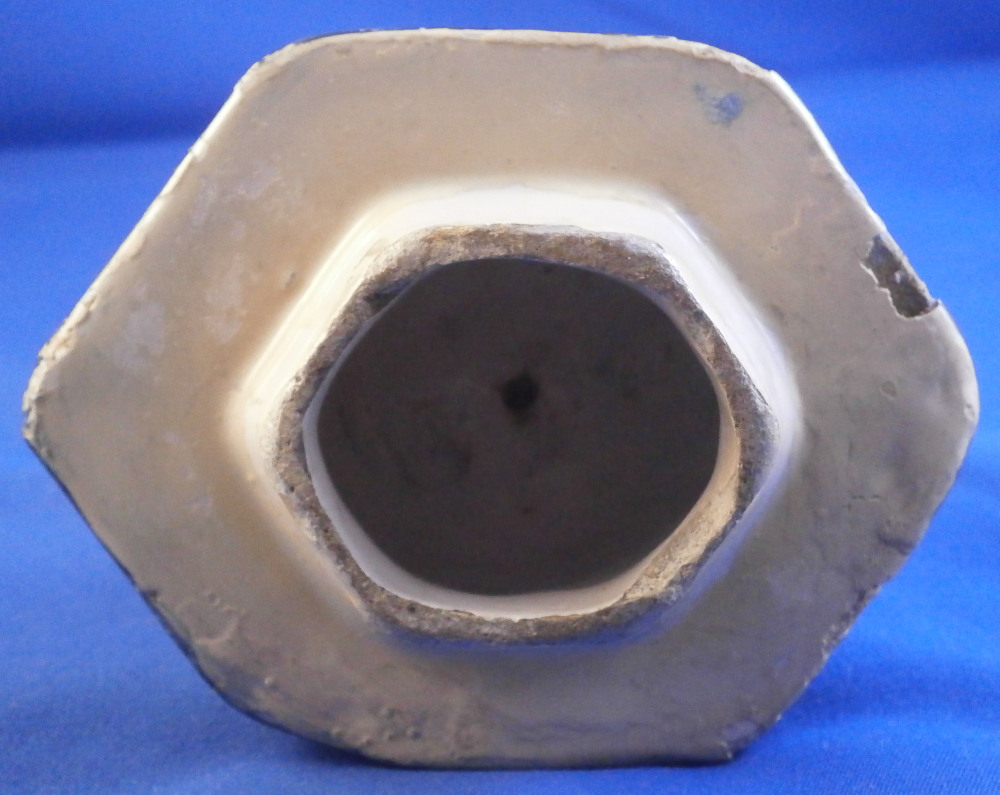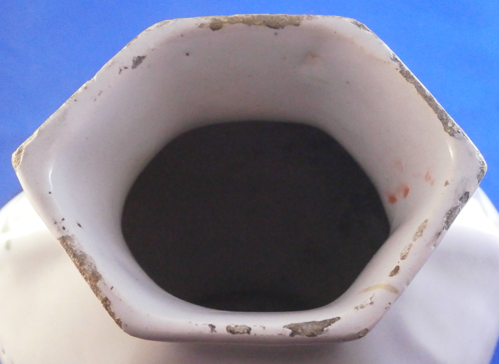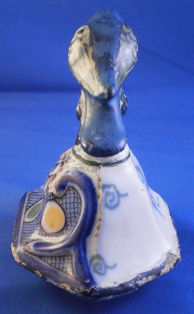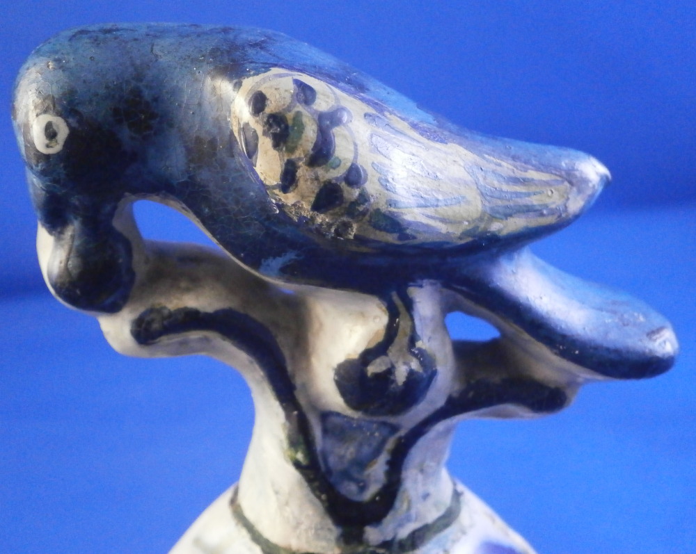 This is a polychrome Dutch Delft lidded vase made in the Netherlands in the 18th century. It was made by a factory called " De Vergulde Blompot " and is collectively known as Delftware and is made of a tin glazed earthenware I believe. The vase is hand painted with a nice scene to the front of a gentleman walking his dog in front of a palatial gate. Nice design around the scene with a flower to the top and bottom. A green design to the back side. The vase comes with its lid which is decorated with a matching design and has a ncie bird finial to the top. Hard to find these early pieces nowadays. The set is in decent condition with chips to the bottom and top edge of the main body as shown. The lid has been restored all along the edge which has chipped again and the bird finial is restored. Not sure there is much original left on that bird since it is fully repainted for sure. Still nice to have the original lid as they are often long gone! The lidded jar displays nciely! The piece is marked with the B:P: in under glaze blue as shown. The vase and lid are about 13 inches tall, 5.5 inches wide and 4 inches deep. Please email me for more information or other pictures.