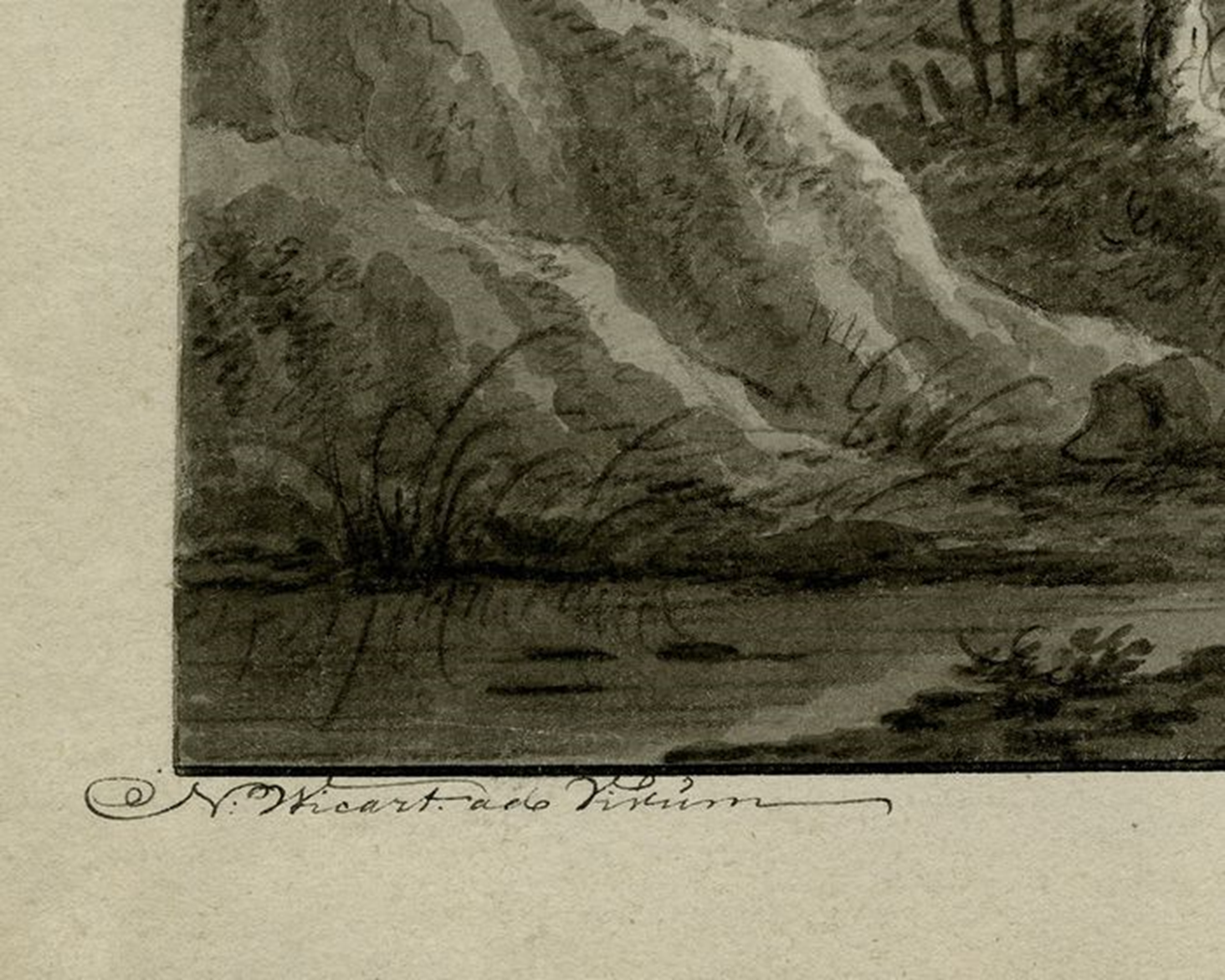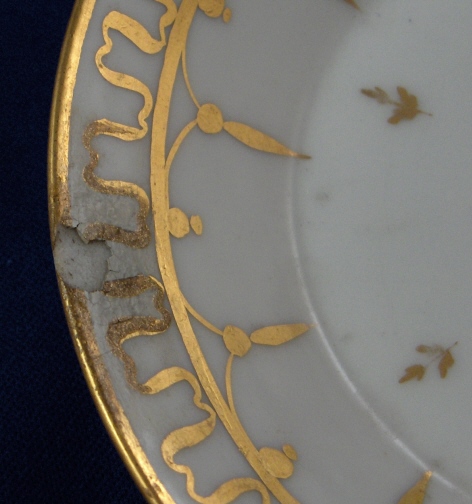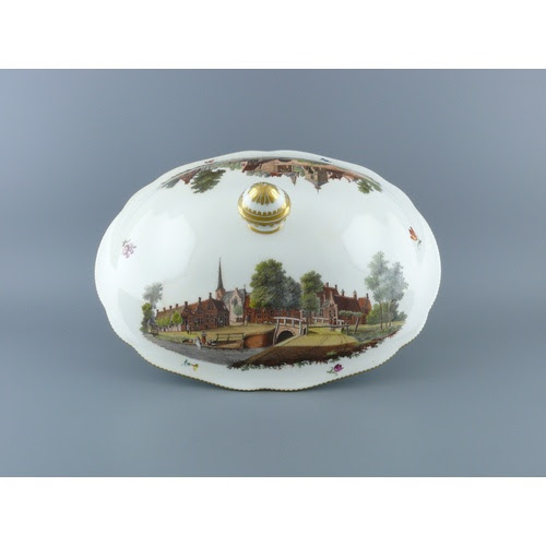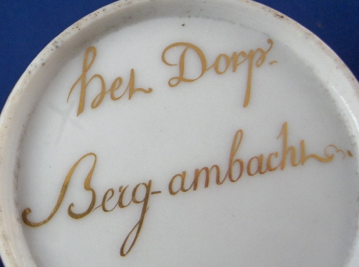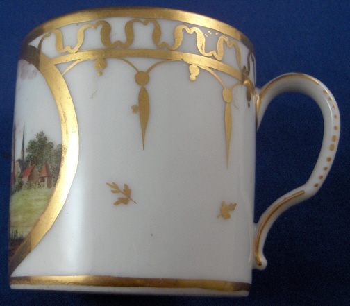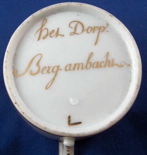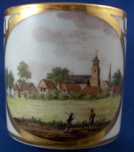 This is an amazing cup and saucer matching the other one I own. I fianally helped solve the riddle of who made them with the help of a Dutch collector. It was made by Oude Amstel around 1809 and painted by Nicolaas Wicart Utrecht (1748-1815). There are at least 600 drawings of villages and landscapes of him known. When Reverend de Mol founded (1774) his manuifacture in Loosdrecht, he attracted Wicart as a porcelain painter, where he worked from 1777 to 1784. His drawings or components formed the basis of many variations on the Loosdrecht porcelain. The fame of Loosdrecht was such that when the manufacture was moved to Amsterdam they continued to use it. In the event of breakage or expansion of an existing service Amstel made new matching examples. For example see a tureen labelled " 't Dorp Benschop". The saucer is hand painted with a nice gold design matching the cup but what makes this set much more interesting than usual is a superb scene hand painted with lots of detail in the front of the cup. The scene is of a small village (well back then at least) called Berg Ambach . Both pieces are in fairly good condition with the saucer having a chip as shown which is an easy fix and the cup has an inside rim restored fix which could use some updating. The saucer is marked with a gold L and the cup has something I have not seen on Dutch porcelain - the name of the place underneath in Dutch - the name of the town in the scene - Dorp Berg-Ambacht as well as the same gold L. A rare piece of Dutch history on porcelain and a superb one at that! The cup is 2.5 inches tall and the same in diameter. The saucer is 1 inch tall and 5 inches in diameter. Please email me for more information or other pictures.