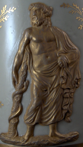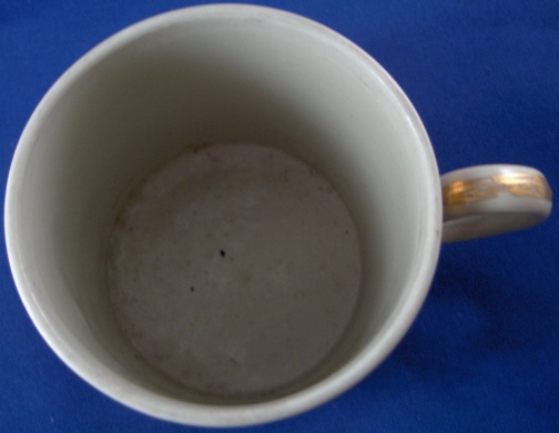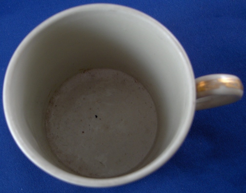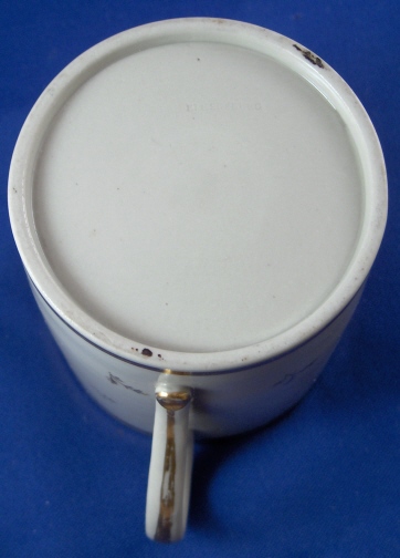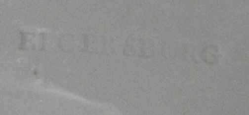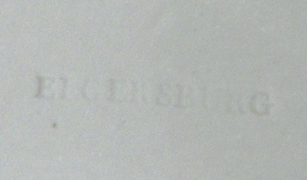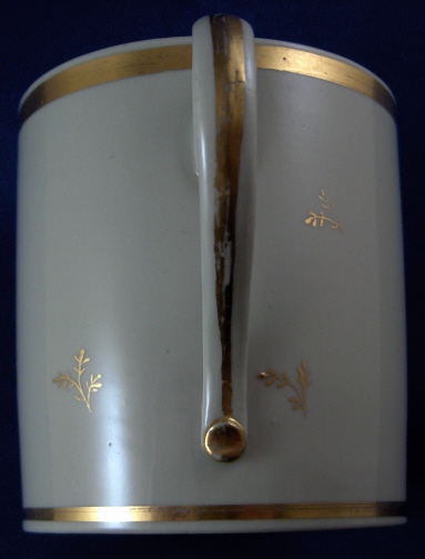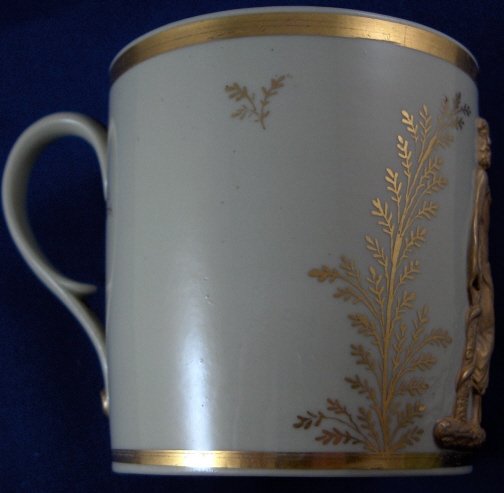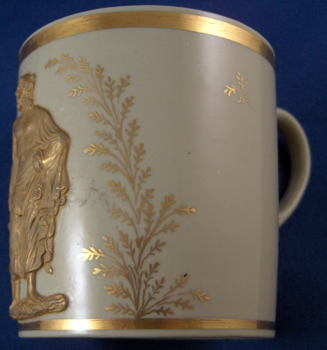 This is a fun mug/cup with a rare mark made by Elgersburg in the beginning of the 19th century right around when they started their business. Elgersburg was founded around 1806 by E &FC Arnoldi with the addition of Ludwig Droesse who made porcelain at Wallendorf. They made earthenware and porcelain the latter was supposedly not done until 1829. This cup seems to be some sort of celadon colored porcelain - it has a slight translucency and rings like porcelain though it certainly lacks the usual whiteness. Might be an early experimental piece? Either way it is superb with a raised relief scen of Hercules with his club and a snake going up the club. Gold twigs on either side with some smaller ones scattered throughout the other area. Gold trim to top, bottom and handle. The piece is in superb condition withjust a bit of wear to the gold trim. The best and most interesting part is the mark on the underside which I could not find in any reference book or anywhere else for that matter - an impressed ELGERSBURG. The cup is superb but the mark makes it a true rarity! The piece is 3.25 inches tall and 3 inches in diameter. Please email me for more information or photos.
