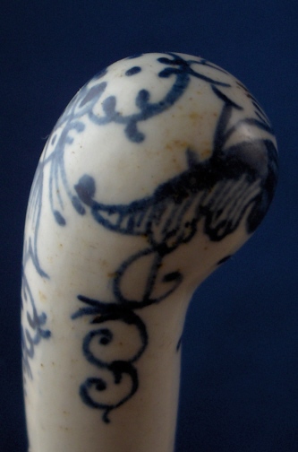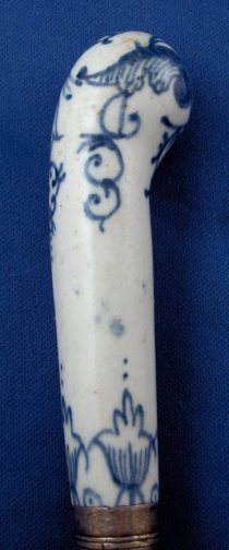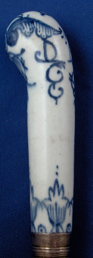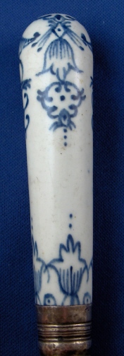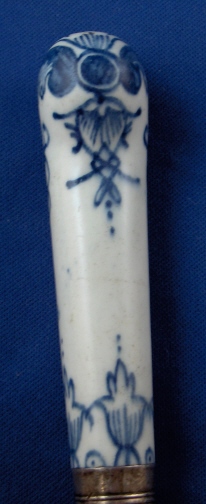 This is a superb 18th century English porcelain handled knife made most likely by Bow around 1760. A bit hard to figure out but I am pretty certain and it is definitely an 18th century English piece! The handle is made of porcelain that has a nice handpainted underglaze blue design to it reminiscent of St. Cloud pieces. The ferrule that connects the blade part and the handle or at least covers that part is made of Sterling silver and the blade part seems to be made of iron. A great example and not something you find often by any means! The piece is in great condition with some expected wear and oxidation but about as good an example as you could hope for! The piece is about 10.5 inches long and the thickest porcelain part is 1 inch wide. The porcelain handle part is about 3.375 inches long (the part that shows). Not marked but the design and paste fit Bow perfectly. Please email me for more information or other pictures.