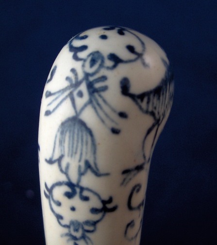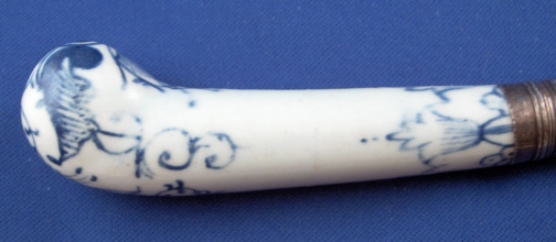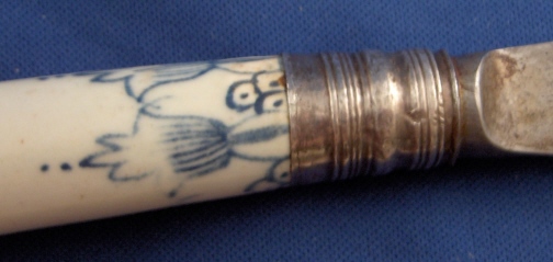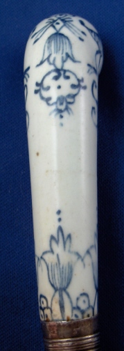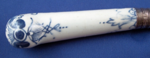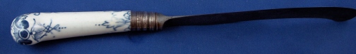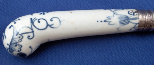 This is a superb 18th century English porcelain handled knife made most likely by Bow around 1760. A bit hard to figure out but I am pretty certain and it is definitely an 18th century English piece! The handle is made of porcelain that has a nice handpainted underglaze blue design to it reminiscent of St. Cloud pieces. The ferrule that connects the blade part and the handle or at least covers that part is made of Sterling silver and the blade part seems to be made of iron. A great example and not something you find often by any means! The piece is in great condition with some expected wear and oxidation but about as good an example as you could hope for! The blade's angle to the handle is off a bit which isn't a big deal at all. The piece is about 10.5 inches long and the thickest porcelain part is 1 inch wide. The porcelain handle part is about 3.375 inches long (the part that shows). Not marked but the design and paste fit Bow perfectly. Please email me for more information or other pictures.