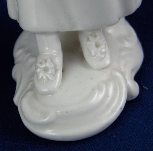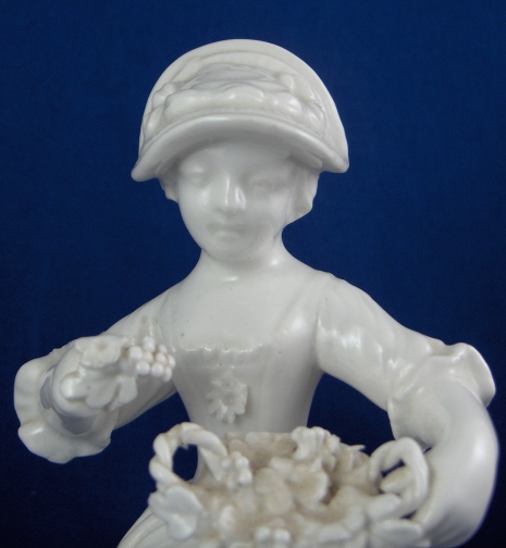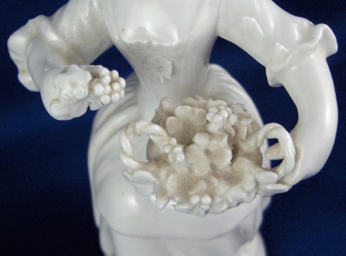 This is a blanc de chine figurine made by an ENglish maker (possibly derby ) in the early 19th century. A very well modeled piece that was left in the highly valued white to show off all that great detail! It is of a lady wearing a nice hat and holding a flower basket in her left hand/on her lap. The figurine is in great condition with one damaged leaf and one petal with a tiny chip. The piece is unmarked which is very common on English porcelain of this period and makes it a pain to figurie out who made her :) She is 5.125 inches tall, 2.875 inches wide and 3 inches deep. Please email me for more information or other pictures.