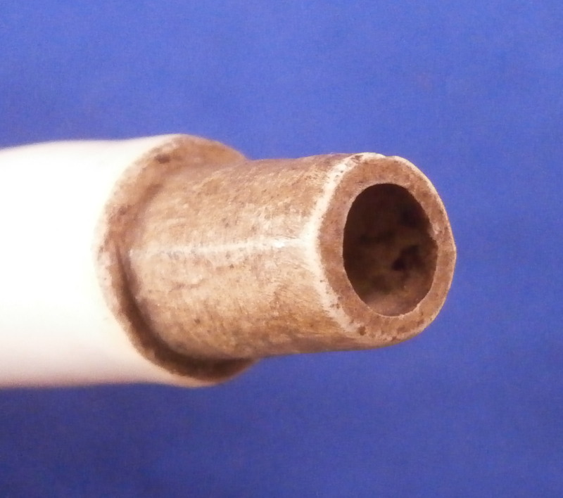 This is a porcelain handle for cutlery / utensils like a knife or a fork made of porcelain in England in the 18th century. I cannot find this exact pattern but it likely was made by Worcester or Bow and is decorated with hand painted blue flower - a larger arrangement to the tip as well as four smaller ones around the rest of the piece. Nice quality piece and in the pistol grip shape quite common to England during this period. The piece is in perfect condition but is missing its hardware so if anyone has a busted up handle with the original fork or knife parts here is your chance to complete it again! The piece is 4.25 inches long and the thickest porcelain part is 0.875 inches wide. The glazed part is about 3.625 inches long. Not marked but that is normal. Please email me for more information or other pictures.