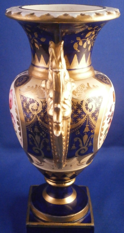 This is a really nice vase made in England in the early 19th century. It was probably made by Rockingham but it could also be Coalport or any of these types of makers during this period. It's really hard to tell. Either way it is a superb piece. It has a nice shape to it with a handle to either side in the form of a fancy swan though the guy I bought it from thought they looked like dragons. The entire piece has a deep cobalt blue ground color to it with some nice fancy gilding over that with some areas of a white ground going towards and off white ground. Not the ebst color choice as it nowadays looks like an old restoration but it is not! The front and back each ahve a nice floral arrangement painted on the fading white ground. It looks stunning! The very top has a relief design to the paste with a bit of gilding in between. All in all a superb piece and the cobalt blue with flowers always looks superb. One of the best color combinations in the porcelain world I think! The vase is in great condition with a touch of wear to the gilding mostly around the base, a tiny flat chip to the bottom edge and a rough spot on the beak of one of the swans though that is no obvious and the piece displays perfectly! The vase is about 7.375 inches tall, 4.625 inches wide including the handles and 3 inches deep. Not marked but that is pretty normal! Please email me for more information or other pictures.