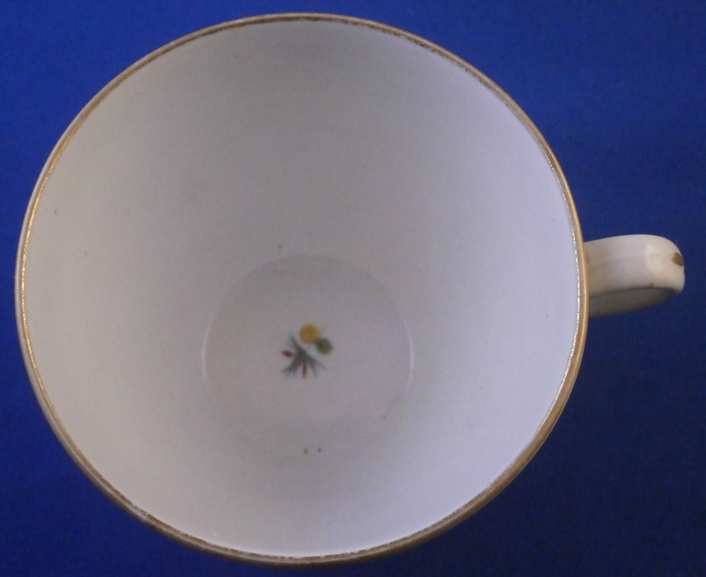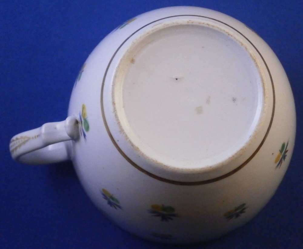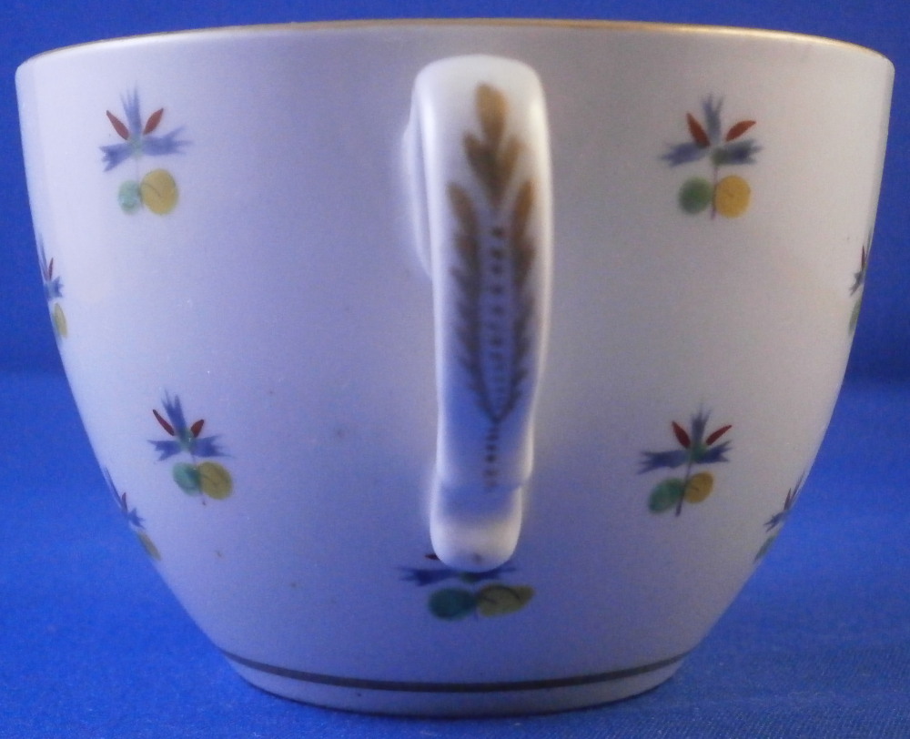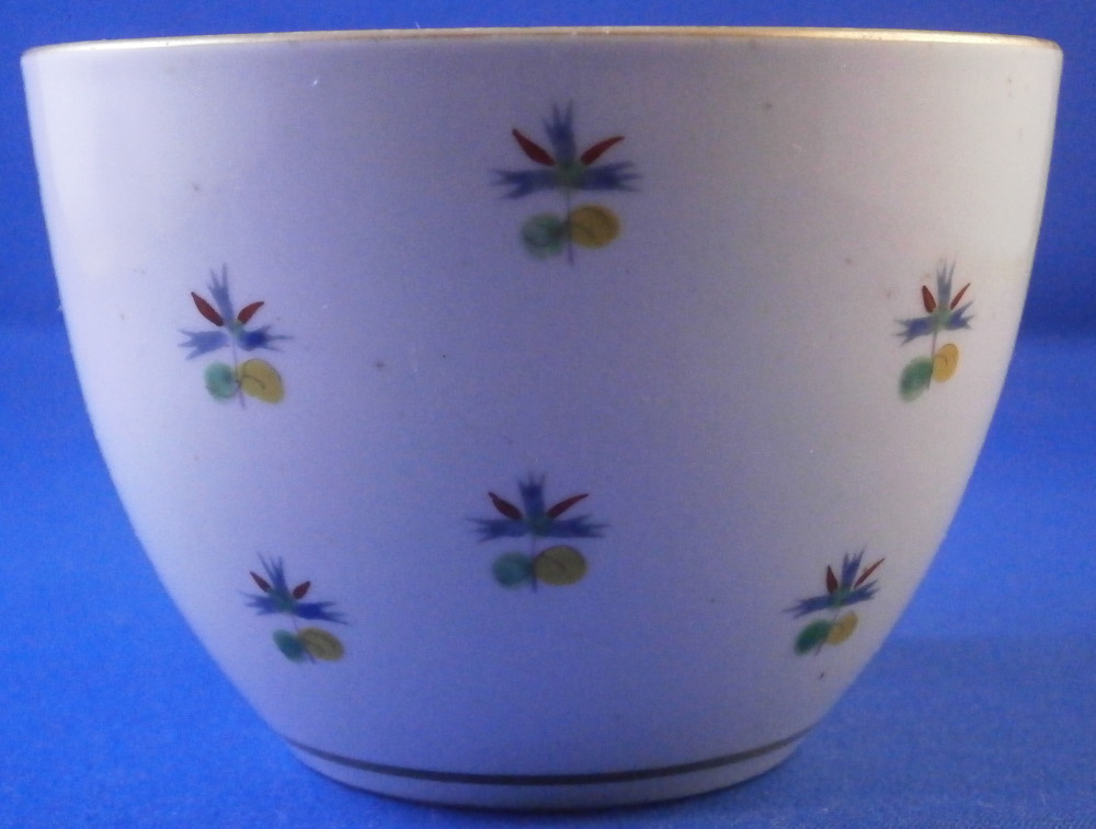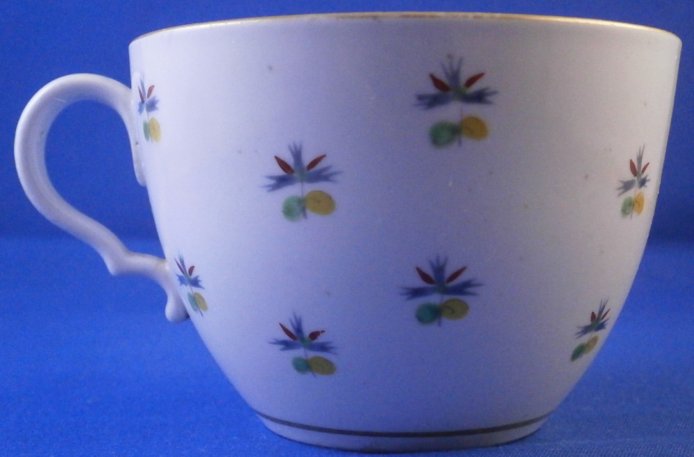 This is a single nice cup made by Spode in the early 19th century between 1800 and 1810. I am pretty certain about my attribution given the handle shape though I ahve not seen this pattern by them before. The cup has the familiar Bute shape which was used before the London shape became more commonly used. It is hand painted with colorful cornflowerw with blue blossoms with a touch of red and yellow and green leaves. A bit of gold trim to the top edge and bottom as well as the handle. Really a cute design! Sadly no saucer but the cup is in great condition with jsut a touch of wear to the gilding along the top edge. The cup is 2.25 inches tall and has a diameter of 3.25 inches. Unmarked but the idication of it being Spode are there. Please email me for more information or other pictures.