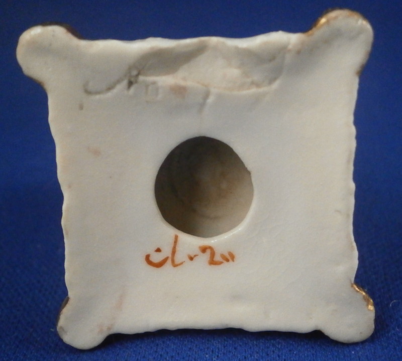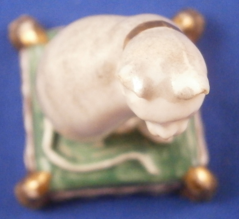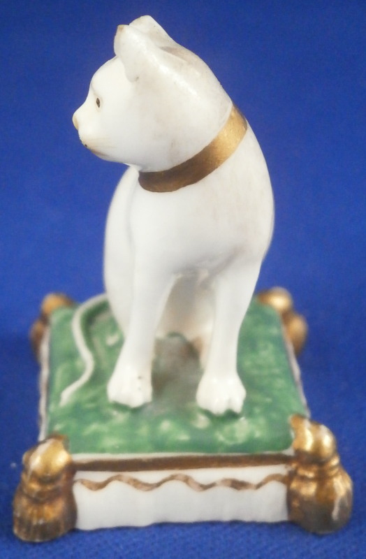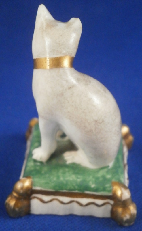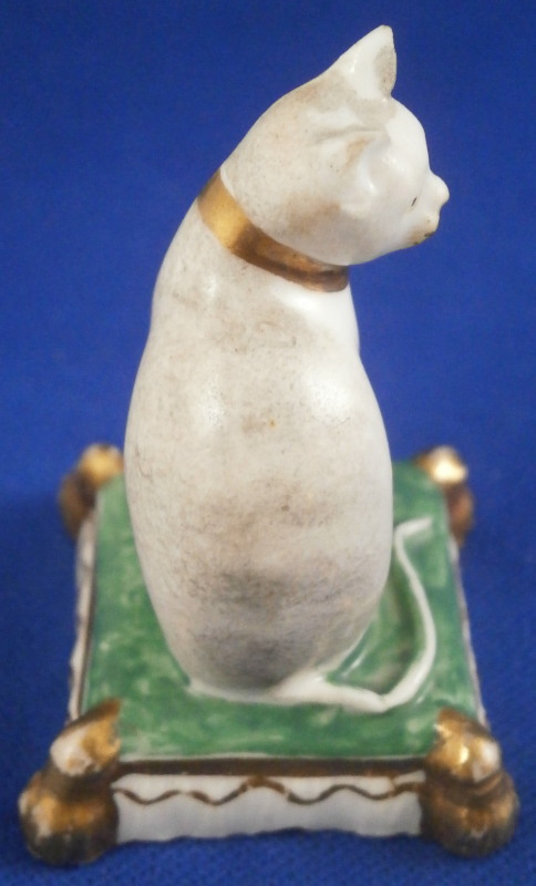 This is a great little figurine of a cat sitting on a pillow certainly made in England and in the early 19th century. Probably by Derby since they did make some small figures as well and since it is marked with an incised No. (the rest is chipped). The figure is nicely modeled with the pillow having four tassles and the face painted superbly. The back of the cat is slightly grey and the top of the pillow is green and the sides have some gold highlights. The piece is in great condition with the ears being chipped - the right one more than the left and the edge / underside has a chip as well as shown. A bit of gold wear. It displays superbly. It is marked as mentioned with a partial incised No. as well as some red letters and numbers which are more likely a collector's label rather than from the actual maker. The figurine is just under 1.75 inches tall with the base being just over 1.25 inches square. Please email me for more information or other pictures.