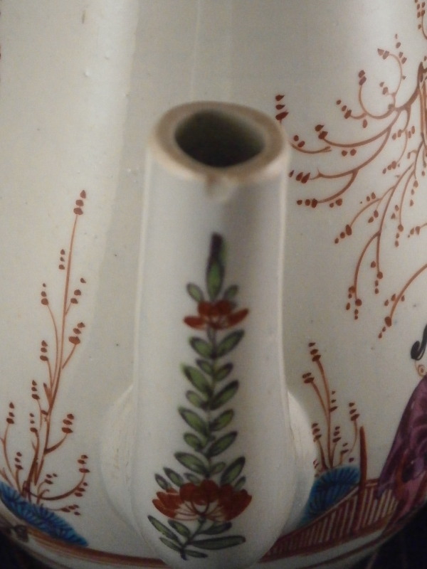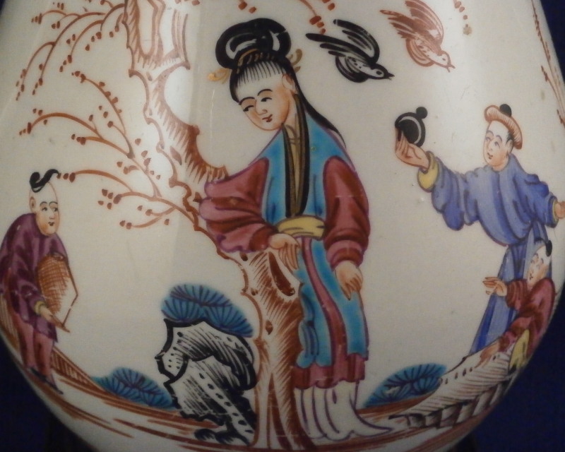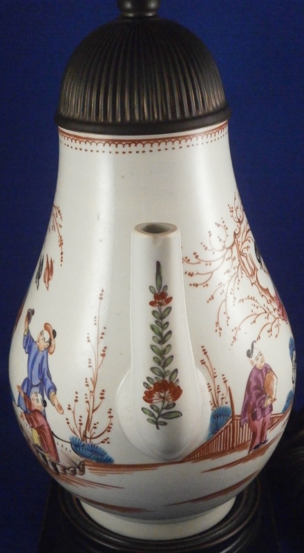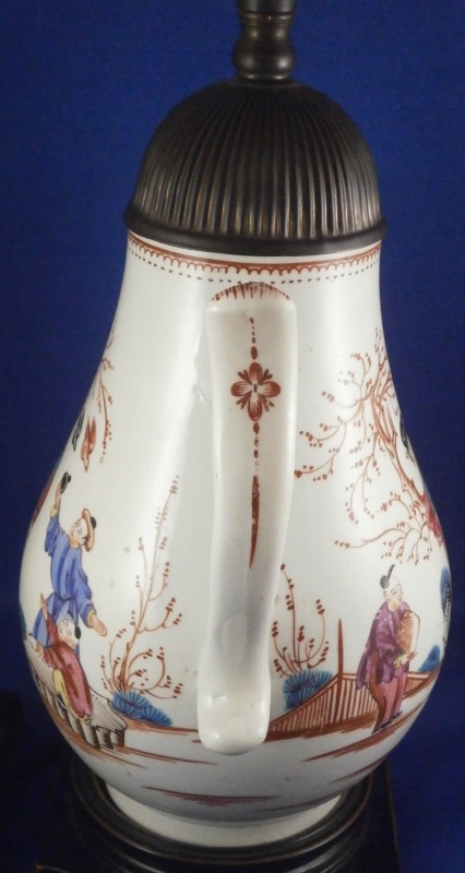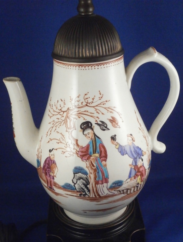 This is a fun lamp made up of a coffee pot decorated with Chinoiserie scenes most likely made made by one of the Liverpool maker like Seth or John & Jane Pennington or Phillip Christian in about 1780. Not quite sure which one as I could not find this decoration exactly. The pot is hand painted with a superb Chinoiserie scene on either side, a floral decoration to the front of the spout and a bit of reddish trim to the handle and top rim. The lid is a replacement made of some sort of metal but quite old itself already and all this has been converted into a lamp with a wooden base, pretty new shade and electrical parts that look fairly new as well. Likely in perfect shape to jsut plug in but you might want to have it checked out by a professional first. The coffee pot is in great condition but the spout tip has been ground with a small chip to the front. It is a superb example and looks stunning as a lamp. No idea if it is marked as I did not take it apart but I doubt it as most were not. The coffee pot is about 7 inches tall. The entire piece including the base and shade is about 16.5 inches tall. A truly fun piece and perfect for the porcelain lover in you :) Please email me for more information or other pictures.
