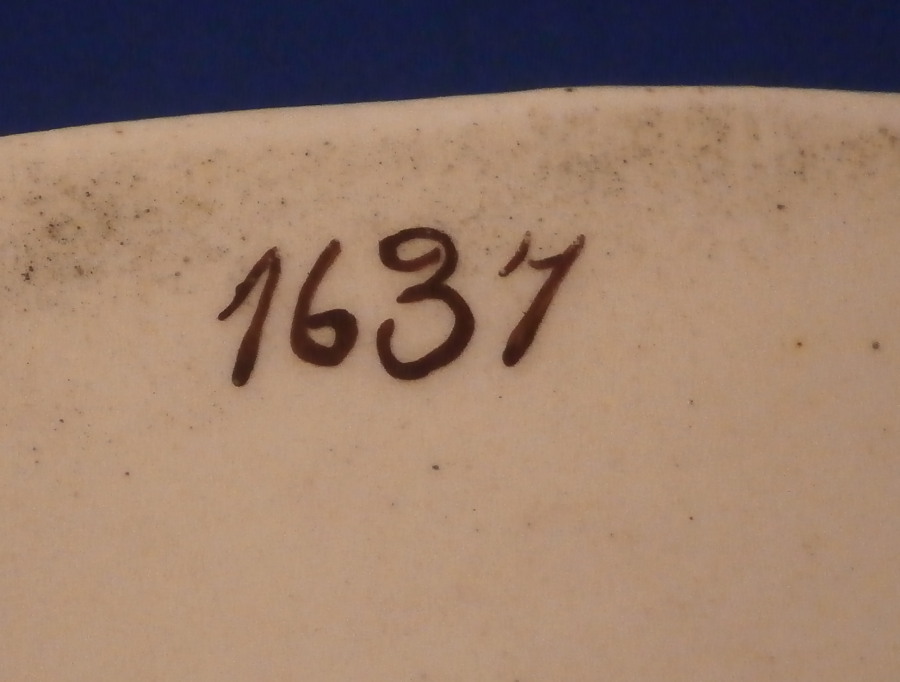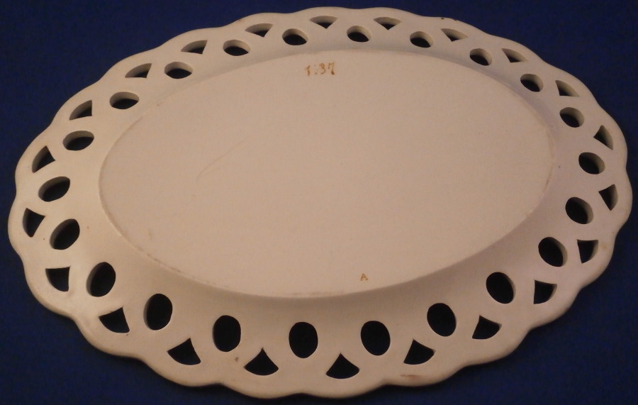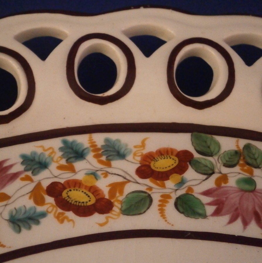 This is a creamware chestnut basket and underplate / stand in pattern number 1637. I am pretty certain it was made by David Wilson & Sons , Hanley , Staffordshire , in the vey early 19th century around 1810. The basket is superbly modeled with reticulated sides and a handle to each side, is hand apitned with a really ncie floral design all around the inside rim and has a bit of brown trim. The underplate is painted in the same way. It is nice to find them still together and both are in superb condition with just a minor touch of age related wear in the form of white spots in the brown trim. The set displays perfectly! The basket is 2.625 inches tall, 8.875 inches wide and 5.375 inches deep. The underplate is 0.625 inches tall, 9.125 inches wide and 6.5 inches deep. Both pieces are marked with the pattern number and the stand also has a red A under it as shown. Please email me for more information or other pictures.