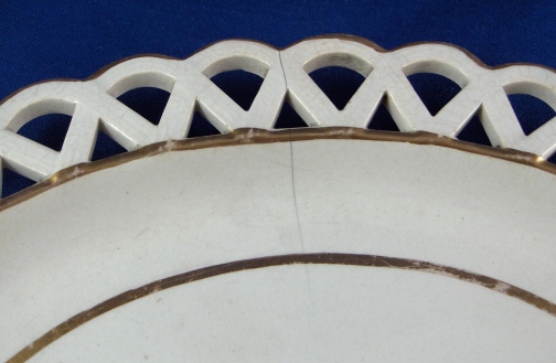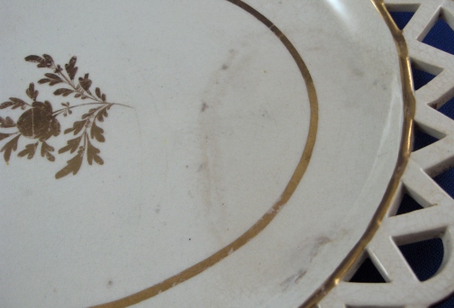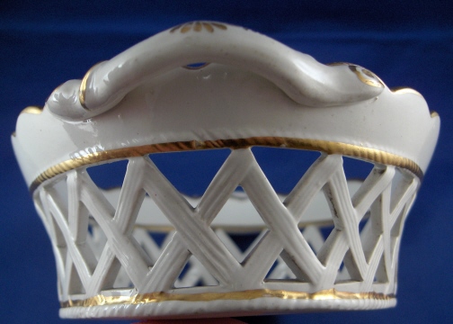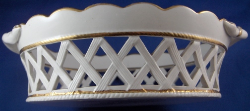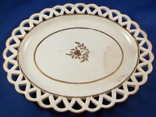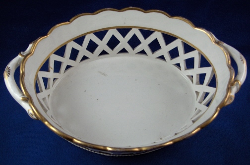 This is a Spode porcelain chestnut basket and stand in pattern number 341. The pattern was introduced in 1803 and a small gilt flower sprig was used on dessert wares but omitted from tea and dinner wares. This basket was made in the early 19th century. The basket is superbly modeled with reticulated sides and branch handles highlighted with gilding. The underplate has a reticulated rim highlighted with gilding and a flower in the center. This basket is in superb condition with a little wear to the gilding, some firing marks from the making on the inside bottom and underneath as well as two small chips on the bottom rim that are minor. The underplate has some wear to the central gilded flower, a hairline with two tiny chips by it on the side and a stained area on one end but still looks very nice and it is not common to find the basket with its underplate. The basket is 2.25 inches tall, 8 inches wide and 5.5 inches deep. The underplate is 0.875 inches tall, 9.25 inches wide and 7.75 inches deep. Neither is marked but that is the norm for these ware during this period. Please email me for more information or other pictures.