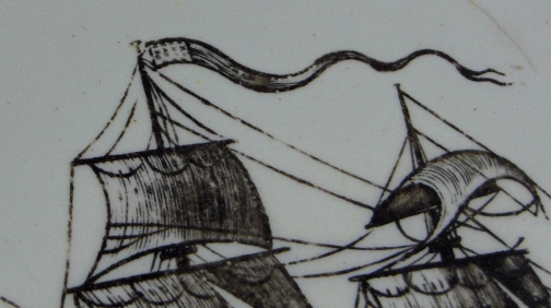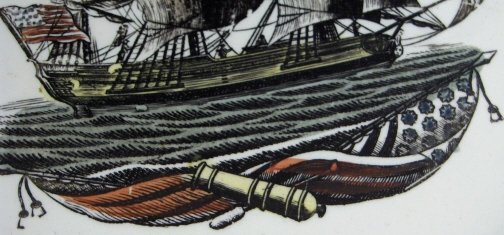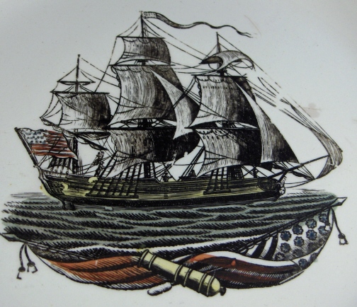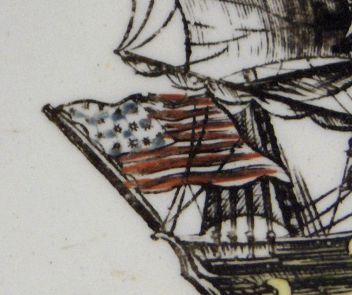 This is a neat plate made in England in the early 19th century for the US market. It is made of creamware and shows a scene of a ship flying an early version fo the Amercian flag with another flag underneath the scene. Not exactly sure how many stars there are I count 15 though it seems to only have 13 striped so probably the 20 star version from around 1818. Definitely an early plate from around 1800 -1820. The plate has a black ring round the rim. It is in great condition with some very light wear. The piece is 1.125 inches tall and has a diameter of 9.875 inches. It is not marked but that is fairly normal for these kinds of pieces. Please email me for more information or other pictures.