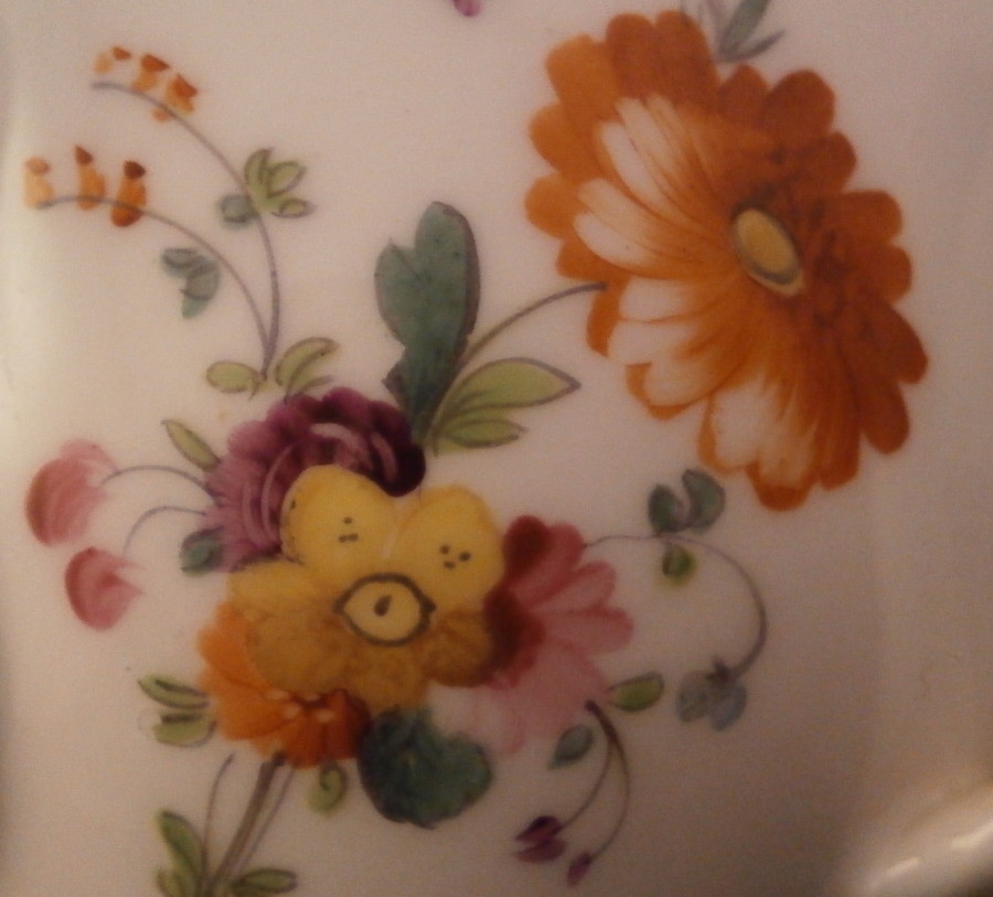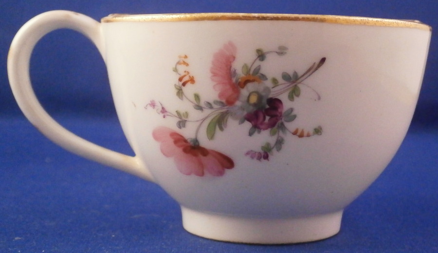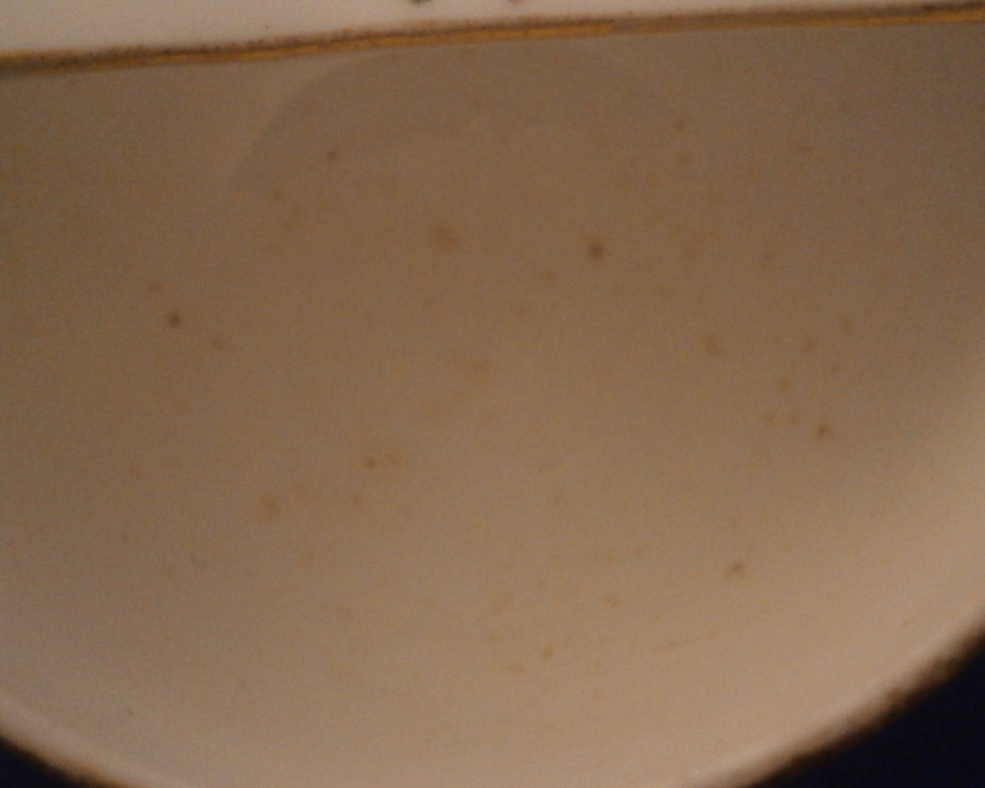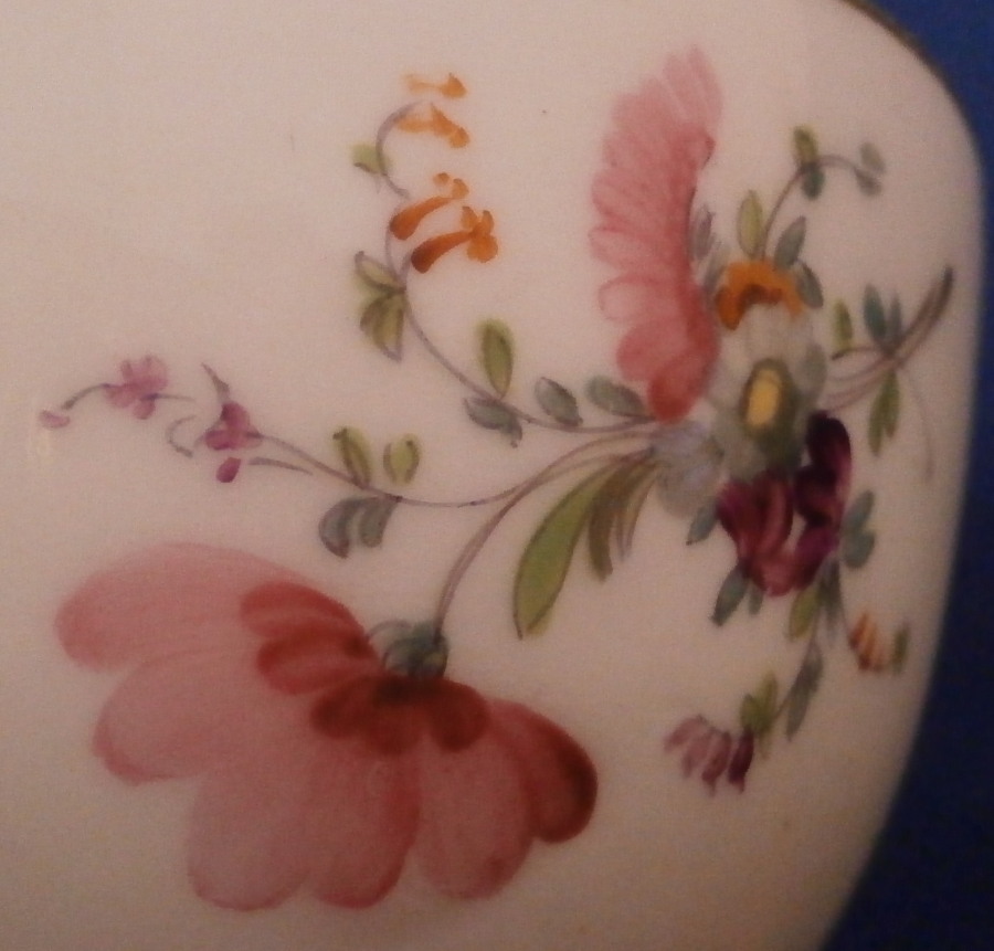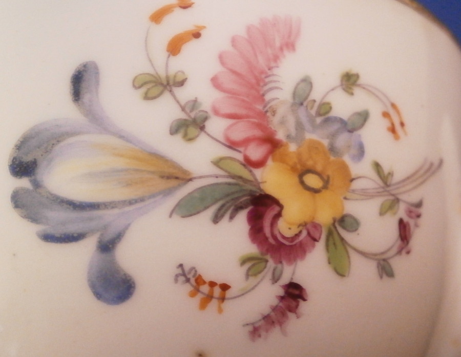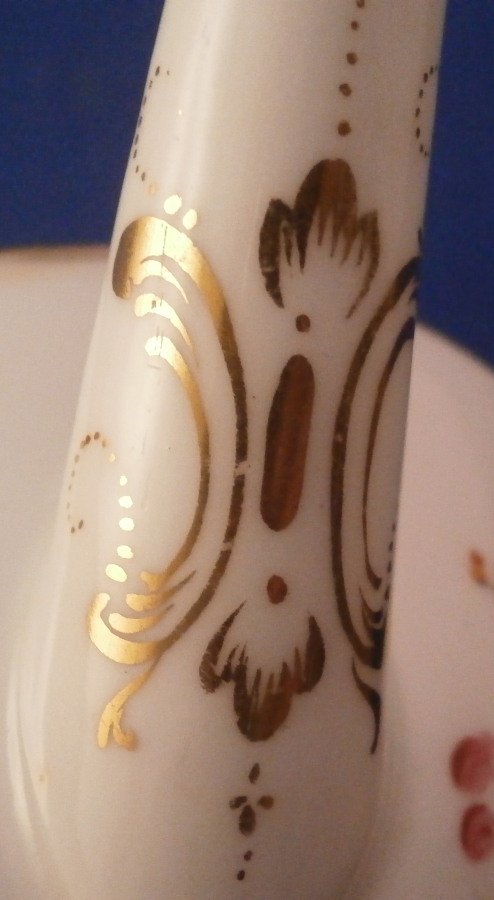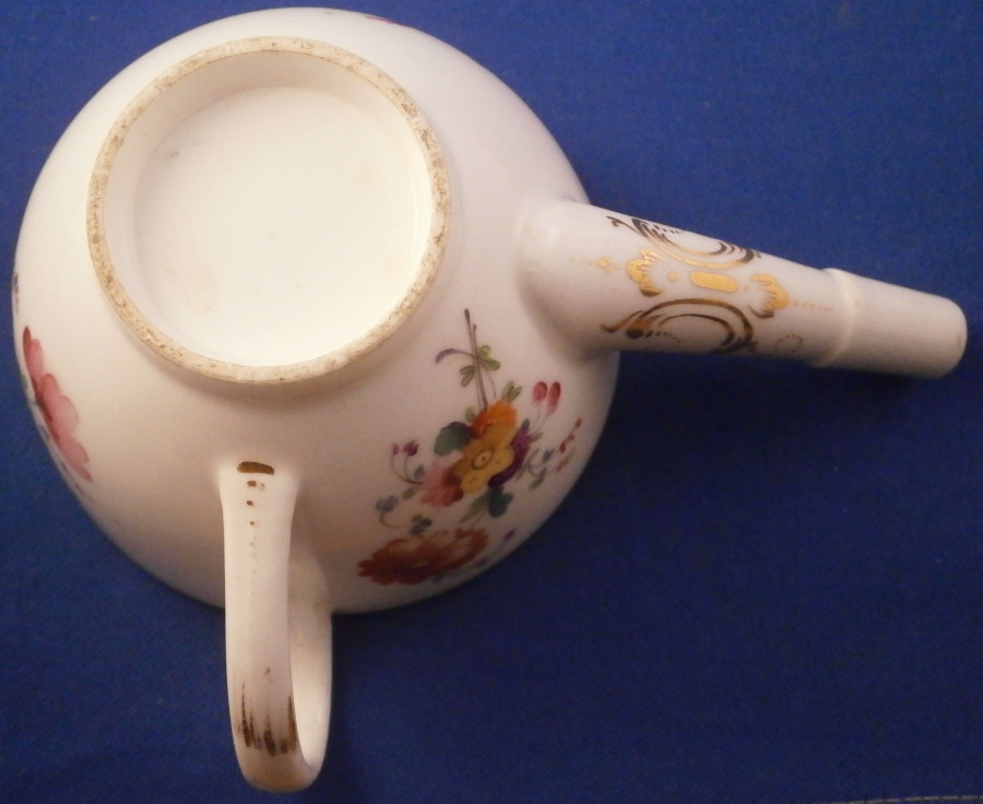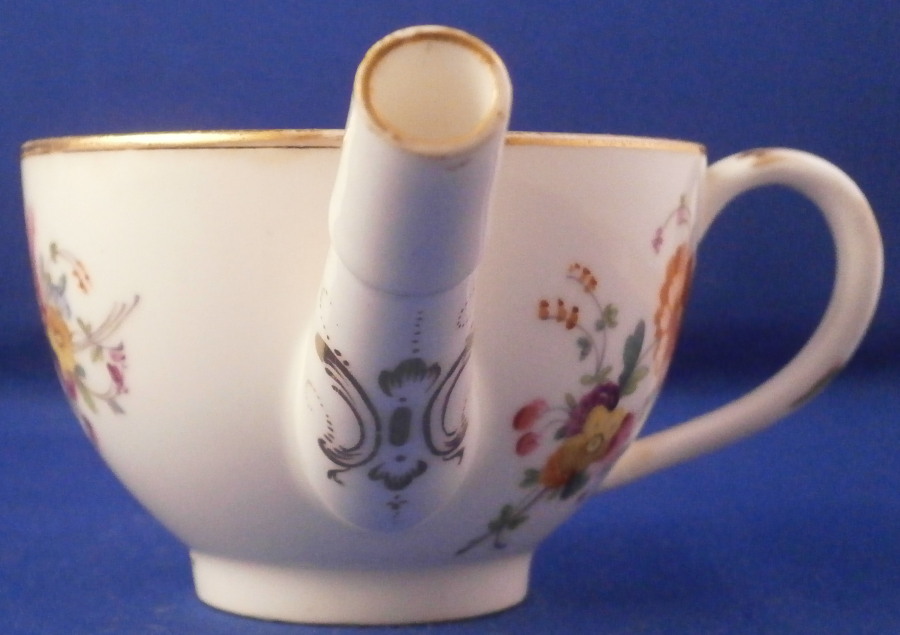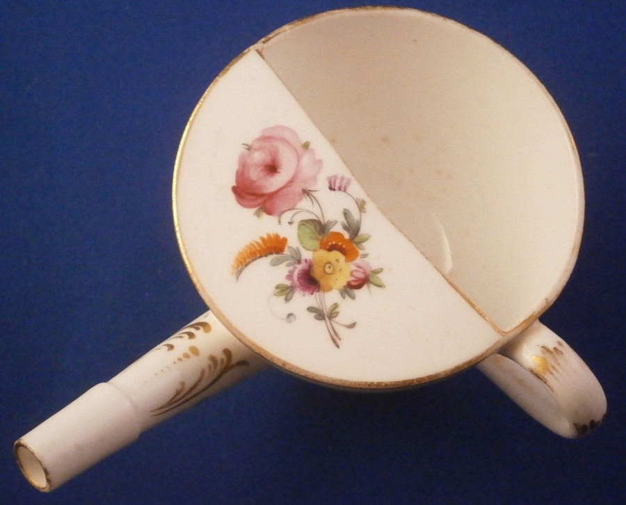 This is a really nicely decorated invlaid or infant feeder made in England in the ealry 19th century around 1820. Not sure of the maker but Copeland or Coalport or such would be a good match. The piece has a nice shape to it with an unusual spout tip which should help figure out the maker. It is nicely hand painted with three floral arrangements around the outside of the cup part and another to the top part. Handle to one side with a bit of gold trim, gilding to the edges and a nice gold design to the spout. An attractive piece for anyone colelcting medical examples or off course for a porcelain nut like myself. The piece is in great condition with a touch of wear to the gilding along the top edge and some light staining spots to the inside as shown. It is unmarked but that is pretty normal for English makers of this period. The piece is just under 2 inches tall with the top diameter of the cup part being 3.125 inches, the handle sticks out 0.875 inches from the side and the spout sticks out 1.75 inches. Please email me for more information or other pictures.