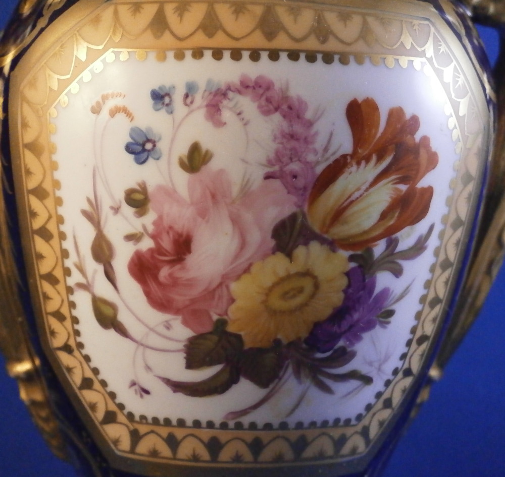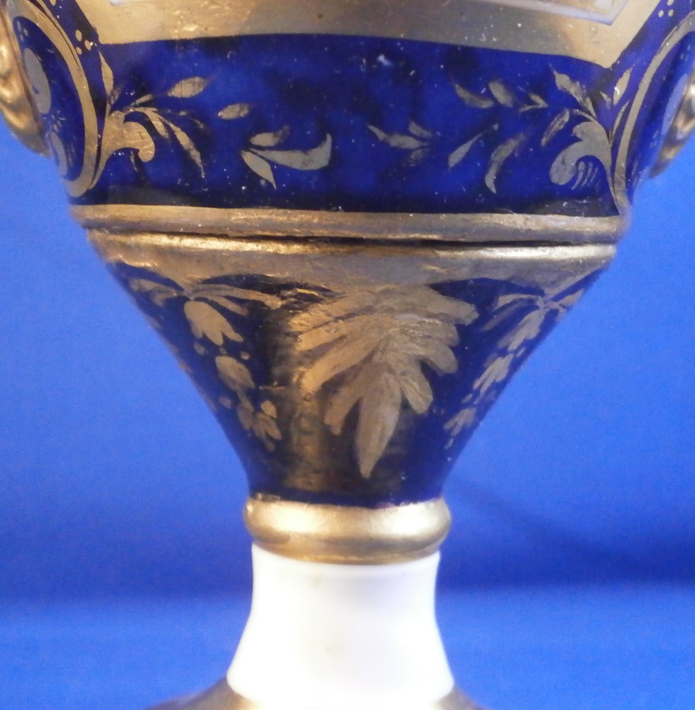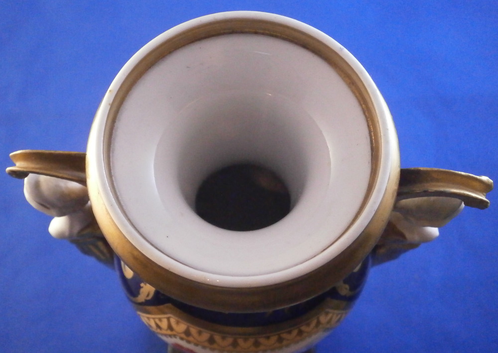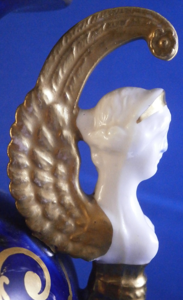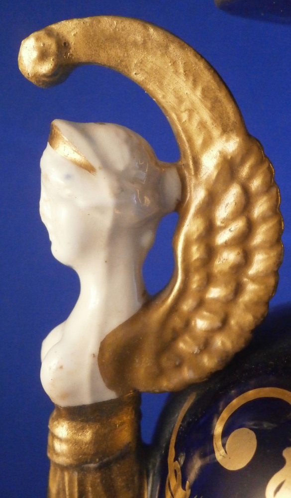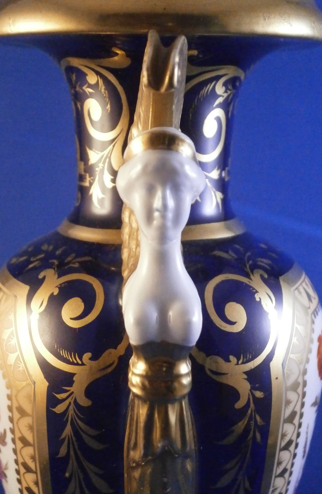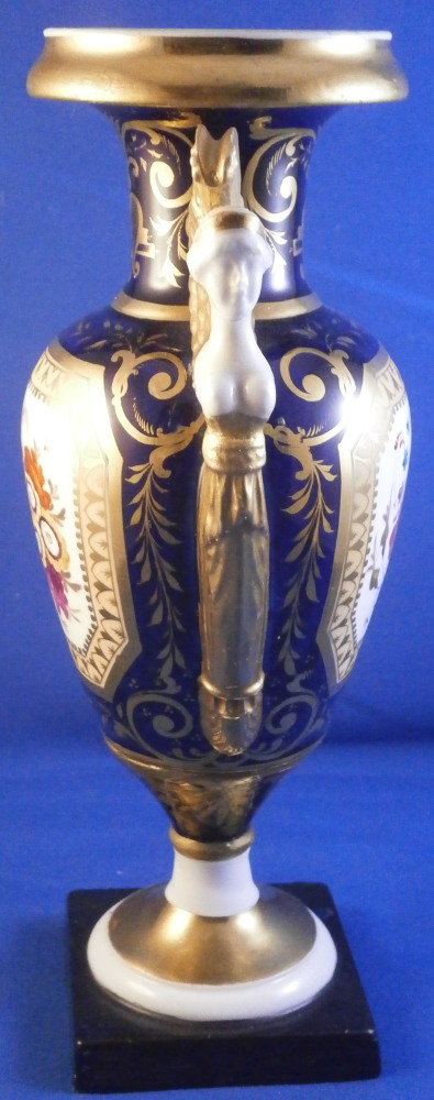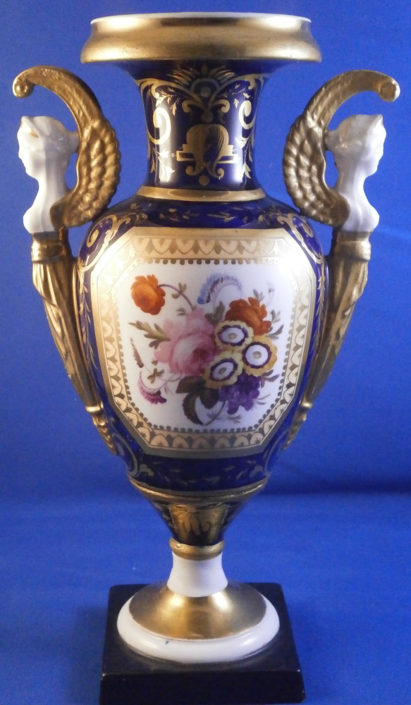 This is a vase made in England in the early 19th century more in the style of French pieces during the Empire period. Not entirely sure who made it but it is marked with an under glaze blue B which I cannot place. Possibly Rockingham or Coalport or any of these types of makers during this period. A really nicely modeled piece that has a nice shape to it and is superbly hand painted. It has two nude lady busts with wings as a handle to either side with the entire piece having deep cobalt blue ground color to it with some nice fancy gilding over that. The front and back each have a nice floral arrangement painted on white ground surrounded by a salmon colored ground with nice gilding to it forming the frame to the flower design. That looks amazing and the quality of the painting is very nice! All in all a superb piece and the cobalt blue with flowers always looks great. One of the best color combinations in the porcelain world I think! The vase is sadly not in the best condition. It displays superbly but one of the handles has been off and the wings have had work done to that handle as well. Almost done perfectly so it does not distract from the piece. The base has been regilded at the thinnest point and the part above that has been restored. That could be done better but does the trick in terms of display. Touch of wear to the gilding but very minor which helpts the piece look so nice! Small flaw from when it was made on top of the black base. The vase is about 8.625 inches tall, 4.5 inches wide including the handles and 3 inches deep. Please email me for more information or other pictures.
