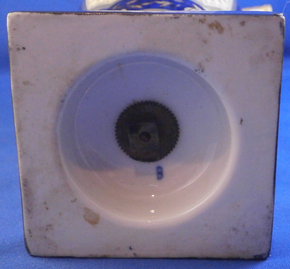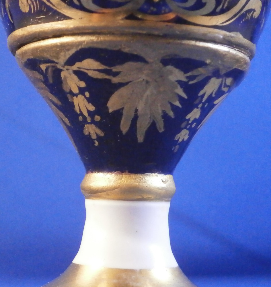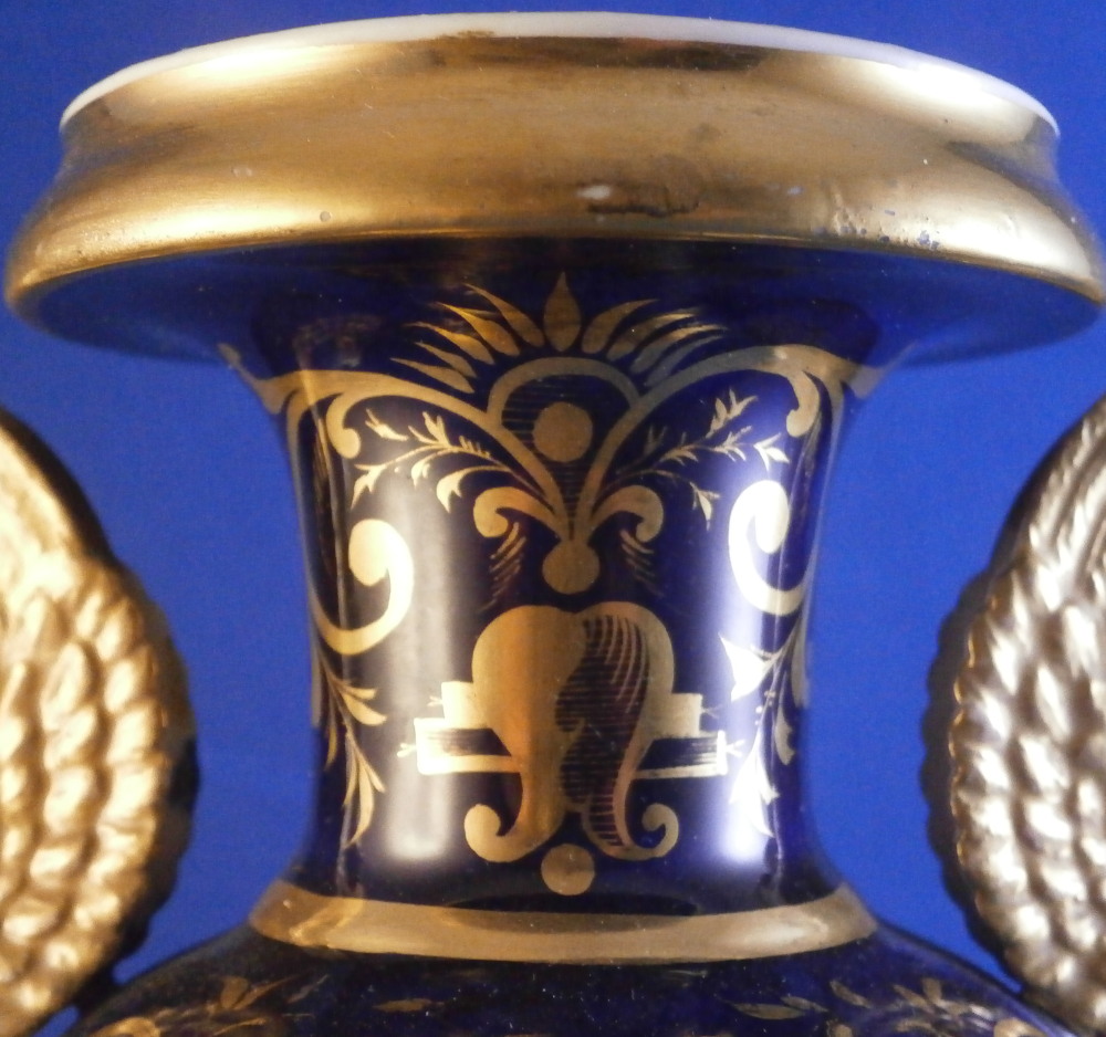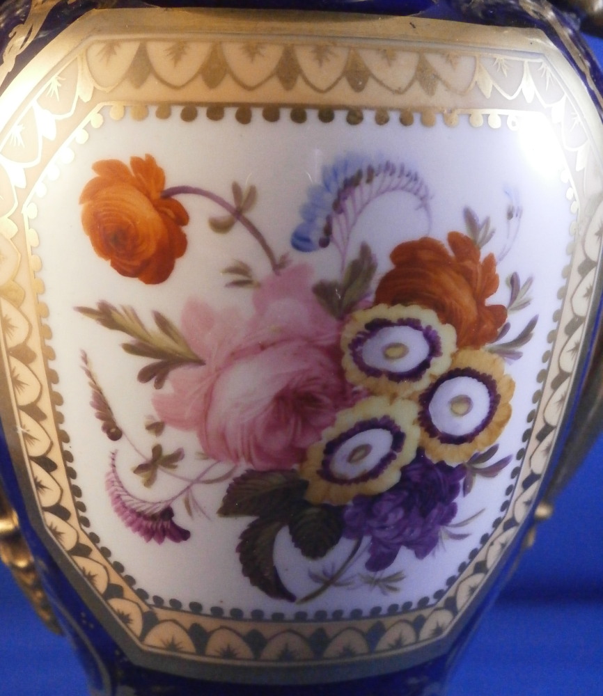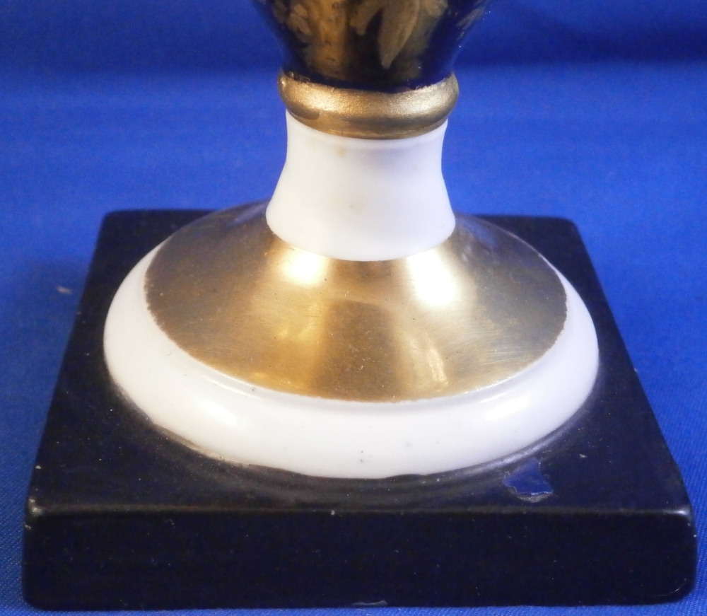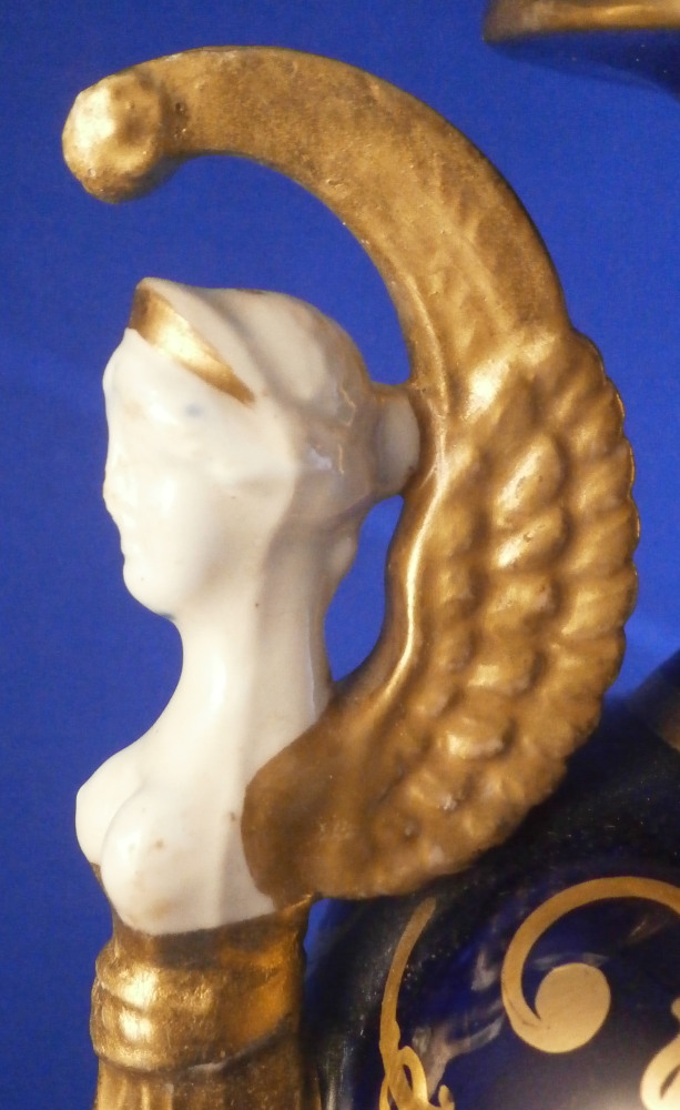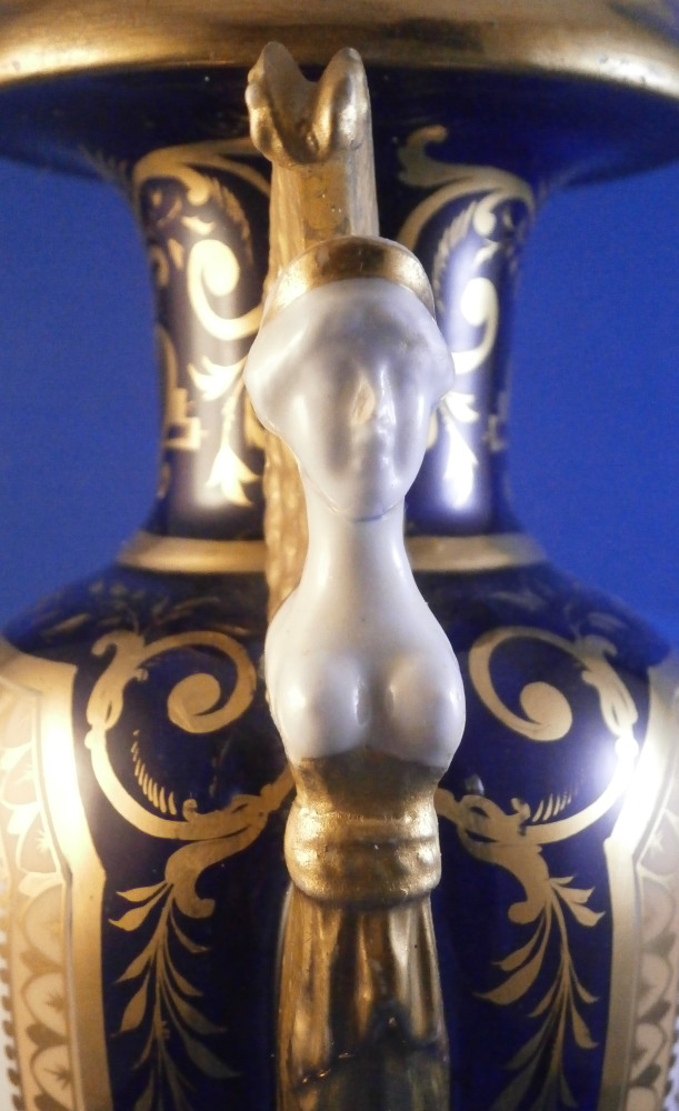 This is a vase made in England in the early 19th century more in the style of French pieces during the Empire period. Not entirely sure who made it but it is marked with an under glaze blue B which I cannot place. Possibly Rockingham or Coalport or any of these types of makers during this period. A really nicely modeled piece that has a nice shape to it and is superbly hand painted. It has two nude lady busts with wings as a handle to either side with the entire piece having deep cobalt blue ground color to it with some nice fancy gilding over that. The front and back each have a nice floral arrangement painted on white ground surrounded by a salmon colored ground with nice gilding to it forming the frame to the flower design. That looks amazing and the quality of the painting is very nice! All in all a superb piece and the cobalt blue with flowers always looks great. One of the best color combinations in the porcelain world I think! The vase is sadly not in the best condition. It displays superbly but one of the handles has been off and the wings have had work done to that handle as well. Almost done perfectly so it does not distract from the piece. The base has been regilded at the thinnest point and the part above that has been restored. That could be done better but does the trick in terms of display. Touch of wear to the gilding but very minor which helpts the piece look so nice! Small flaw from when it was made on top of the black base. The vase is about 8.625 inches tall, 4.5 inches wide including the handles and 3 inches deep. Please email me for more information or other pictures.