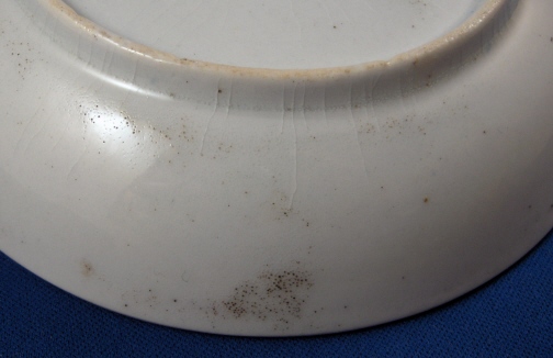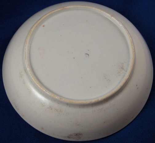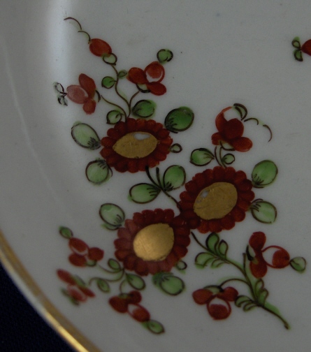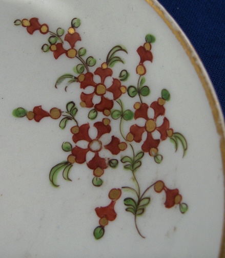 This is a saucer made by one of the smaller English maker - most probably Keeling or Wolfe though I am unsure. It was definitely made in the late 18th century. The saucer is handpainted with a red floral design to it that is a bit strange. Nice gold trim to the edge. The saucer is in great condition with a little wear but nothing bad at all. There is a bit of glaze crazing underneath in the blish glaze as shown as well as some black firing dust on the underside. It is not marked underneath but definitely English and unmarked pieces are very common during this period - actually during all periods of English porcelain :) The piece is 1.125 inches tall and 5.25 inches in diameter. The translucency is shown in the last pic. Please email me for more information or other pictures.