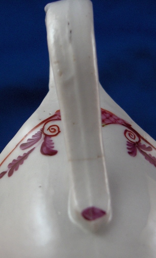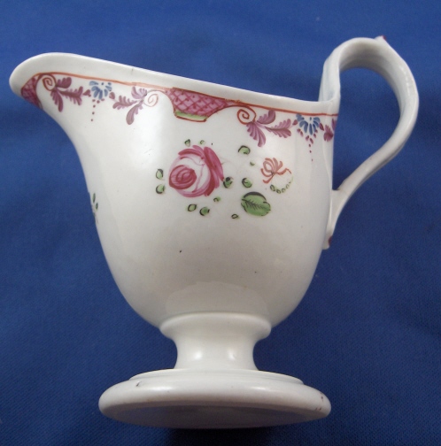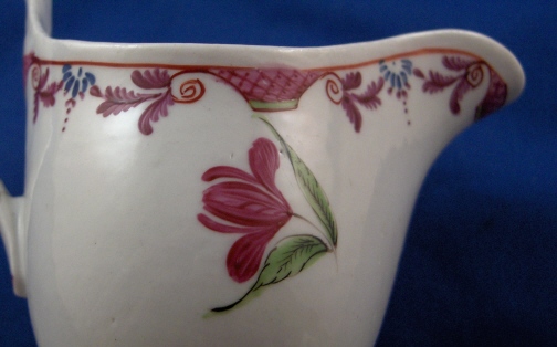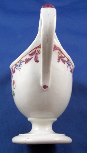 This is a really neat little creamer / jug in the helmet shape made by Keeling around 1795. It is handpainted with some nice flowers as well as a superb rim design and is a shape that is very well liked among collectors! These were also made by New Hall but that 'spur' on top of the handle gives it away as Factory X aka Keeling. The creamer is in great condition with a hairline crack on the bottom of the handle. The piece is unmarked which is very common on English porcelain of this period. It is 4.25 inches tall, 4.5 inches long and 2.375 inches wide. Please email me for more information or other pictures.