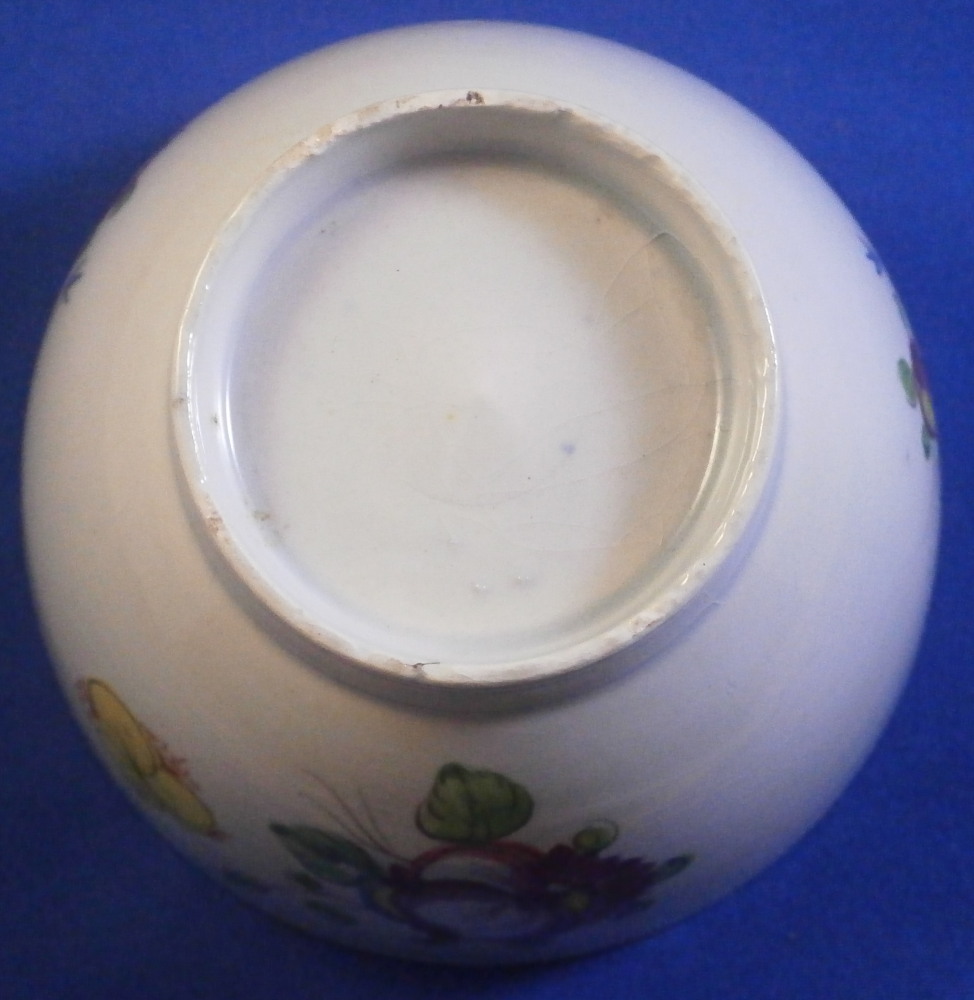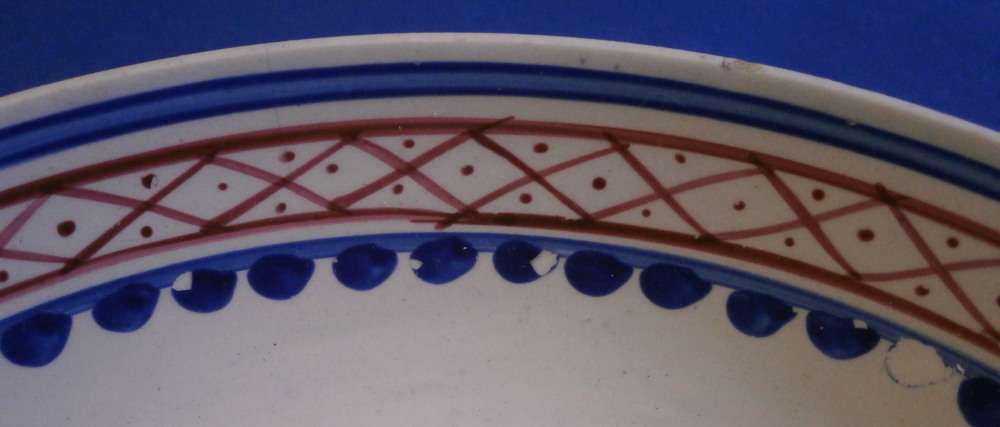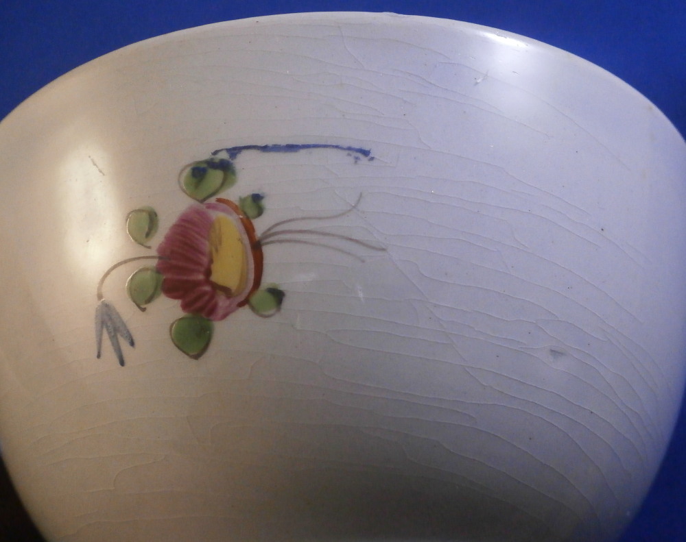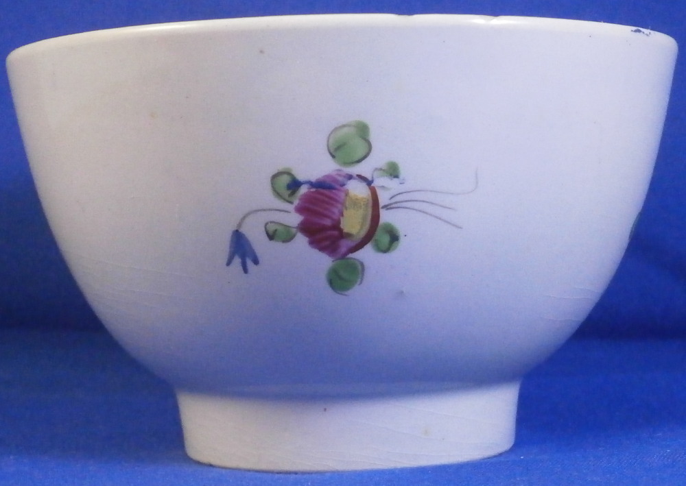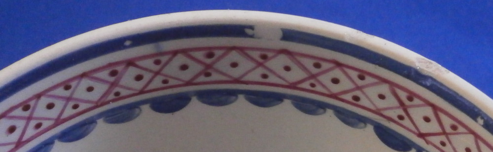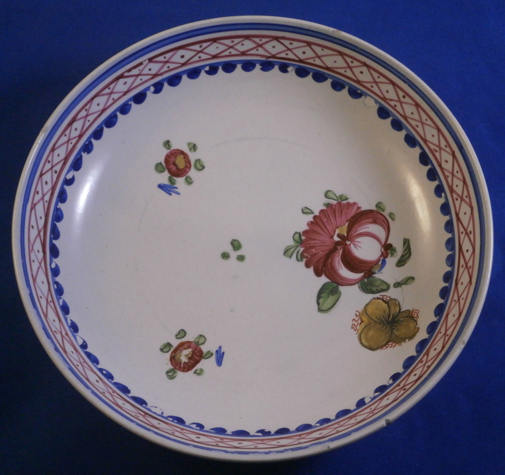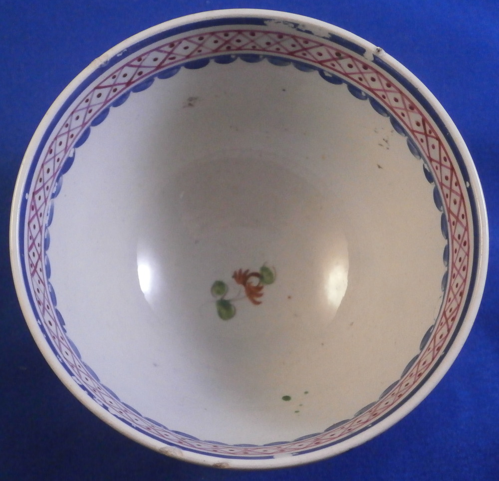 This is a cute teabowl and saucer set made of pearlware in England in the 18th century. I normally stick more to porcelain but every once in a while a non porcelain piece sneaks in. This was the case with the cup & saucer which is very pleasant to look at! The set is hand painted with some colorful flowers and a fancy red and blue trim design along the rim. I think this type of decoration is called King's rose but not entirely sure. The set is of very nice quality and in good condition. There is some flaking to the blue color in places as shown and a few manufacturing flaws from when it was made fairly typical to this type of ware! Also some crazing to the glaze in places but when on display this is not obvious at all. The glaze has a bluish tint to it from which the material gets its name. Otherwsie it is more or less the same as creamware. The saucer is 1.375 inches tall with a diameter of 5.25 inches. The tea bowl is 2 inches tall with a diameter of 3.375 inches. Unmarked as is the norm on this type of ware. Please email me for more information or other pictures.