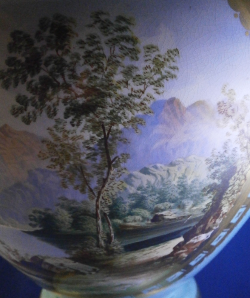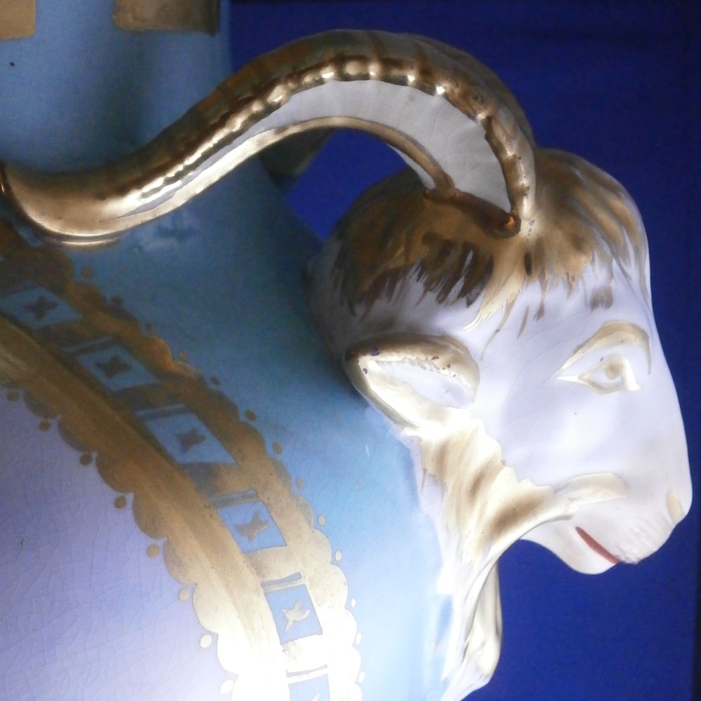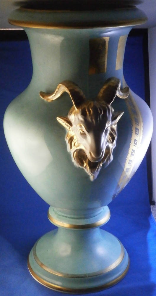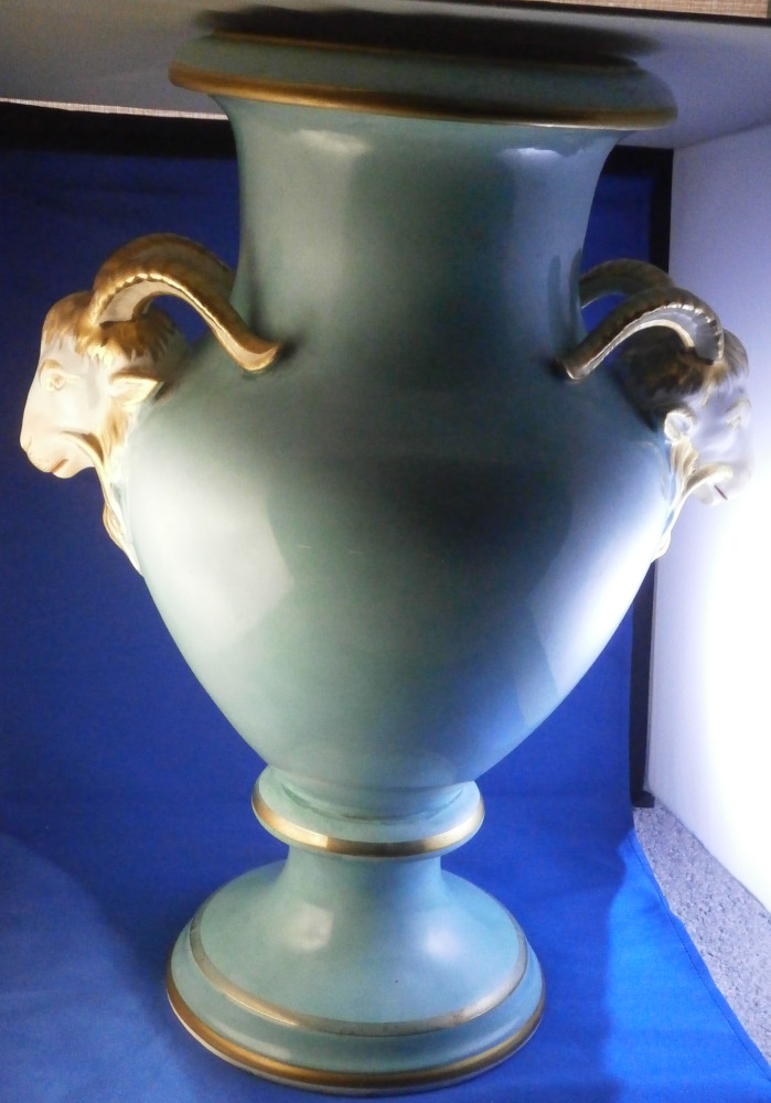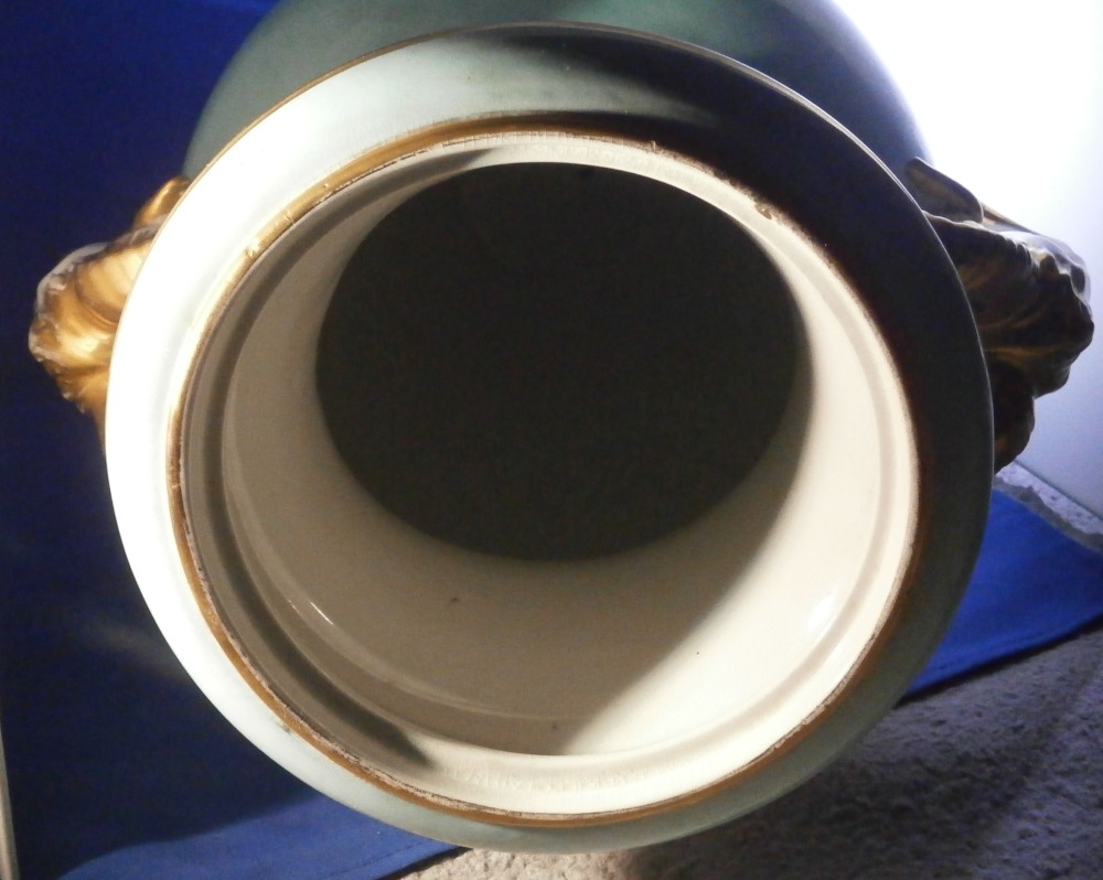 This is a very large and nice vase made in England by an unknown maker probabyl in the later 19th or early 20th century. Not sure who made them. The quality is not top notch but it looks nice and is very decorative. The front has a large hand painted landscape scene to it including a boat on a lake with mountains in the background and greenery and rocks to the sides and foreground. The scene is surrounded by a gold trim with the rest of the vase having a turquoise ground color with a bit more gold trim to it. Each side has a ram's or goat's head handle to it that is nicely modeled with some gold detail to them and a red mouth. The base and main body are one piece not screwed toegther as one see more often on these large pieces. The piece is in good condition with crazing throughout common to English pieces, some wear to the gilding a couple of minor scratches and a few discolorations and flaws that are from when it was made mostly and the top inside has a ring that might mean it once had a lid which I do not have but all in all a very nice looking and decorative vase. I have a matching second vase I will add to the site if anyone is interested in a pair with a different scene. Unmarked or possibly marked as shown but not clear enough to figure it out. Looks to be a letter and some numbers sort of like English pattern numbers. Please email me for more information or other pictures.