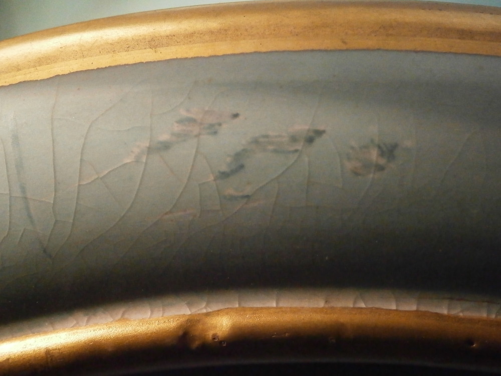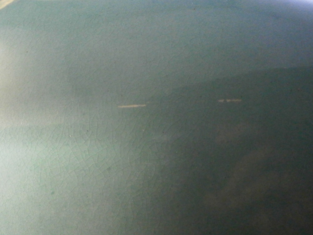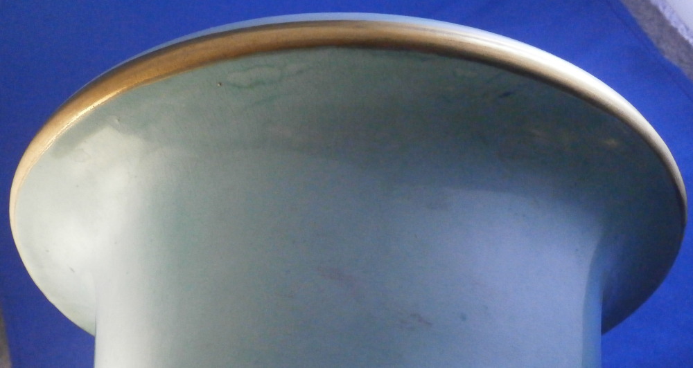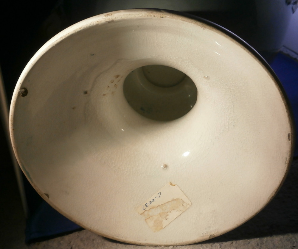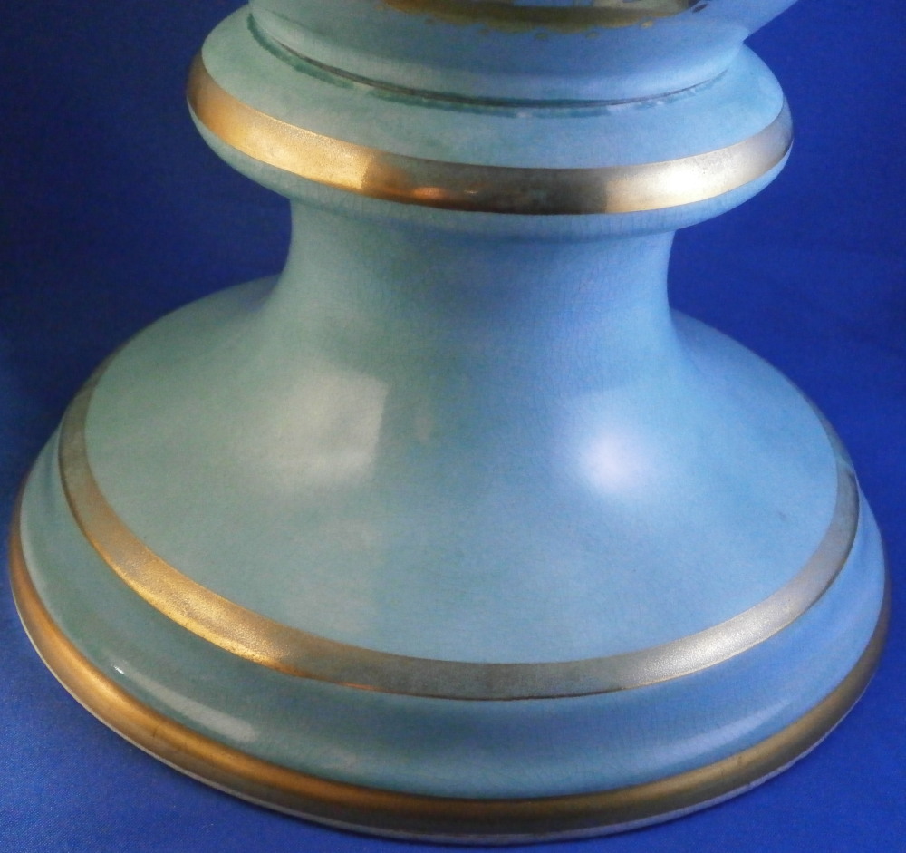 This is a very large and nice vase made in England by an unknown maker probabyl in the later 19th or early 20th century. Not sure who made them. The quality is not top notch but it looks nice and is very decorative. The front has a large hand painted landscape scene to it including a boat on a lake with mountains in the background and greenery and rocks to the sides and foreground. The scene is surrounded by a gold trim with the rest of the vase having a turquoise ground color with a bit more gold trim to it. Each side has a ram's or goat's head handle to it that is nicely modeled with some gold detail to them and a red mouth. The base and main body are one piece not screwed toegther as one see more often on these large pieces. The piece is in good condition with crazing throughout common to English pieces, some wear to the gilding a couple of minor scratches and a few discolorations and flaws that are from when it was made mostly and the top inside has a ring that might mean it once had a lid which I do not have but all in all a very nice looking and decorative vase. I have a matching second vase I will add to the site if anyone is interested in a pair with a different scene. Unmarked or possibly marked as shown but not clear enough to figure it out. Looks to be a letter and some numbers sort of like English pattern numbers. Please email me for more information or other pictures.