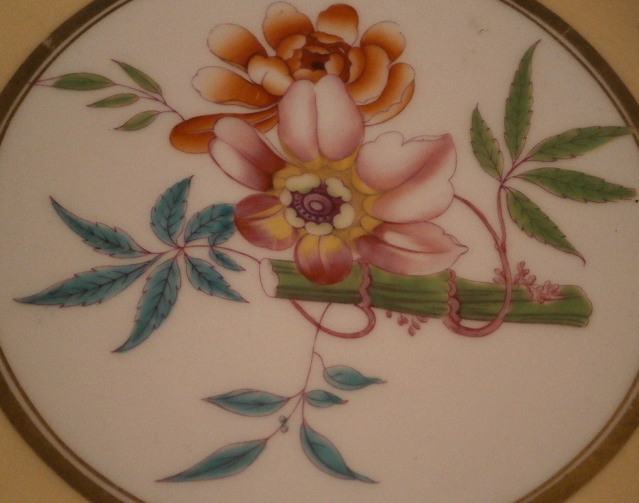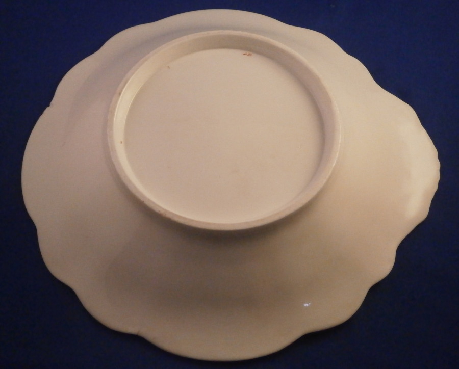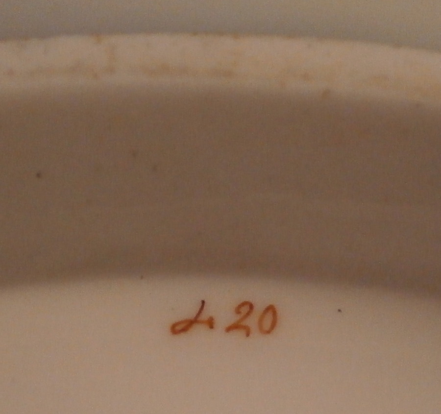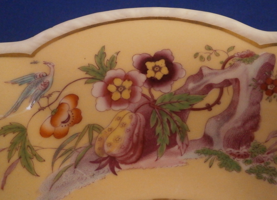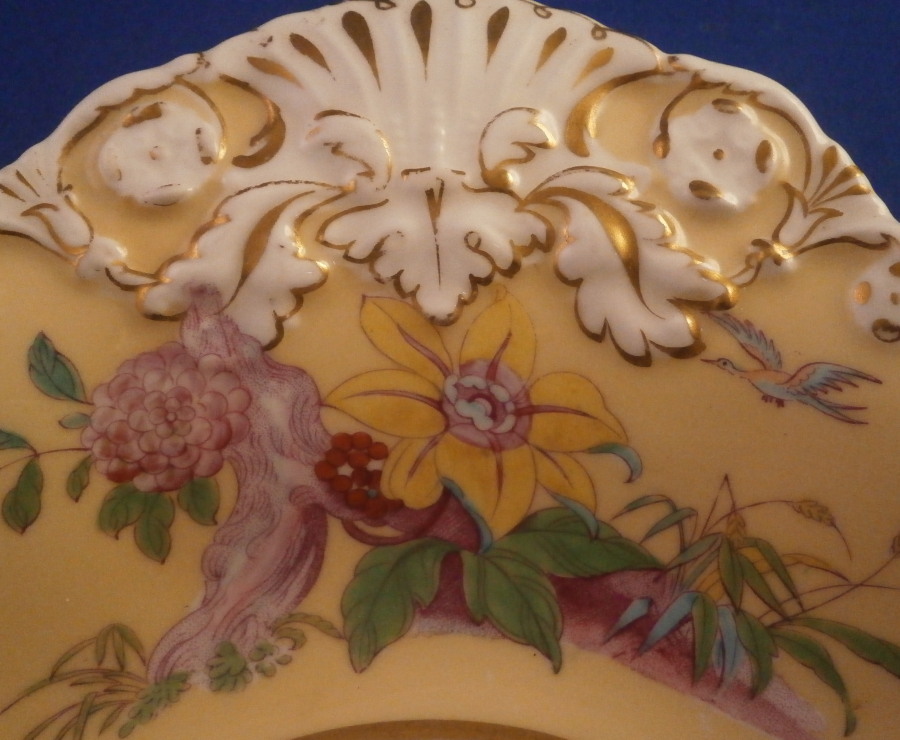 This is a really nice serving or dessert dish made in England in the early 19th century. I could not find another piece like it so I am unsure as to the maker. Love the pattern! The piece has a nice shape to it wwith a relief design to the edge and a handle to one side highlighted with gilding. The rim of the plate has a yellowish ground color to it with four different colorful designs over it with another design in the center on white ground. The designs seems to be printed in puce and then hand painted over that with some of the other colors to give it more depth. Companies like Ridgway , Daniel , Davenport , Coalport or possibly Copeland come to mind and maybe someone out there knows and could shoot me an email. I would certainly appreciate it! A really nice looking piece! The dish is marked underneath with a pattern number in red (I think it says 420) as well as what looks to be an artist mark. Unmarked pieces are fairly normal during this period of English porcelain. The dish is in great condition with two small chips to the edge right next to one another and mostly on the underside as shown with jus a bit visible from the top. There is also an old firing crack to the edge as shown from when the dish was made. Minor touch of gold wear as well. The dish is 1.75 inches tall, 9.5 inches wide and 9 inches deep. Please email me for more information or other pictures.