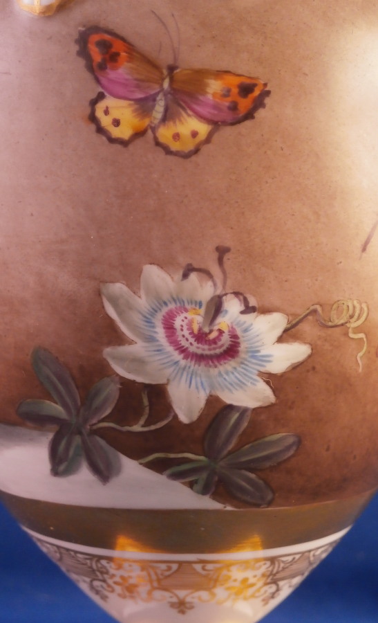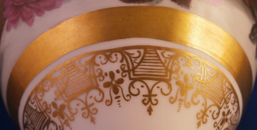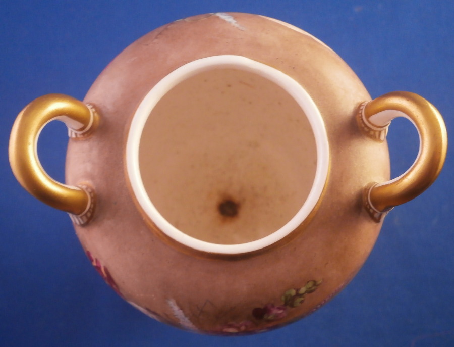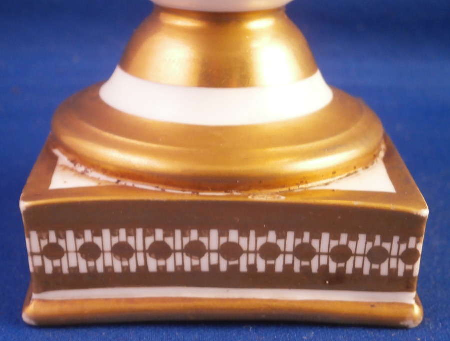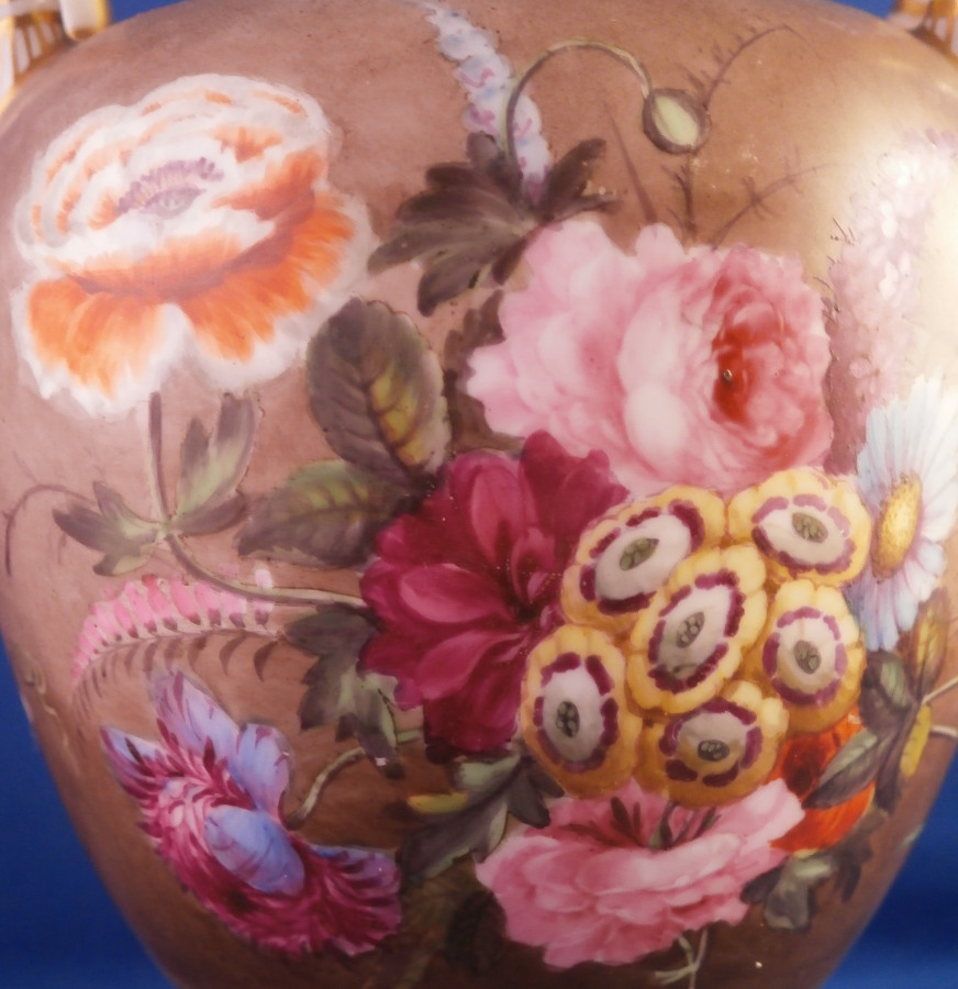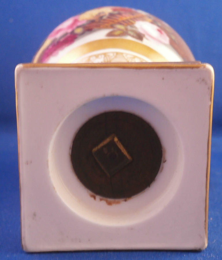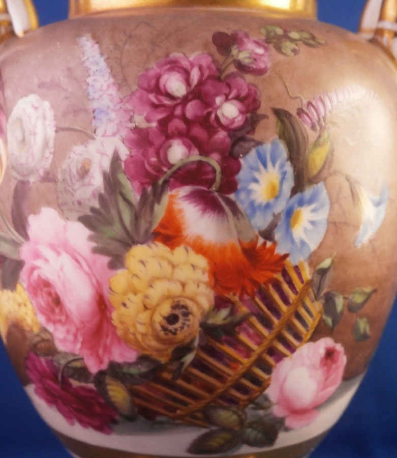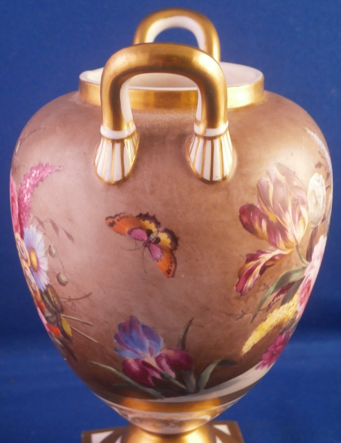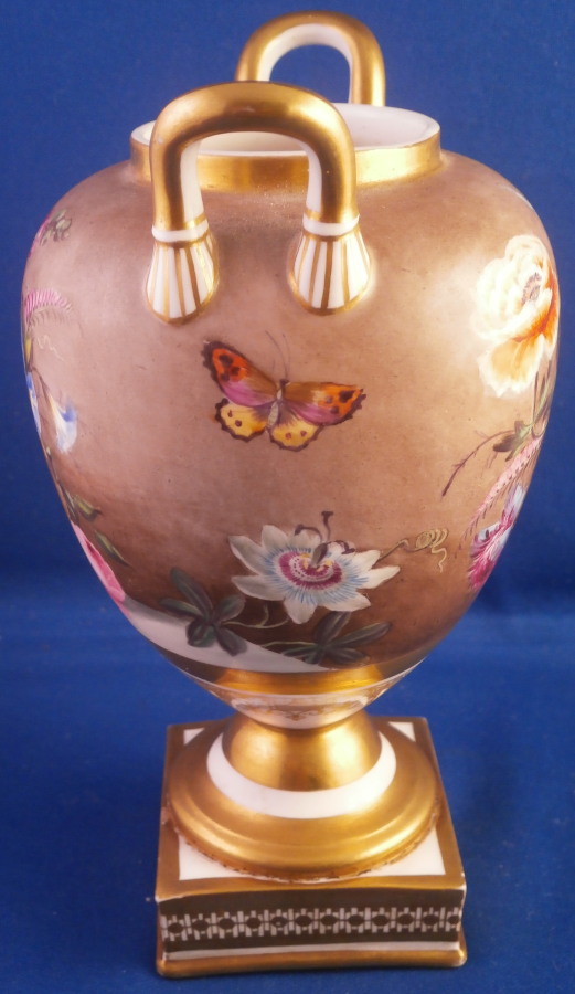 This is a really nice little vase made in England around 1830. I personally think it might ahve been done by Edwin Steel at Rockingham but it could be by any number of artists in this style by different makers. Really hard to tell. Eithe way it is a superb little piece. It has a nice shape with a handle to either side, a round foot attached to a square base ith some nice gold trim to it but by far the best part is the painting to the main body. It has a brown ground that is darker towards the bottom and fading towards the top with some amazing flowers hand painted on it. One side has a fallen over basket fileld with flwoers on top of a table while the other has a superb floral arrangement. Each side has a really nice single flower with a butterfly over it. Underneath teh scene is a fancy gold trim. Really a stunning vase and it doesn't come much nicer than this. Only thing working against it maybe is the size but it is easy to display than a giant piece. The vase is in superb condition with a two uneven spots to the top edge from when it was made - both a glazed over and where the round foot attaches to the base some of the gilding right where they eet has come undone a bit. It doesn't take away from the piece at all! Very minor touch of wear to the corners of the base. The vase is about 6.25 inches tall including the handles, 3.875 inches wide including the handles and 3.5 inches deep. Not marked but that is pretty normal! Please email me for more information or other pictures.