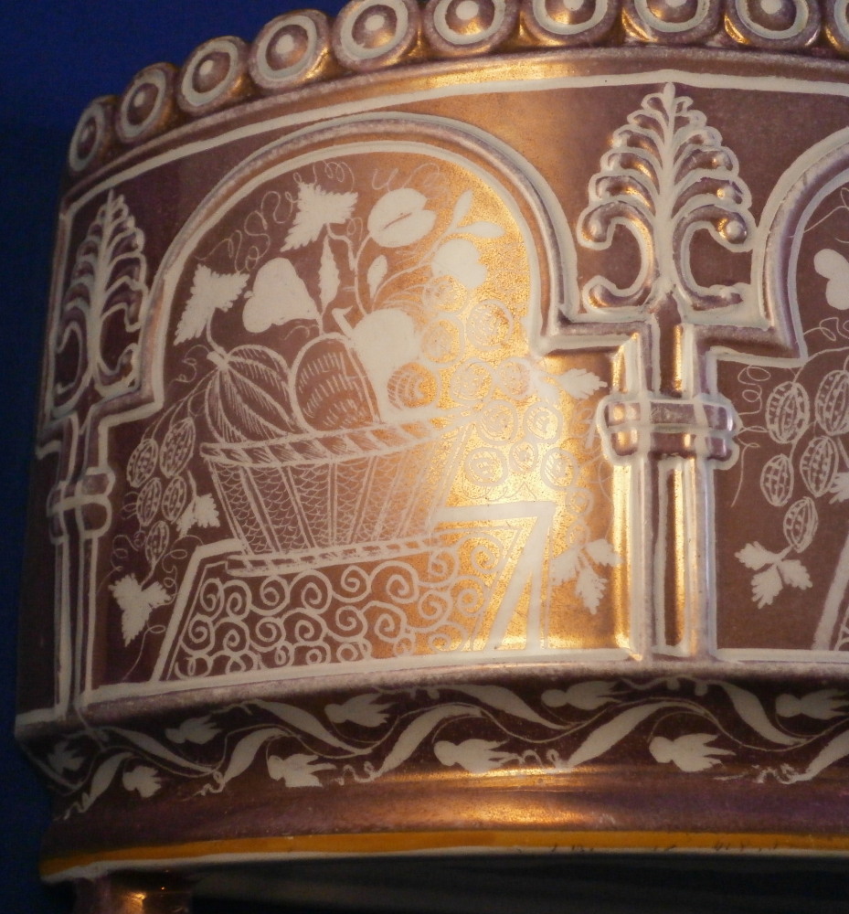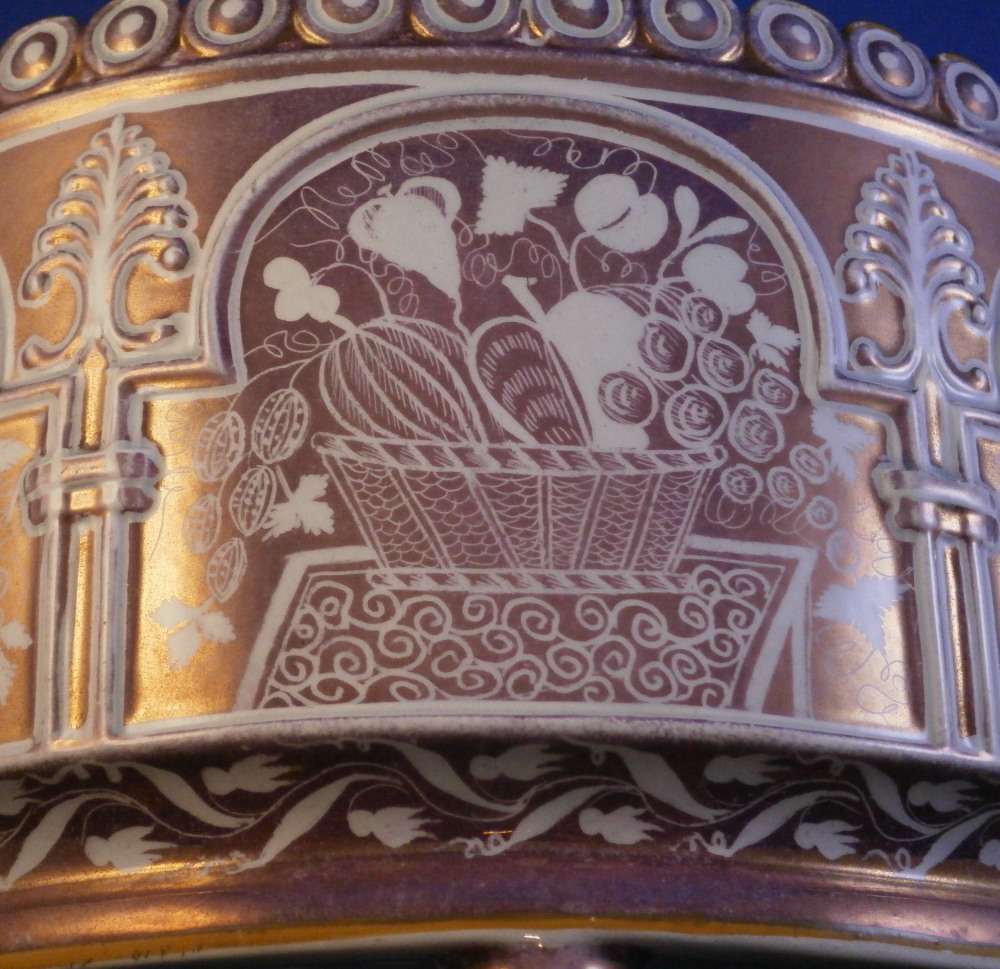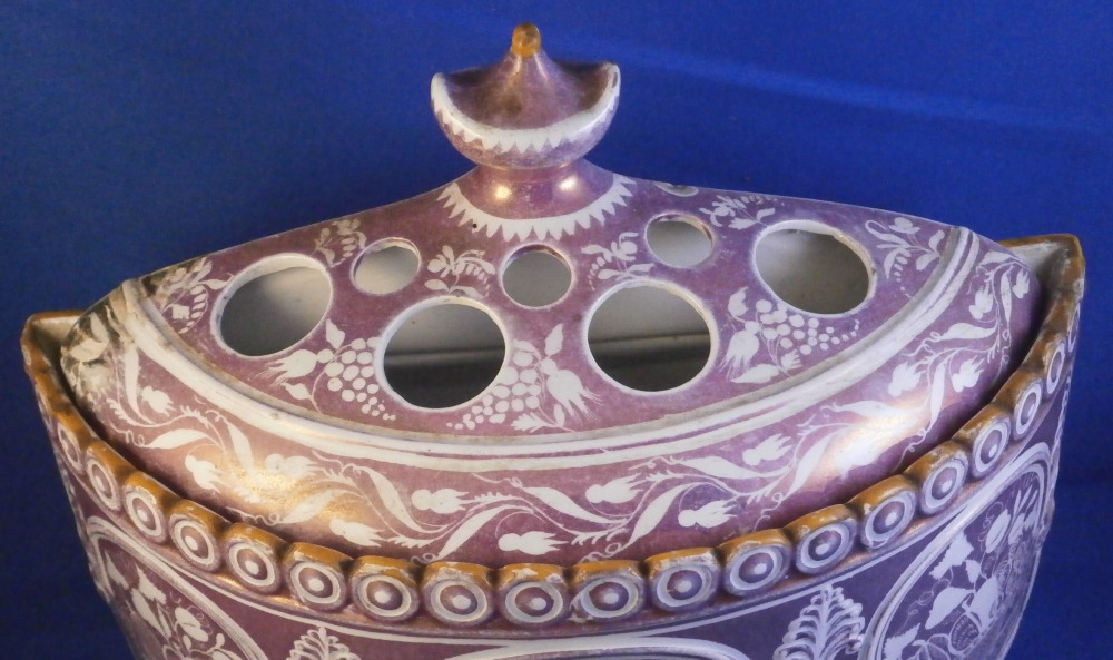 This is a superb bough or bulb pot made by in England in the early 19th century. It is a piece of Sunderland pearlware that is decorated superbly with their famous pink luster color. It comes with its original lid which is a treat as they were lost oftentimes. I could only find one other example of this piece that recently sold at Christie's. The main body has a relief design to it in the form of columns holding up arches with a decorative leaf desig over the columns. The space under the arches is decorated with baskets filled with fruit and vegetables sitting on tables. Nice circular rim design around the top rim and the typical bun feet at the bottom. The lid has a floral and possible bunches of grapes design to it and a nicely shaped finial. The pink lustre makes the whole piece just that much more fun! Bough pots like this were often made with flat backs to stand against the wall or to be used back to back with another piece to form a circular display as a centre piece on a table. They were made for upper class homes and would have looked amazing with the flowering bulbs in the spring and twigs and dried grasses the rest of the year. The piece is unmarked but identified as Sunderland pearlware by Christie's so that's probably correct. The bulb pot is 7.5 inches tall including the finial, 8.5 inches wide and 3.25 inches deep. The body is in superb condition with just a touch of wear. The lid has a small chip to the top back and a corner has been restored in the pastand discolored since. Could be done better but does not look terrible either. It's a rare and fun piece! Please email me for more information or other pictures.