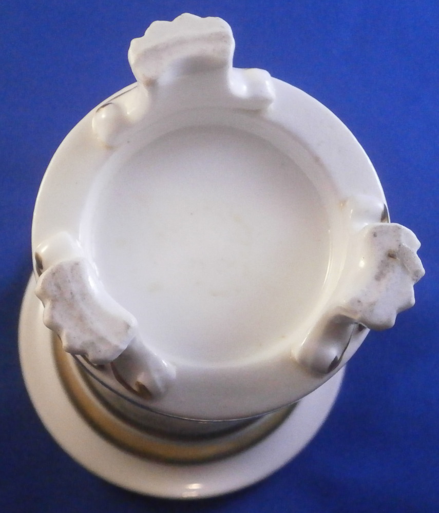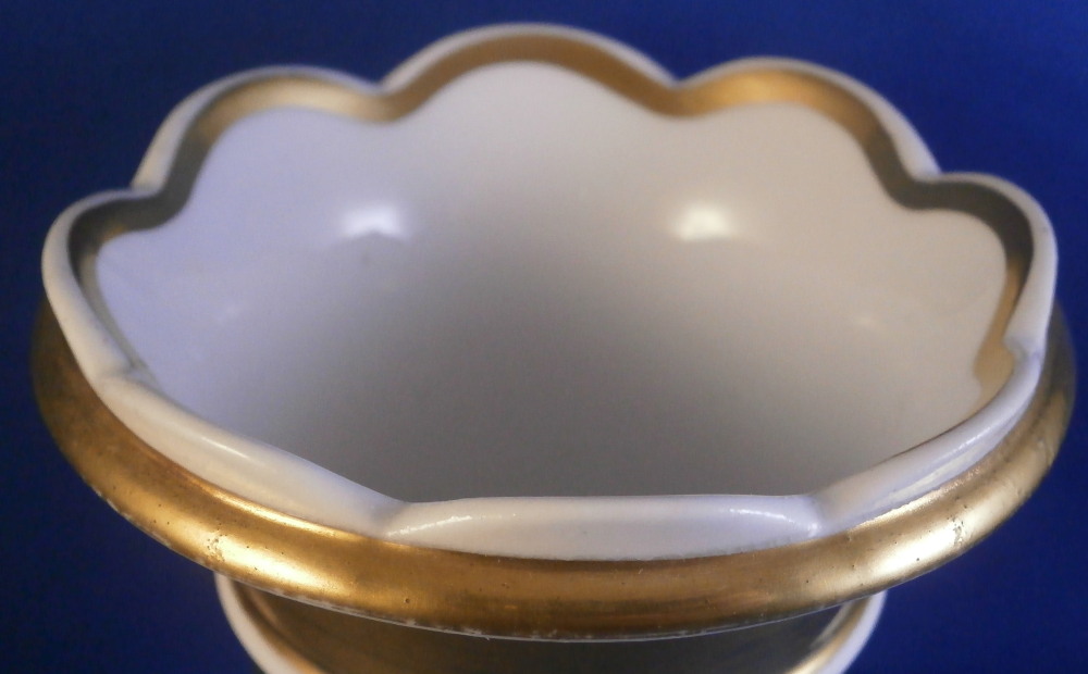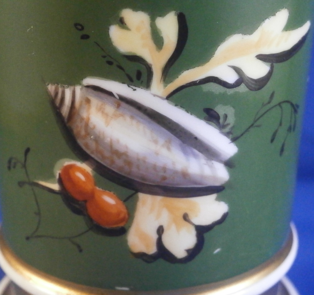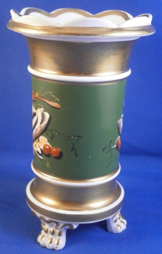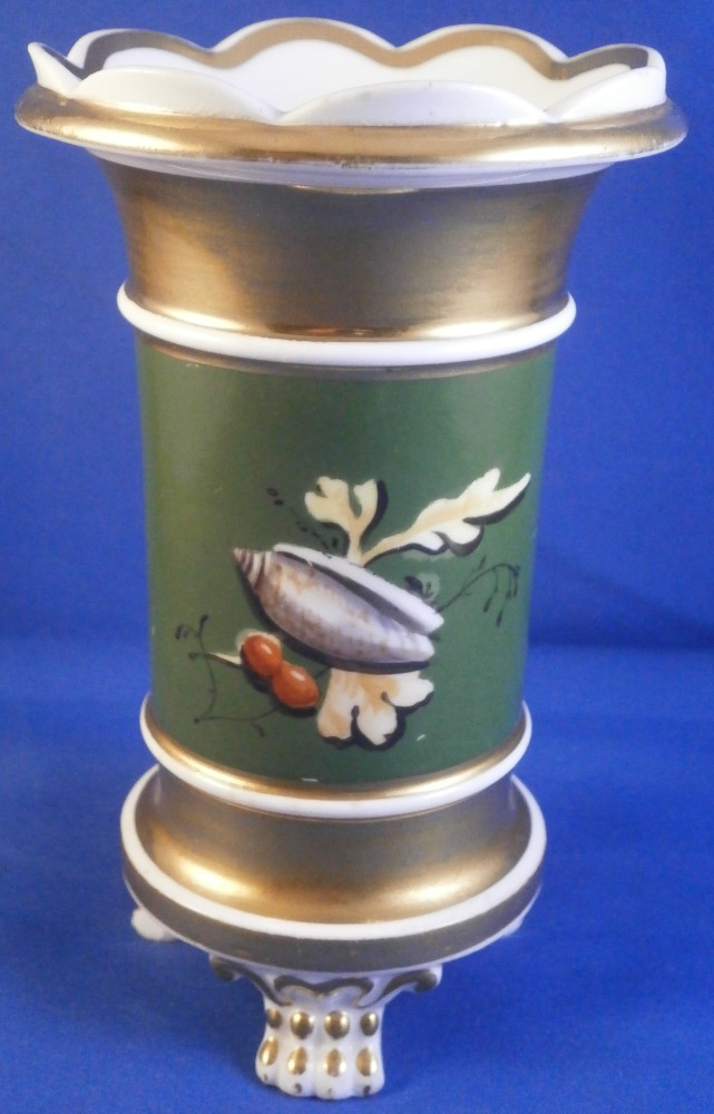 This is a really fun spill vase made in England around the early 19th century. I am unsure as to an exact maker as I could not find this exact shape anywhere but it is definitely English from this period. A spill vase / holder is a small traditional or wall-hanging vase for containing small pieces of wood for transferring fire to use to light a candle or pipe from a lit fire. This example here is probably from the Staffordshire region. It has a nice shape to it with a wonderful top rim and is sitting on three claw feet. The center is a bit unusual as it is hand painted with a sea shell design including seashells as well as seaweed all on an olive green ground color. Lots of gilding throughout! A really nice example and this is the smaller one with another matching larger one up for sale as well on the site. The piece is in great condition with two or three tiny scratches and manufacturing flaws in terms of tiny black firing spots as well as some inclusions to the paste to the bottom inside. A touch of gold wear to the top very outer rim edge and some very hard to spot light crazing to the top underside rim. Displays perfectly and looks amazing! The piece is not marked which is fairly normal on English wares from this period! It is 5.125 inches tall with a top diameter of 3.125 inches. Please email me for more information or other pictures.