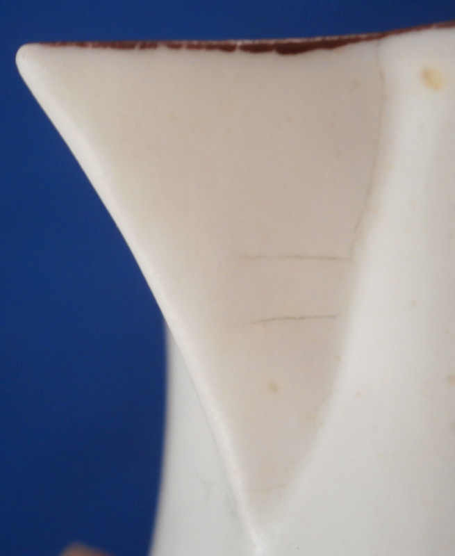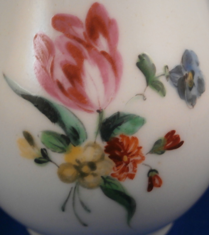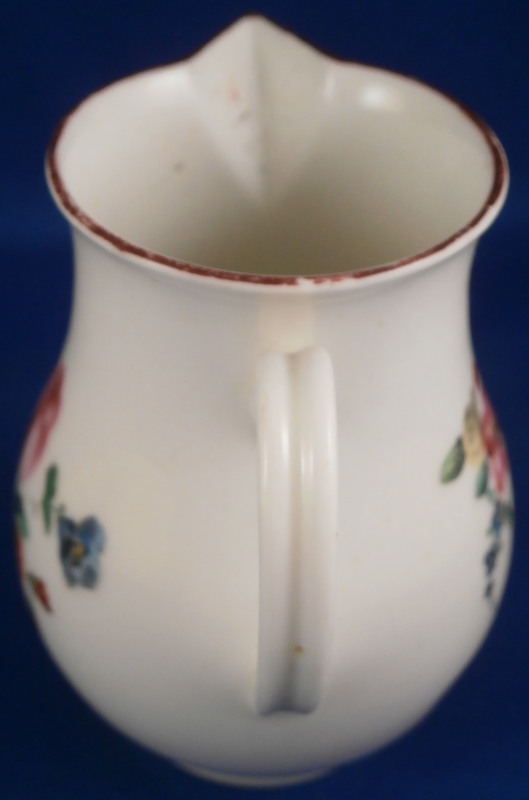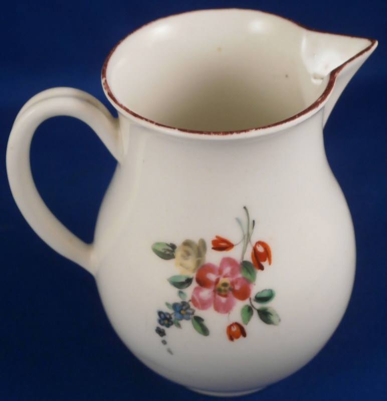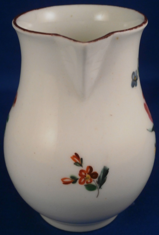 This is a fun little sparrow beak creamer definitely made in England in the 18th century. The shape leads me to believe it was made by Worcester but the quality of the flowers and the brown trim kind of make me question that one so I am not certain who made it. The jug is hand painted with a larger polychrome floral arrangement to one side, a smaller arrangement to the other side and two single flowers to fill in the rest of the piece. Nice handle with a groove to it. The piece is in perfect condition but has some lines on the spout from the making and under the glaze. Some kind of manufacturing flaw that doesn't take away from the piece! The creamer is not marked which is the norm! It is 3.375 inches tall with a diameter of about 2.375 inches. Really nice piece! Please email me for more information or other pictures.