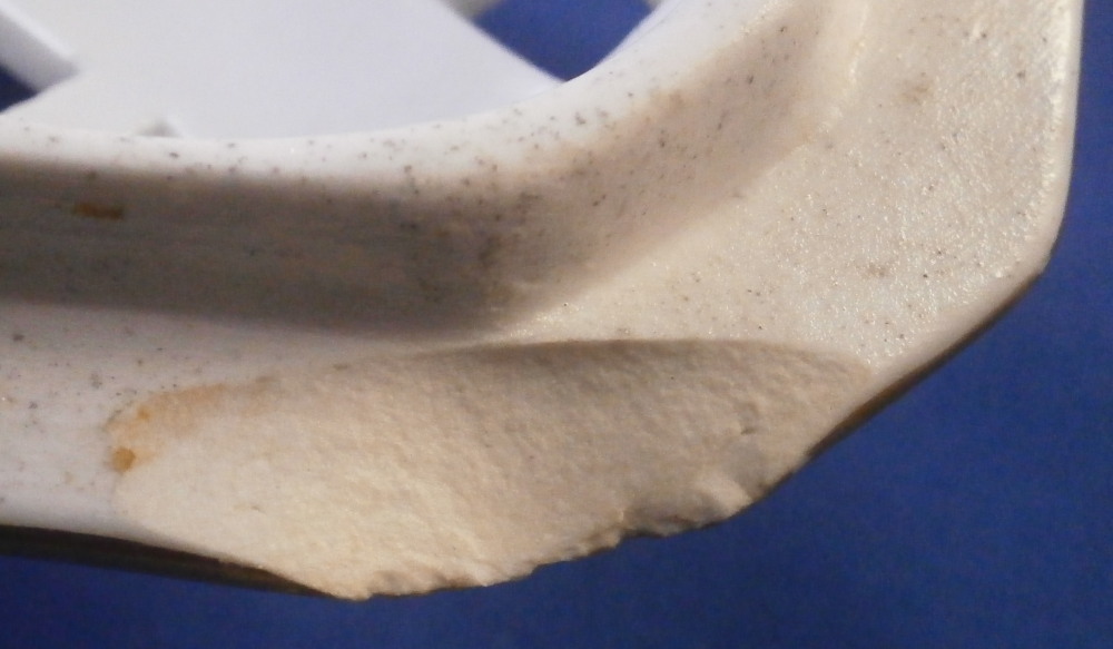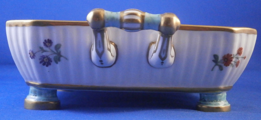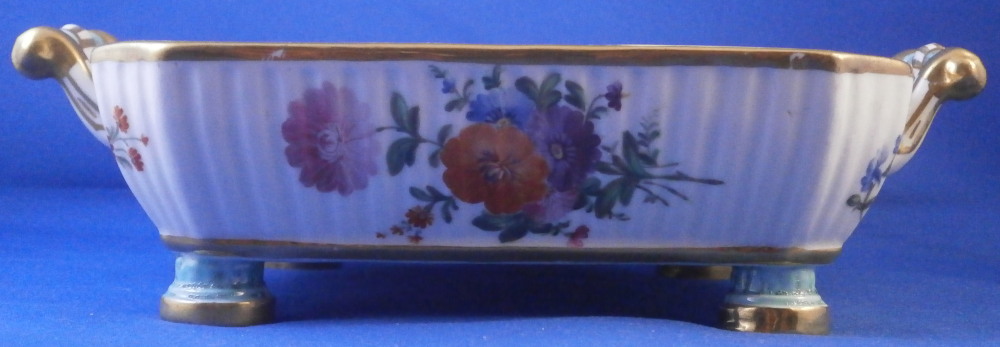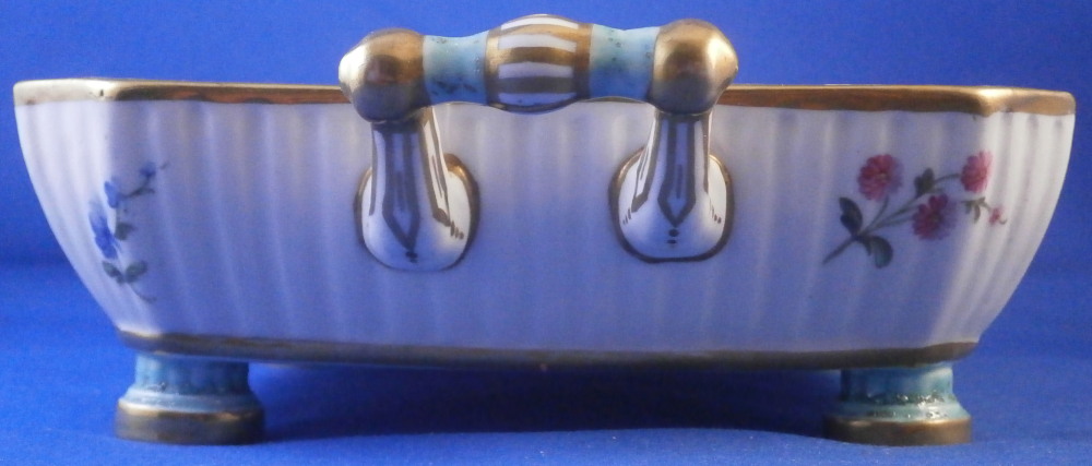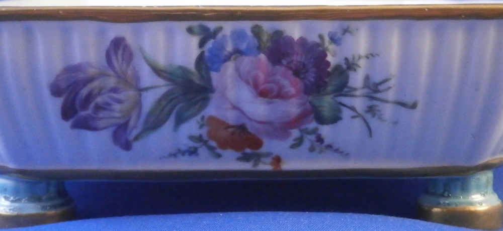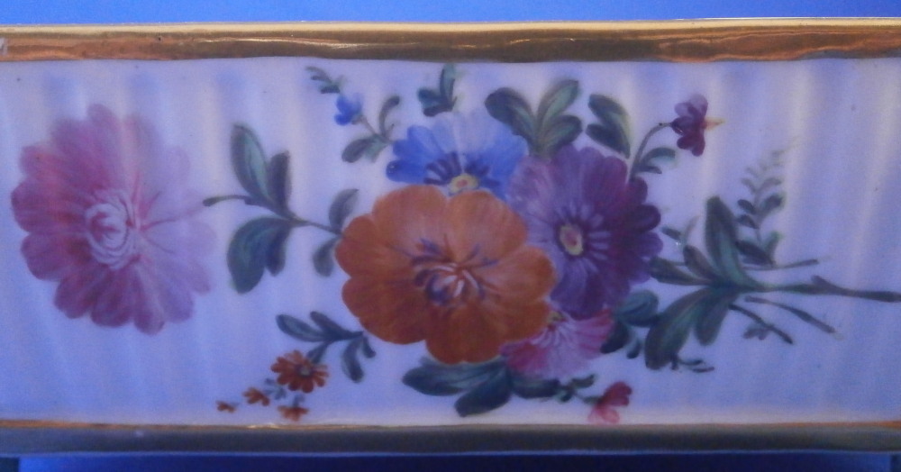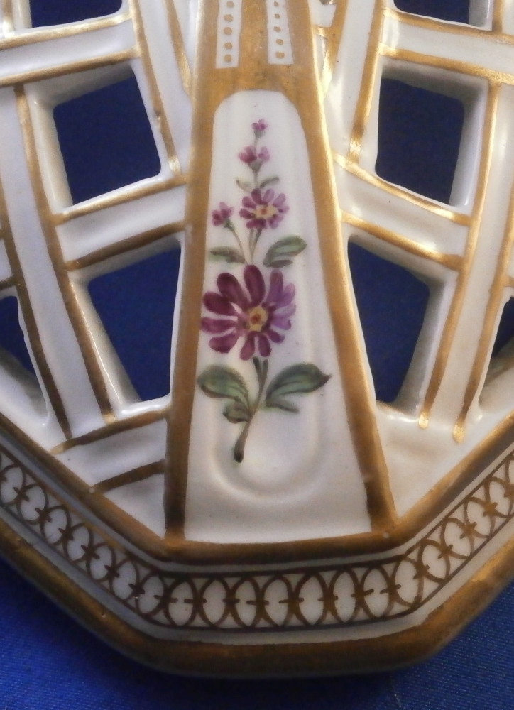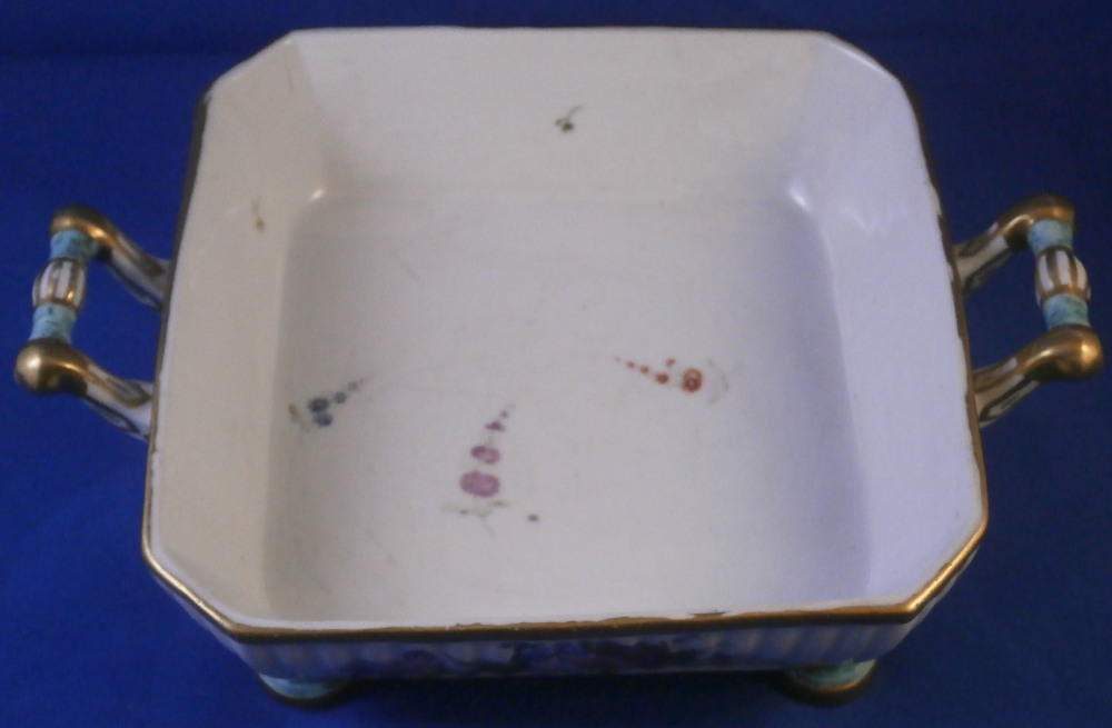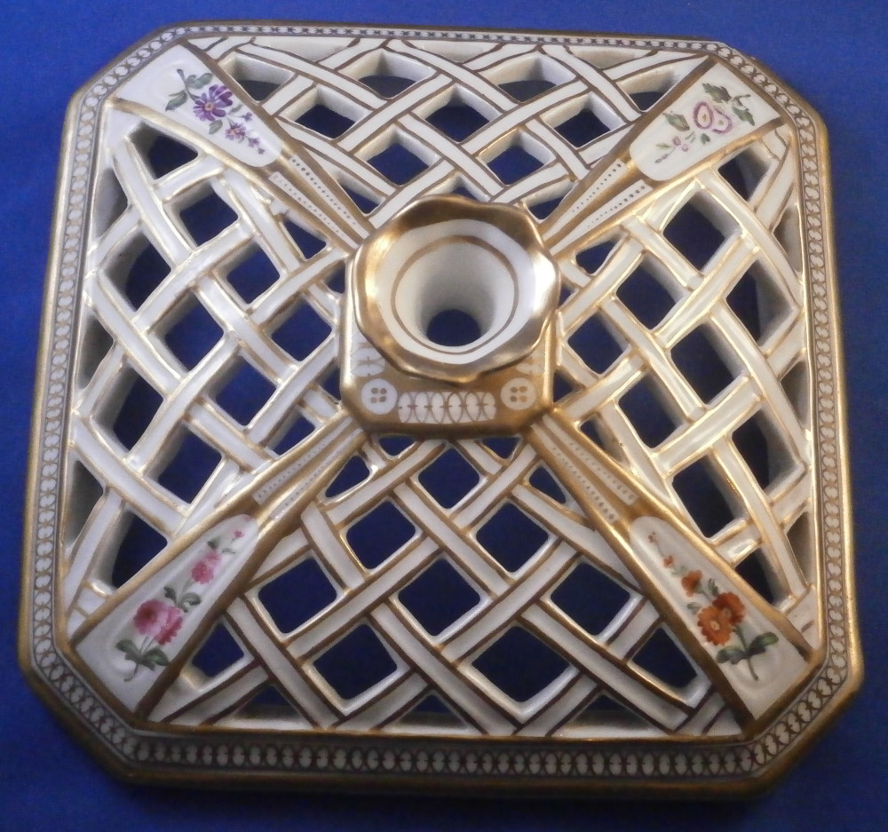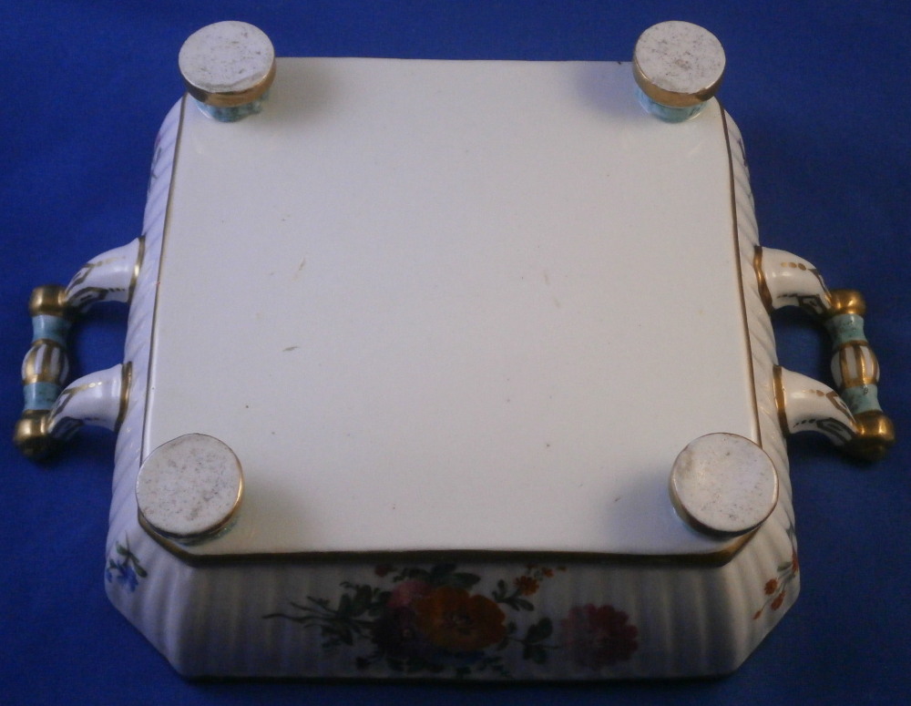 This is an interesting lidded dish definitely made in England probably around 1830. I have never seen this shape so I ahve no idea on the actual maker or what type of dish it is. It could be a potpourri dish but that doesn't seem right, maybe a late chestnut basket or even some sort of flower arrangement frog type dish. Not sure. Either way it is a neat piece of porcelain. The main body has a square shape to it with a nice handle to each side. The insode is decorated with a couple of hand painted signle flowers. The outside has a nice hand painted floral arrangement to the front and back wtih two small single flowers to each side. It has a reeded pattern to the paste. Golg trim to the top and bottom edge and it sits on four feet with a turquoise and gold trim to them. The lid is reticulated with the knob having a hole in the center. Lots of gold trim and a floral design to thech corner. A really nicely decorated dish that looks stunning! The piece is in great condition with the flowers on the inside quite worn which means it was used regularly, The rest has very minimal wear if any but there is a large chip to one of the corners of the lid. Mainly visible from the underside as shown. Unmarked which makes it that much harder to ID but definitely from England around 1830. It is 4.125 inches tall and 5.75 inches square with the handles sticking out about 0.75 inches. Please email me for more information or other pictures.