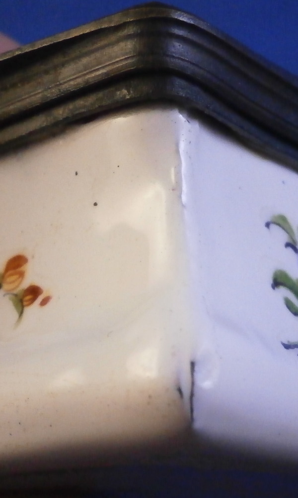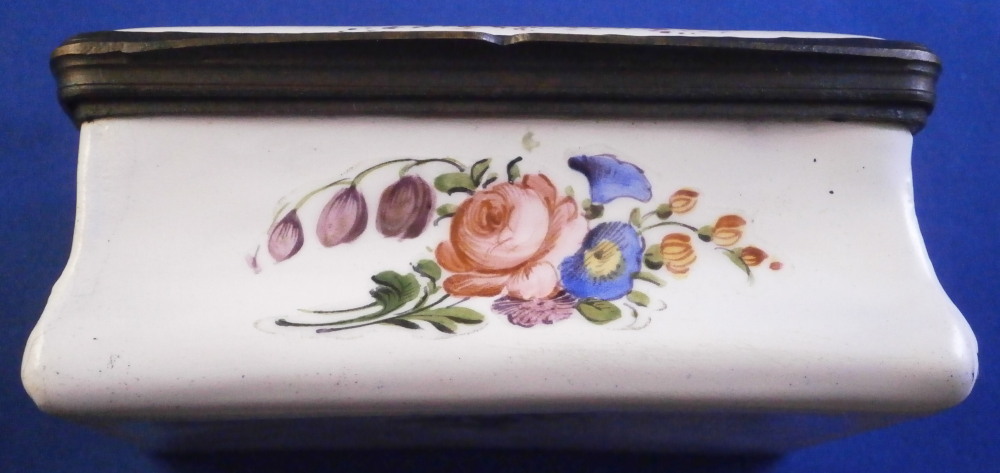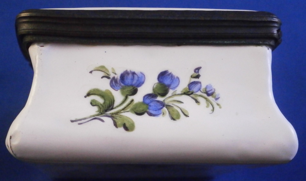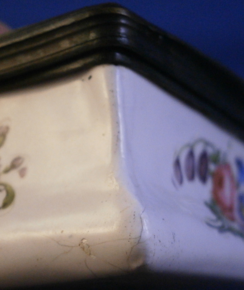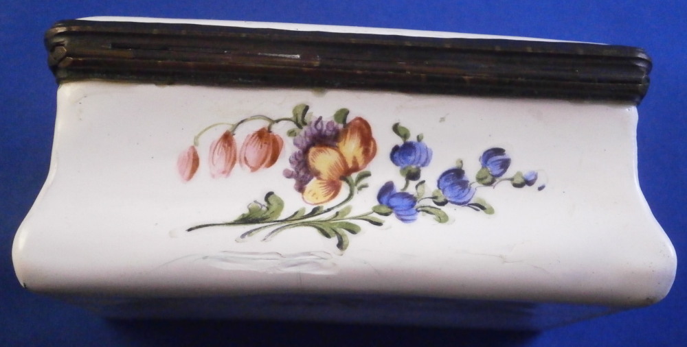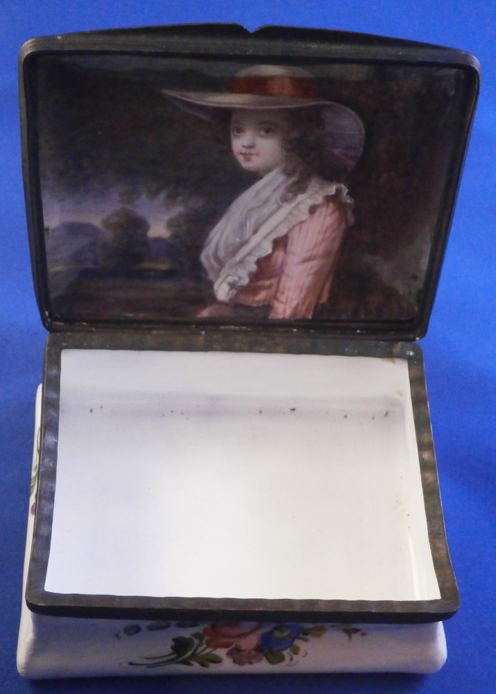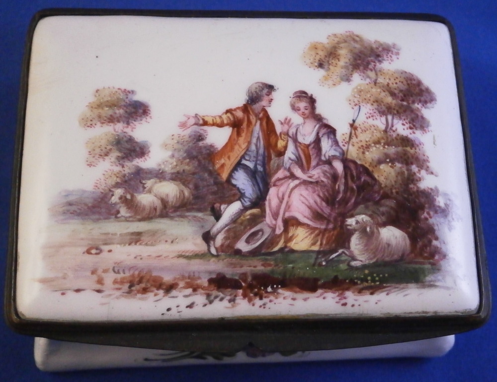 This is a nice larger box made in England - probably in the South Staffordshire region - in the late 18th century. Probably in the Bilston area or possibly Birmingham or even London but definitely English from the 1700s. They are famous for their Battersea enamel boxes, etc. Not sure if this would be considered a patch box or tabatiere / snuff / pill box but either way it is a fun piece! Larger than many one sees. The box is decorated on the outside lid with a superb hand painted Watteau style scene to the top including a couple in a landscape surrounding with some sheep. A very well done scene! The sides of the box each have flowers to them - a nice floral arrangement to the front and back with smaller single flowers to the sides. The udnerside has a little flwoer to it as well. My favorite part however is the portrait of a lady to the inside lid. it is very nicely painted with the lady wearing a pink top with a white lace blouse and a large hat with a bit of a landscape surrounding in the background. The metal mounts are copper I believe though heavily tarnished from age which is the norm.. The box is in great condition - it displays perfectly but has some minimal damage to the corners and an area on the back side where the enamel must have been lost which was painted over white to hide it well. I think one of the corners was worked on as well but it is hard to tell. General wear on the bottom from age. Either way in better condition than most one comes across and off a nice size with some really nice decorations to it. The lid closes well and stays shut. All in all a great example! The box is 1.5 inches tall, just under 3.5 inches wide and 2.625 inches deep. Please email me for more information or other pictures.