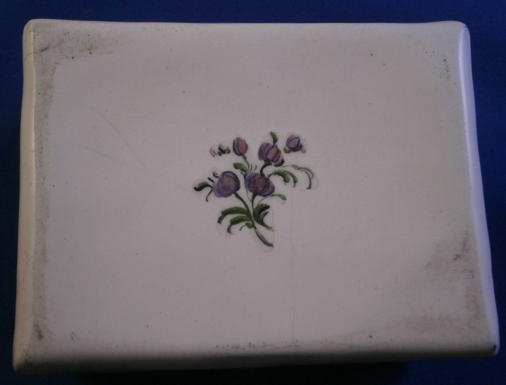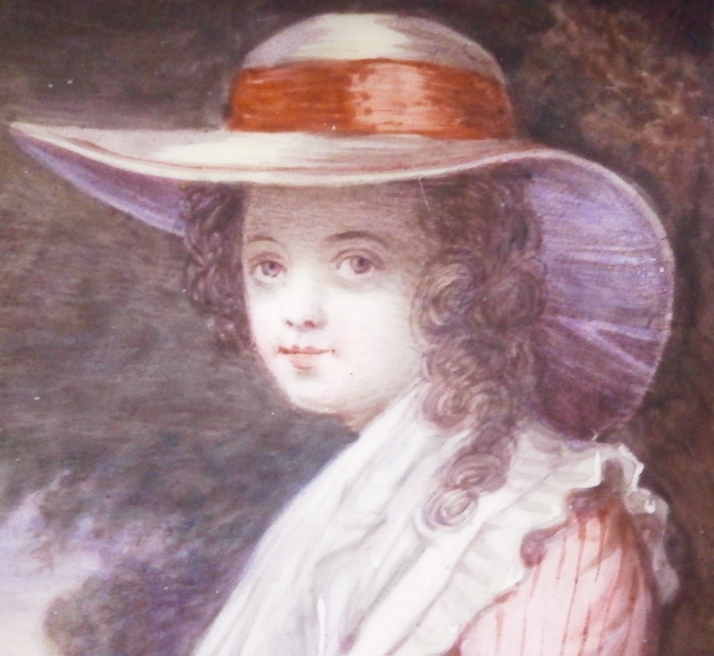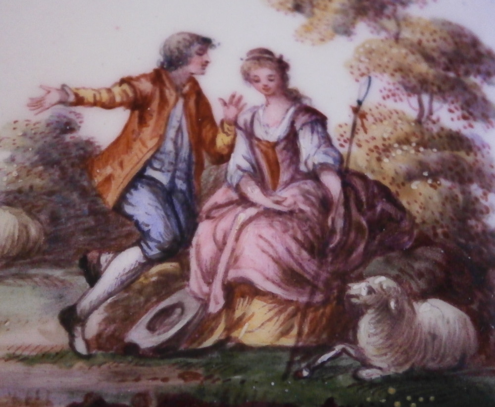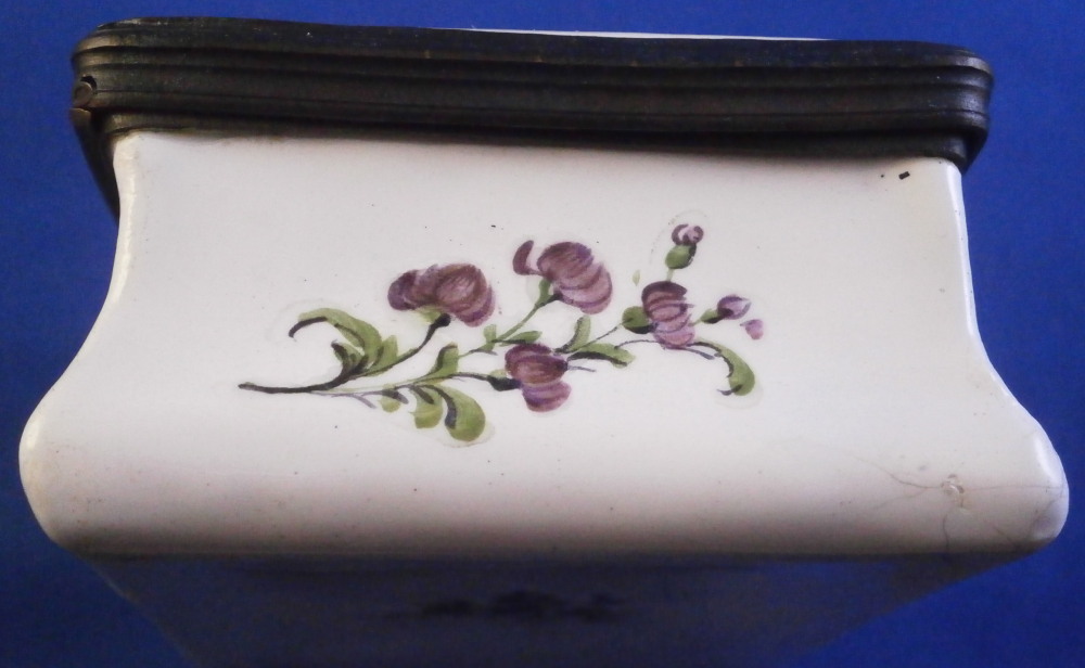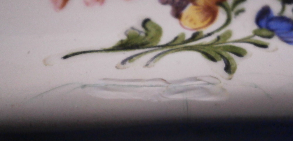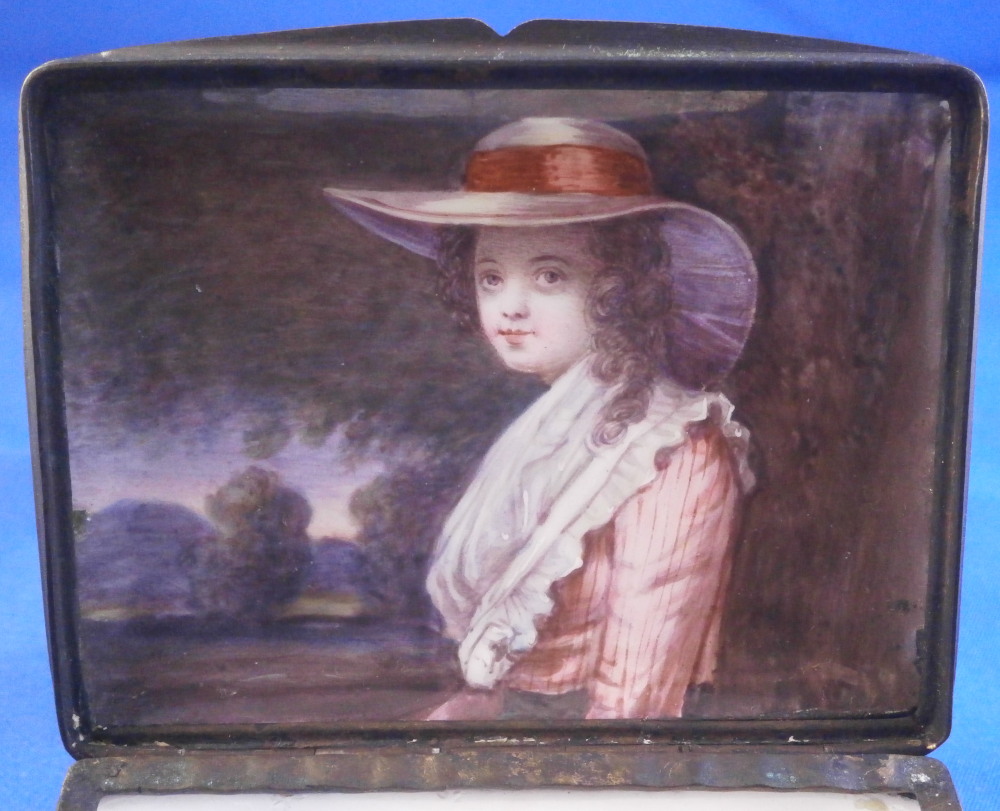 This is a nice larger box made in England - probably in the South Staffordshire region - in the late 18th century. Probably in the Bilston area or possibly Birmingham or even London but definitely English from the 1700s. They are famous for their Battersea enamel boxes, etc. Not sure if this would be considered a patch box or tabatiere / snuff / pill box but either way it is a fun piece! Larger than many one sees. The box is decorated on the outside lid with a superb hand painted Watteau style scene to the top including a couple in a landscape surrounding with some sheep. A very well done scene! The sides of the box each have flowers to them - a nice floral arrangement to the front and back with smaller single flowers to the sides. The udnerside has a little flwoer to it as well. My favorite part however is the portrait of a lady to the inside lid. it is very nicely painted with the lady wearing a pink top with a white lace blouse and a large hat with a bit of a landscape surrounding in the background. The metal mounts are copper I believe though heavily tarnished from age which is the norm.. The box is in great condition - it displays perfectly but has some minimal damage to the corners and an area on the back side where the enamel must have been lost which was painted over white to hide it well. I think one of the corners was worked on as well but it is hard to tell. General wear on the bottom from age. Either way in better condition than most one comes across and off a nice size with some really nice decorations to it. The lid closes well and stays shut. All in all a great example! The box is 1.5 inches tall, just under 3.5 inches wide and 2.625 inches deep. Please email me for more information or other pictures.