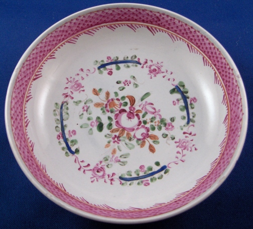 This is a superb Pearlware cup and saucer most likely made in the Staffordshire region of England and certainly in the late 18th century. It is of very high quality - much nicer than most examples I have seen over the years being decorated with a handpainted fancy floral decoration as well as a nice pink trim to the rims. The set looks quite elegant in person and resembles porcelain which it was meant to imitate quite nicely and better than the usual examples. The set is in great condition with four very minor munchers on the top rim of the cup - more glaze flaws than anything else. Also a manufacturing flaw on the inside of the bowl but this is under the glaze and not real issue. The saucer also has 4 tiny rim issues just as minor as those of the cup and pretty much meaningless. The set displays superbly! Neither piece is marked but that is normal for this type of item during this period. There is an old paper label underneath. The cup is 1.875 inches tall and has a diameter of 3.25 inches and the saucer is 1.25 inches tall and has a diameter of 5 inches. Please email me for more information or other pictures.