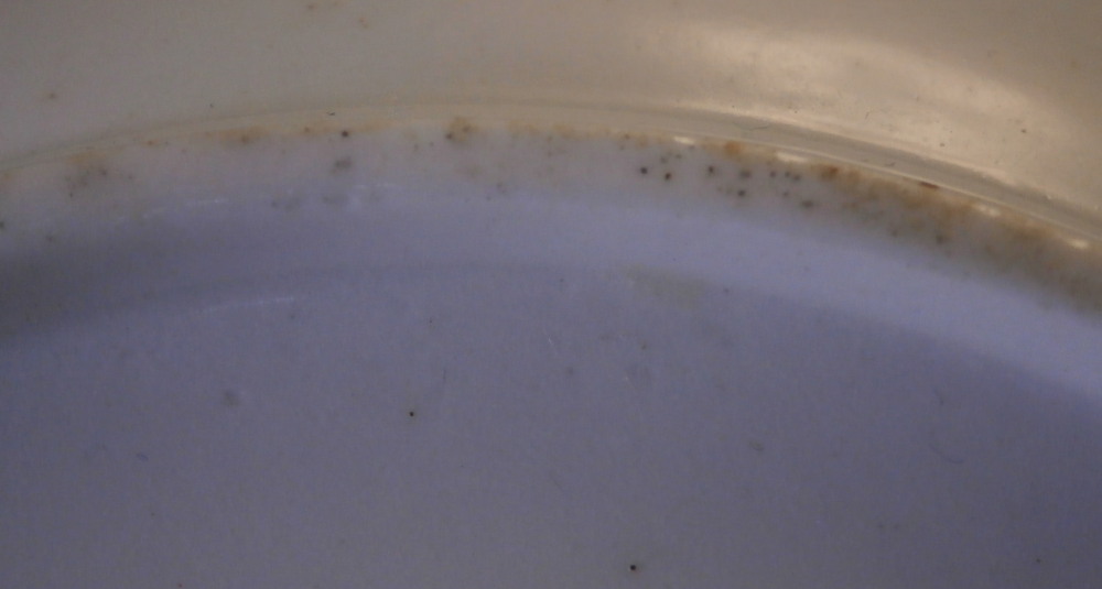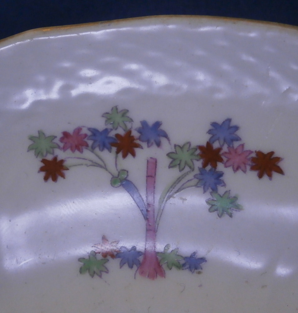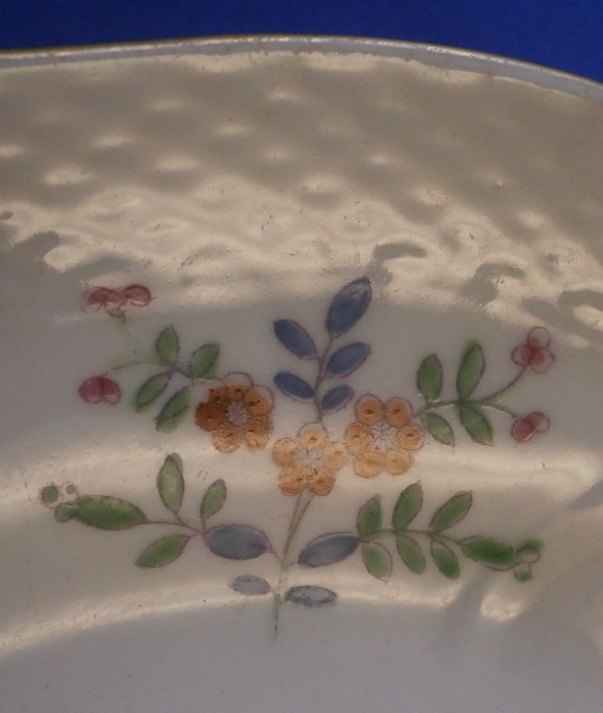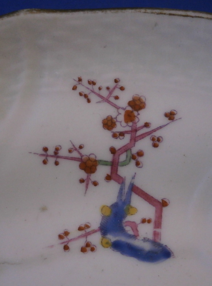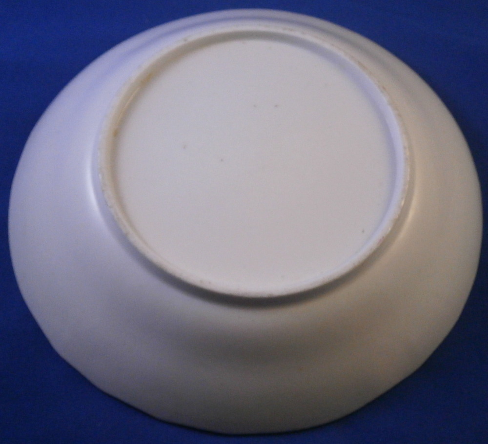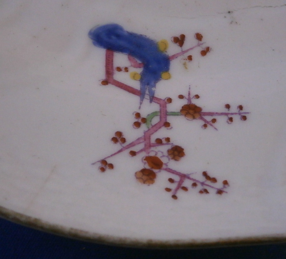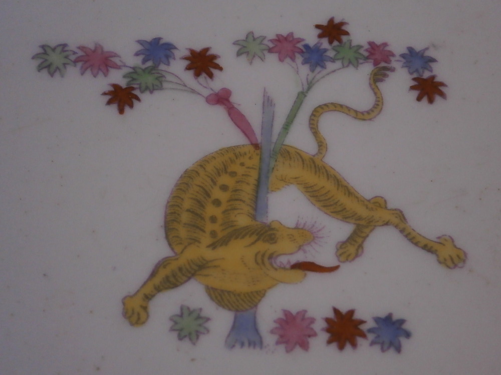 This is an interesting English saucer that is a bit of a mystery to me as to who made it. Definitely made in England and probably late 18th century to early 19th century. The design is called the yellow Tiger pattern and it off course is heavily influenced by a Meissen design. The saucer is rather deep. The footring is glazed. It was sold as Caughley but unless it was made after Coalport bought them out it does not strike me as having been done by them. The deepth of the saucer points to possibly Chamberlain or one of the Rockingham / Daniel / Ridgway factories but I cannot pinpoint any one maker. Nothing like it in my books nor online. So if anyone out there has more of a clue a quick note would be appreciated. EIther way it is a nice saucer with a nice rim relief design to it. The outlines of the designs are printed with the color painted in. There is the yellow tiger in the center wrapped around some bamboo as well as four other designs around the rim. Gold trim to the edge. It's a nice saucer. In good condition with some paste flaws and a touch of wear mainly to the high points of the gold trim and to the blue section of one of the rim designs as shown. The dish is 1.375 inches tall with a diameter of 6.375 inches. Unmarked so that is of no help. Please email me for more information or other pictures.