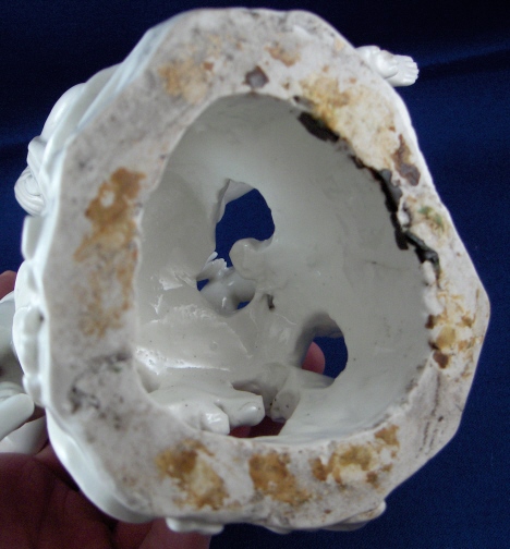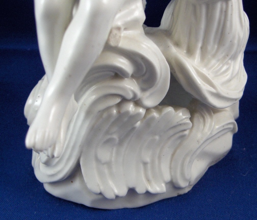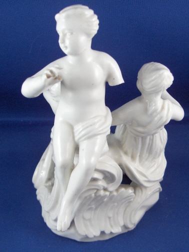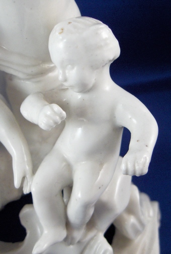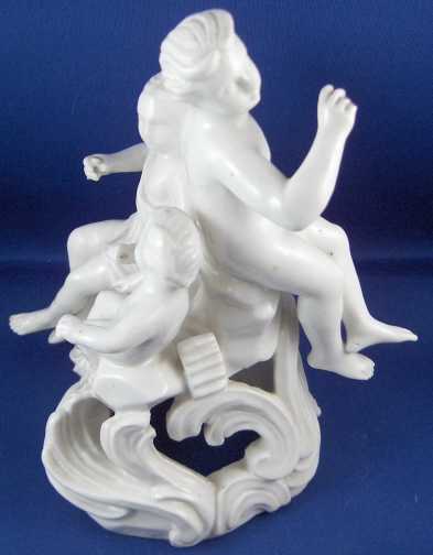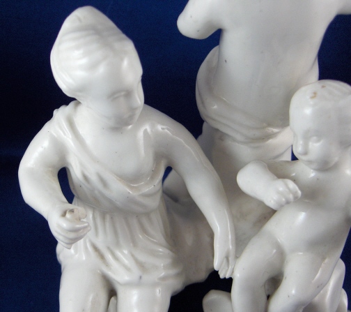 This is a figurine made by Este in about 1780. It is of a family sitting on some scroll work that is just amazing. A little one, his mother and the dad on the other side. The figurine is in great condition considering the age and how all the arms and feet stick out. The father has lost one arm but since he faces the back it is not obvious at all. The mom has lost whatever she was holding in her right hand and a tiny chip to one toe. The father has one finger missing on the other hand and two chipped fingers. He might have been holding something on the missing hand that connected to the base behind his knees but one can only guess. Some black firing marks here and there. The figure is unmarked which is not unusual at all during this time period and is 7.25 inches tall, 5 inches wide and 6.5 inches deep. Please email me for more information or other pictures.