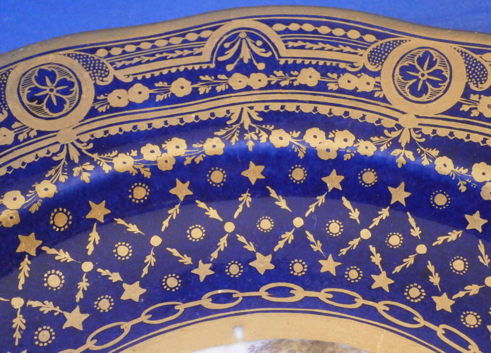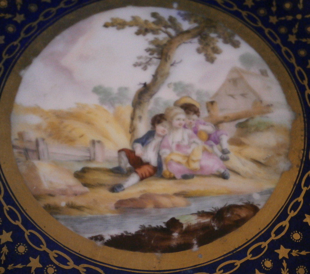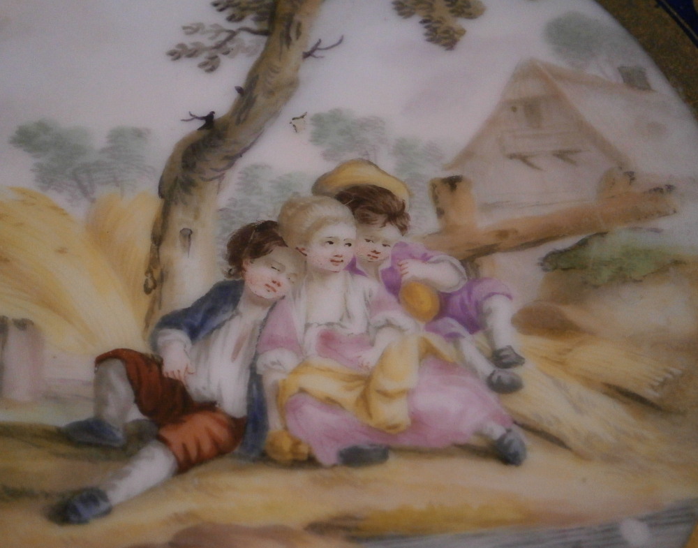 This is a really superb plate made by Faubourg St.-Denis of the Paris region of France in the later 18th century. The factory was founded by Peter Anton Hannong and it was under the protection of Charles Philippe Comte d'Artois. This is as nice a plate as I have ever seen by them. A superb example of what they could do! Schoelcher owned a factory here later on and this piece matches that quality or even that of Darte Freres. The plate is nicely hand painted with top quality scene in the center including three children sitting under a tree in a landscape surrounding including a house and fence in the background and a small stream in front. The rest of the plate has that amazing dark cobalt blue ground to it and lots and lots of fancy gilding. That blue and gold combo is always stunning! The plate is in superb condition with just a touch of wear to the scene and gold ring right around the scene but amazingly that fancy gold trim is all in perfect shape!The piece displays superbly! The piece is marked with a gold CP under a crown mark as shown. The dish is 1.125 inches tall and 9.25 inches in diameter. Please email me for more information or other pictures.