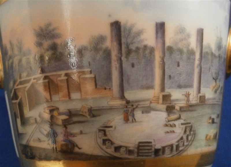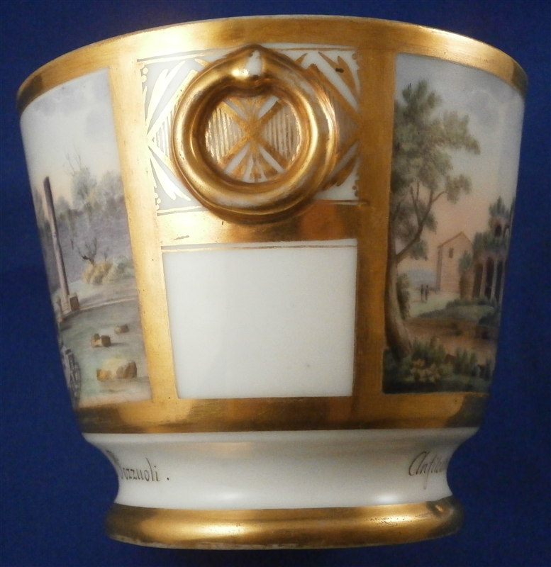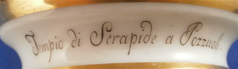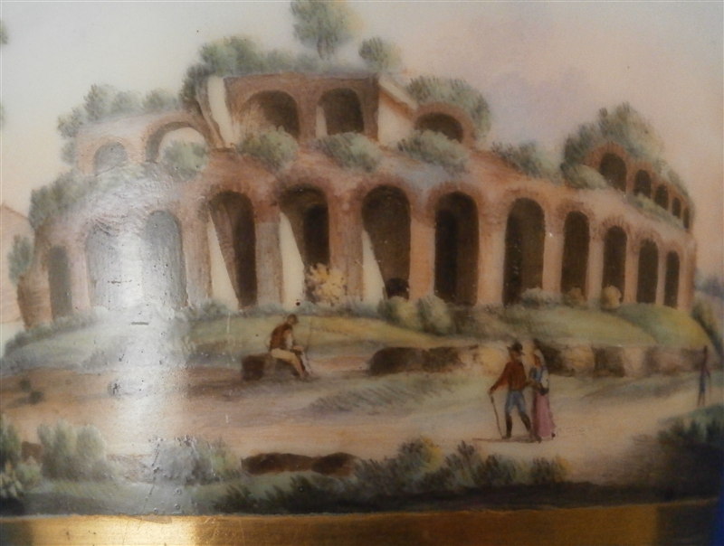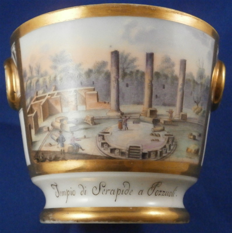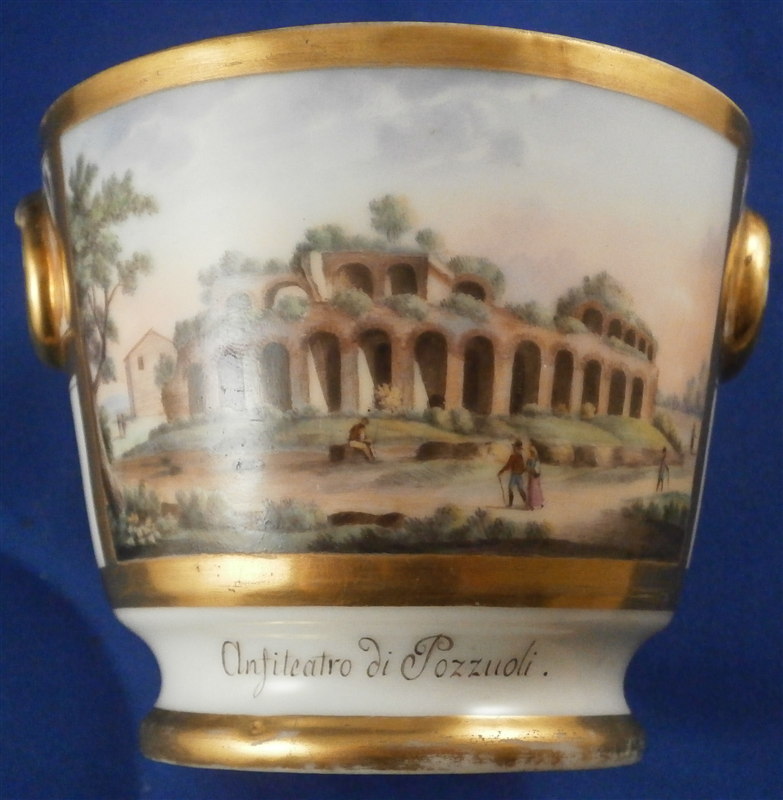 This is a rare sugar dish and its lid made in Naples , Real Fabbrica Ferdinandea in about 1790. The Capodimonte factory existed near Naples from 1743 until 1759. It had little to do with the Naples factory which was founded by Ferdinand IV in 1771 and was around until 1806 when the French occupied it and after that the molds, etc. were sold all over the place. The sugar pot is made of soft paste porcelain and is hand painted with two superb scenes of ruins in Italy both of which are labeled underneath. One is the Anfiteatro di Pozzuoli aka the Flavian Amphitheater in Pozzuoli and the other is the Tempio di Serapide a Pozzuoli aka the Macellum of Pozzuoli which was a market building during Roman times. When first excavated during the 18th century it was misidentified as the Temple of Serapis hence the title on this sugar dish which is kind of neat. The scenes are of superb quality! The sides of the dish have ring handles with a bit of gold trim by them that matches that of the lid. More gold trim around the scenes and the edges as shown. The lid has a nice gold trim and gilded finial. The set is in perfect condition with a bit of wear to the gilding and a factory flaw to the inside as shown. The sugar dish is marked with a version of their under glaze blue N under a crown often used by other makers but originally used by Naples as is the case on this set. The piece and its lid are 5 inches tall and 4.125 inches in diameter. Please email me for more information or other pictures.