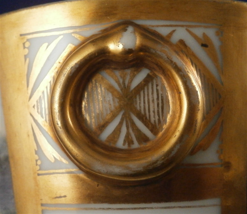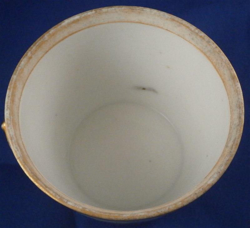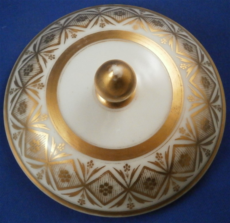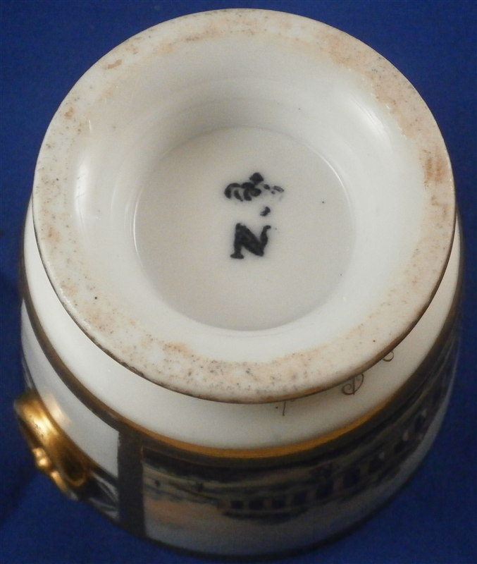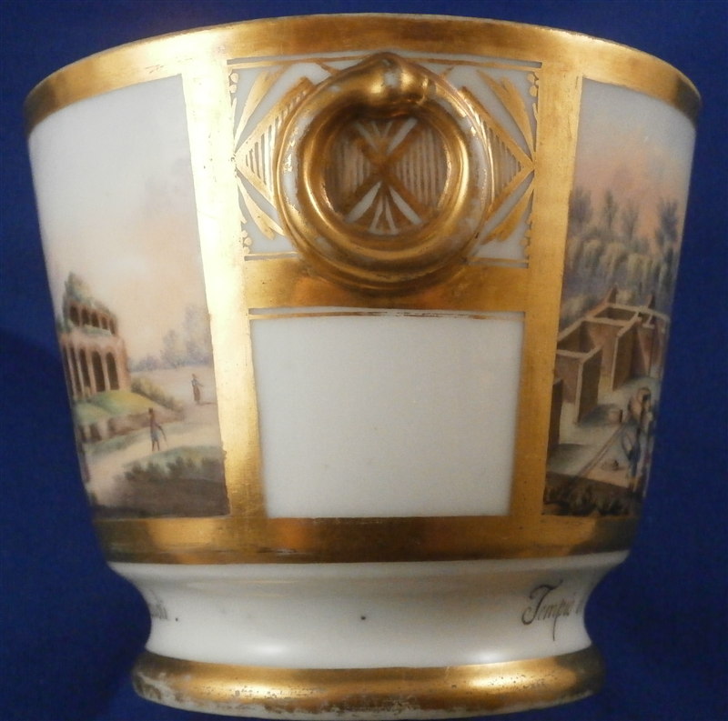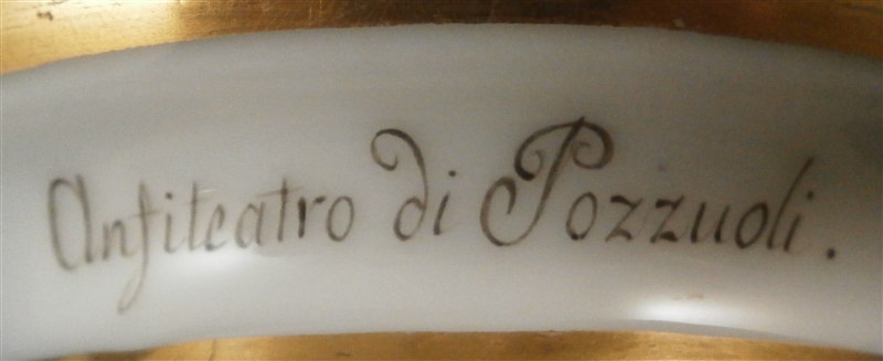 This is a rare sugar dish and its lid made in Naples , Real Fabbrica Ferdinandea in about 1790. The Capodimonte factory existed near Naples from 1743 until 1759. It had little to do with the Naples factory which was founded by Ferdinand IV in 1771 and was around until 1806 when the French occupied it and after that the molds, etc. were sold all over the place. The sugar pot is made of soft paste porcelain and is hand painted with two superb scenes of ruins in Italy both of which are labeled underneath. One is the Anfiteatro di Pozzuoli aka the Flavian Amphitheater in Pozzuoli and the other is the Tempio di Serapide a Pozzuoli aka the Macellum of Pozzuoli which was a market building during Roman times. When first excavated during the 18th century it was misidentified as the Temple of Serapis hence the title on this sugar dish which is kind of neat. The scenes are of superb quality! The sides of the dish have ring handles with a bit of gold trim by them that matches that of the lid. More gold trim around the scenes and the edges as shown. The lid has a nice gold trim and gilded finial. The set is in perfect condition with a bit of wear to the gilding and a factory flaw to the inside as shown. The sugar dish is marked with a version of their under glaze blue N under a crown often used by other makers but originally used by Naples as is the case on this set. The piece and its lid are 5 inches tall and 4.125 inches in diameter. Please email me for more information or other pictures.